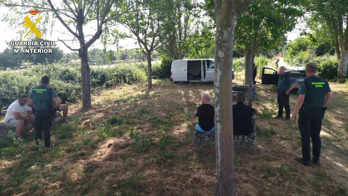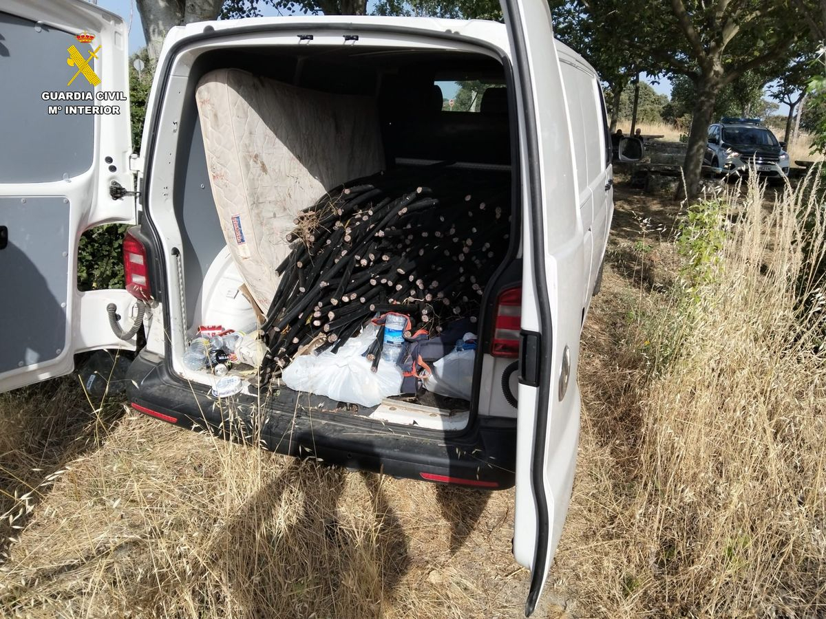 Junto al vehículo, los guardias civiles descubrieron a los ocho varones durmiendo, lo que levantó las sospechas de que podrían estar evadiendo la acción policial tras cometer un hecho delictivo. Al inspeccionar la furgoneta, los agentes confirmaron sus presunciones: en el interior hallaron una gran cantidad de cable de cobre, que indiciariamente procedía de líneas aéreas de telecomunicaciones de la zona.