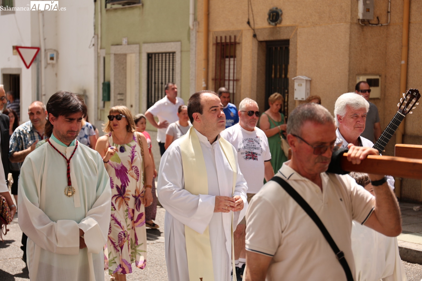 La procesión partió desde la parroquia, seguida por cofrades, niños de comunión, autoridades locales y numerosos vecinos que quisieron participar en esta cita religiosa. La imagen fue llevada en andas por los fieles, mientras se entonaban cánticos tradicionales y se lanzaban pétalos al paso del cortejo.
