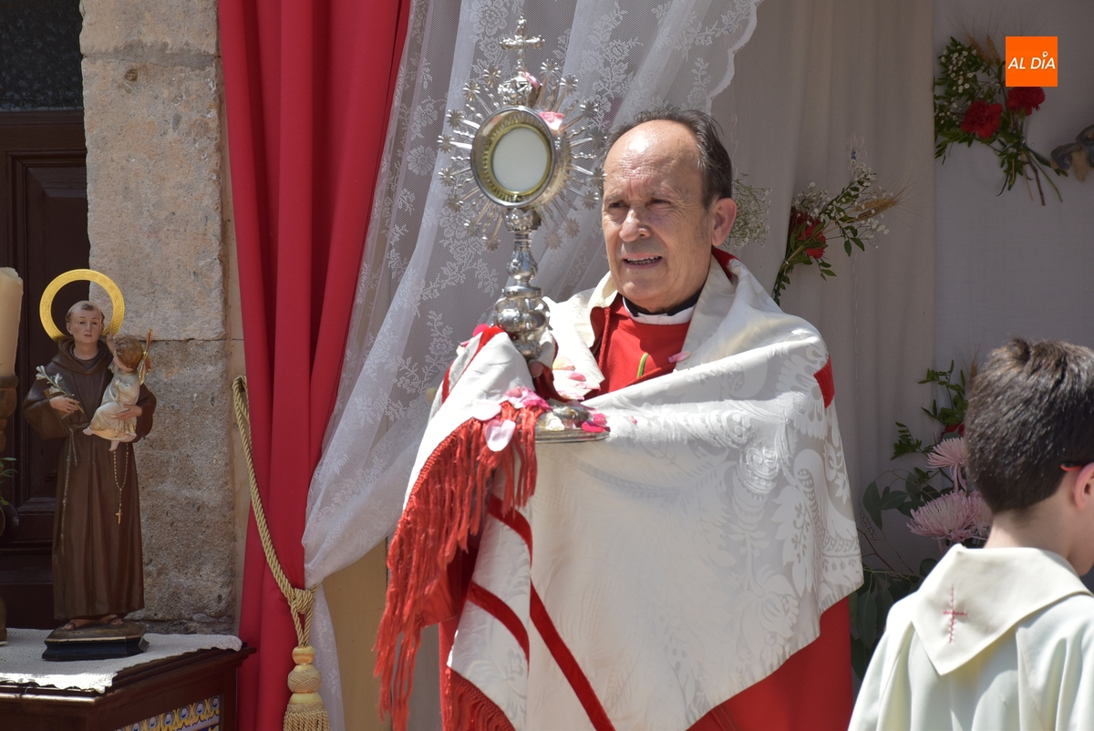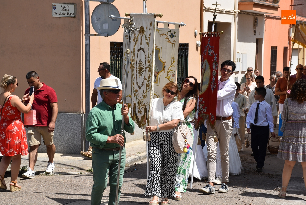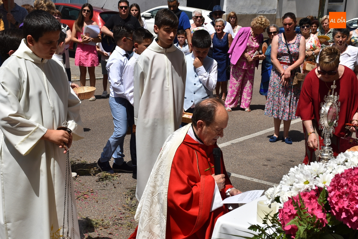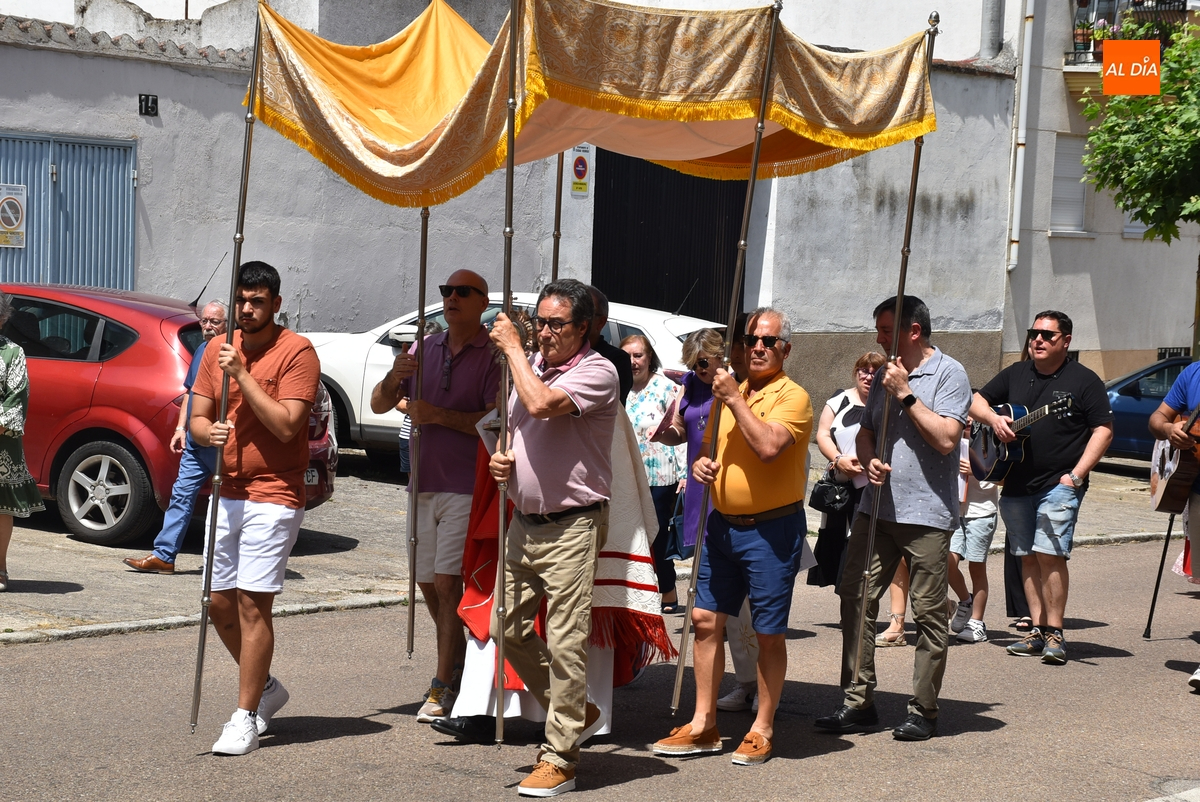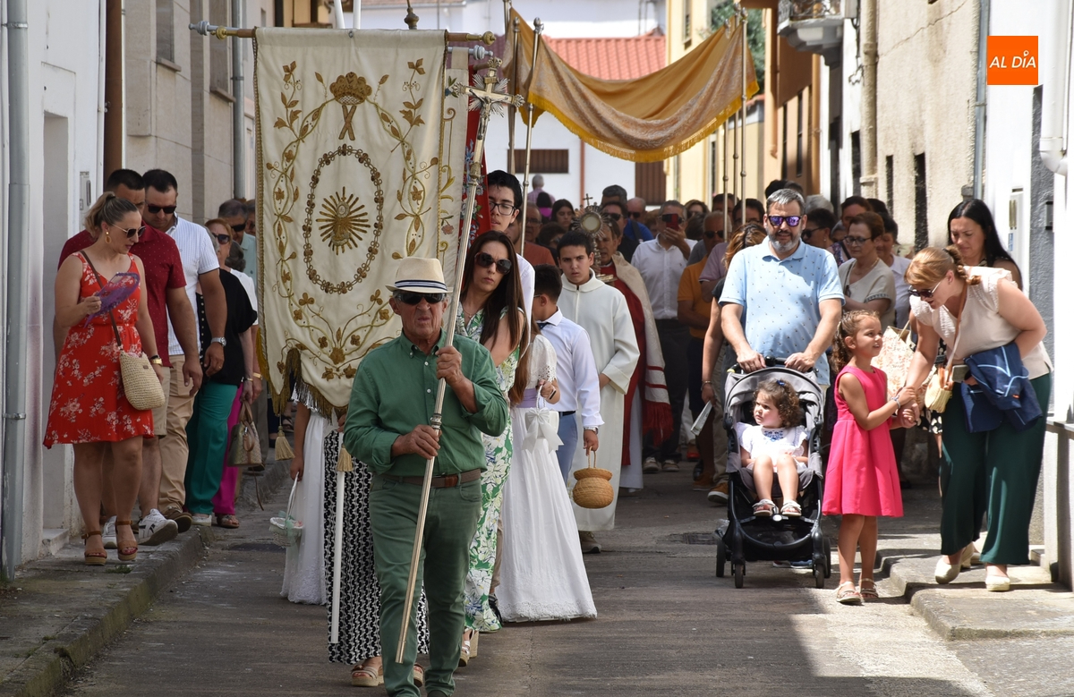 Esta procesión tuvo lugar a la conclusión de la eucaristía que ofició al mediodía en el templo el párroco Tomás Muñoz Porras, contándose con la animación musical del Coro de la Parroquia, que también se encargó de acompañar con sus cánticos el citado desfile (abierto por varios estandartes), durante el cual el Santísimo visitó tres altares, todos ellos bastante cuidados, como se puede ver en las imágenes.