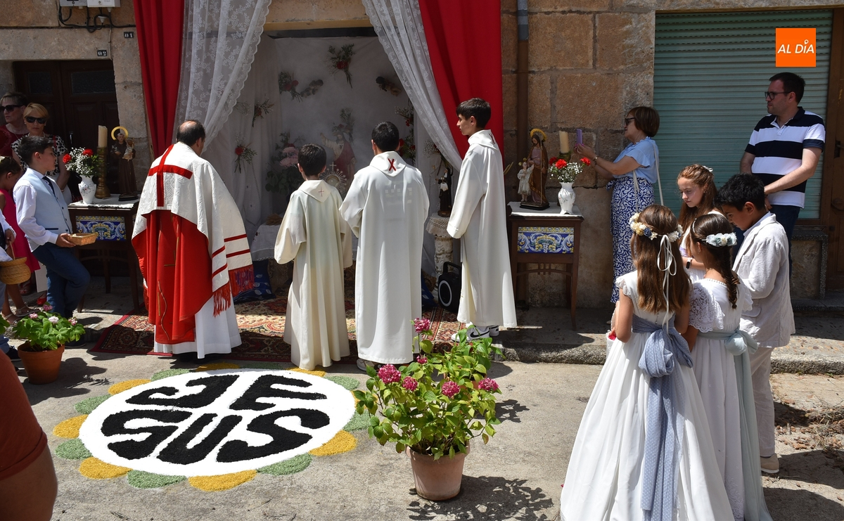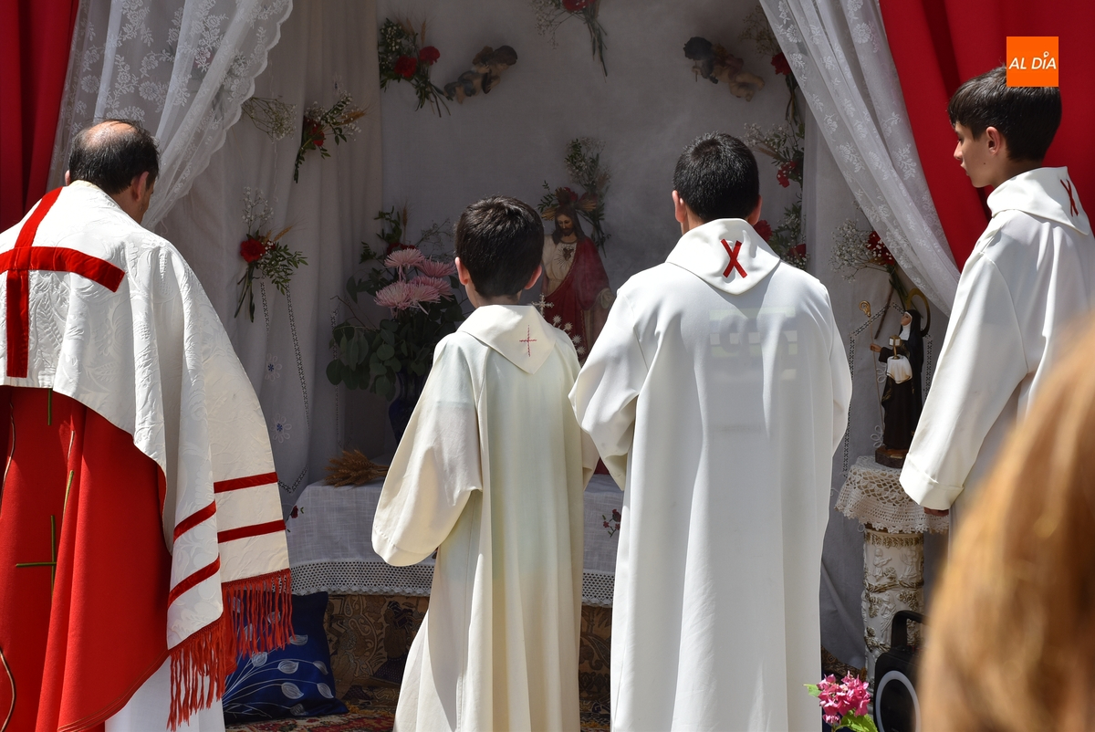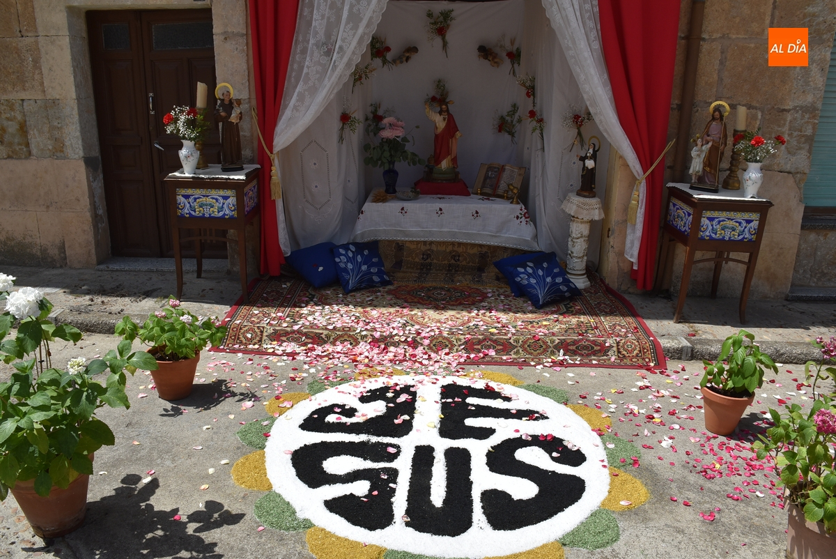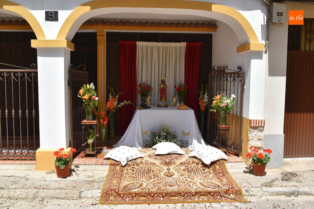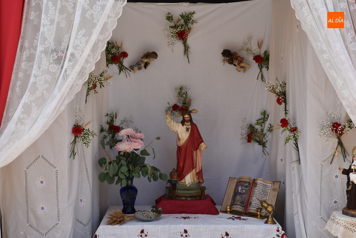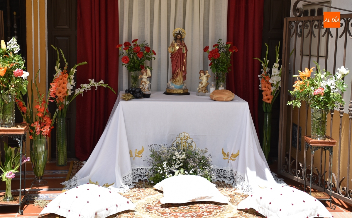 El primero de ellos estuvo situado en unos soportales de la calle Caños, por donde la procesión salió a la calle Mateo Hernández Vegas, donde se encontraba el segundo altar, que estaba presidido por la imagen de la Virgen de la Medalla Milagrosa. Por la calle Ruesga, se regresó a la calle San Antón, donde se había montado como es habitual enfrente de la Parroquia un destacado altar, que este año contaba con una alfombra florida con la leyenda Jesús.