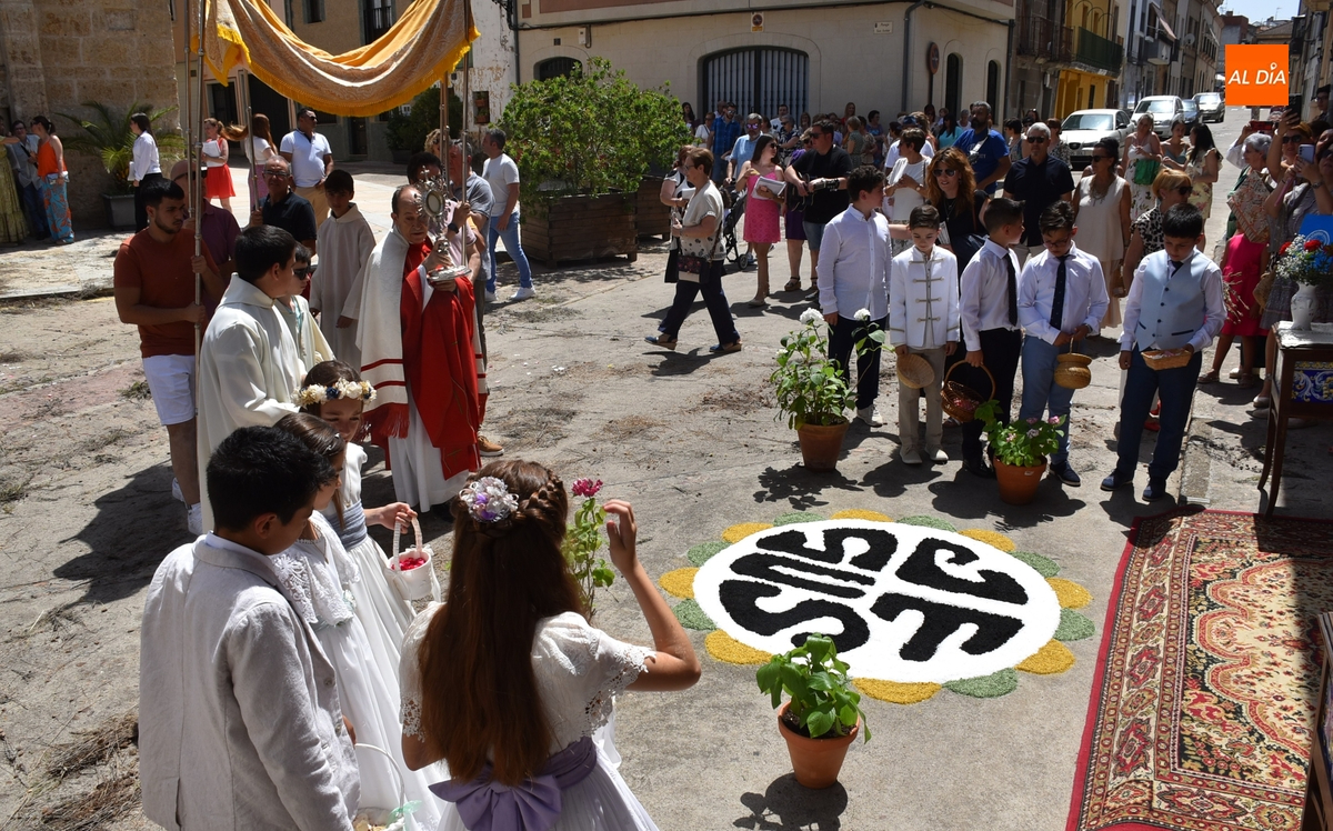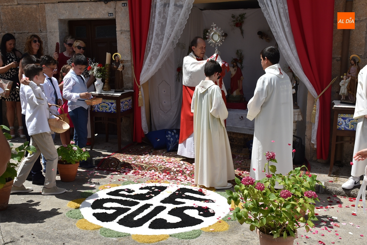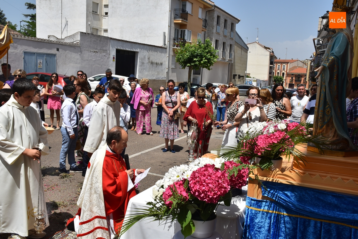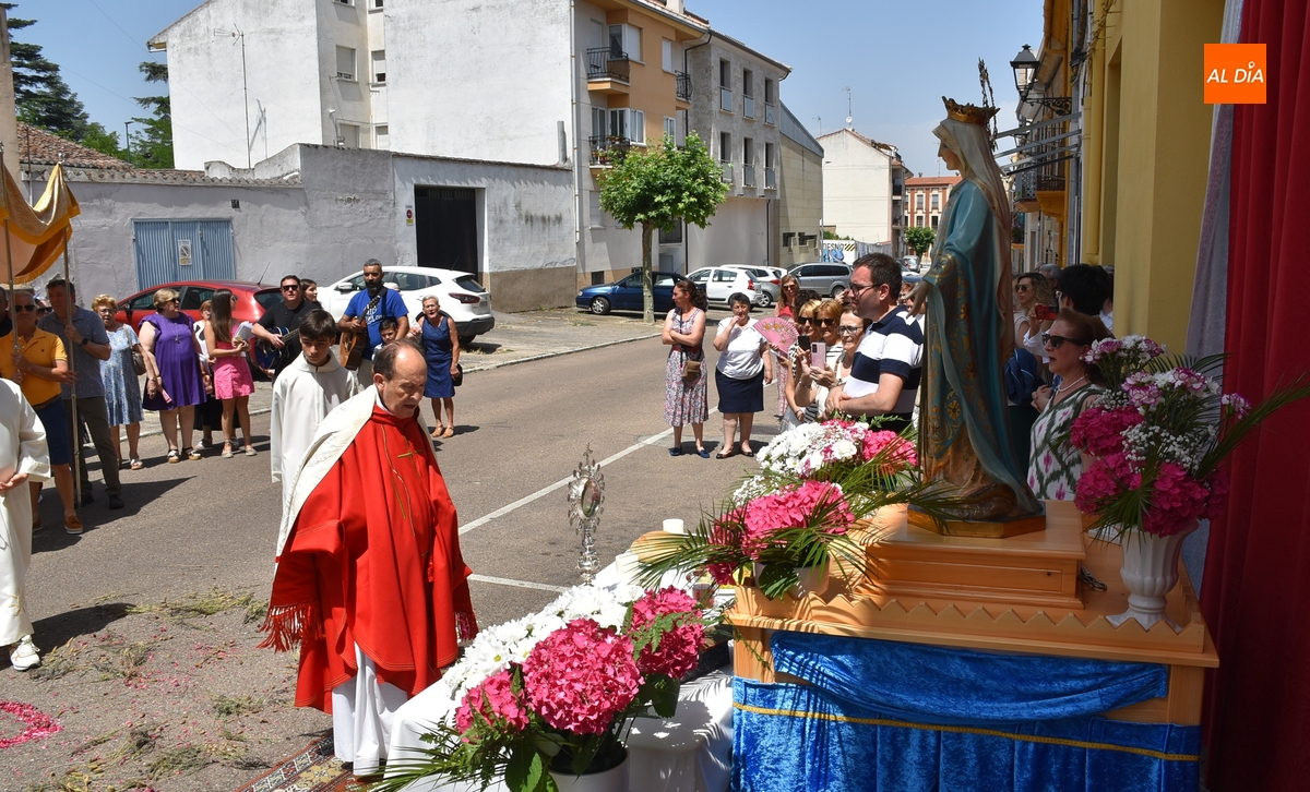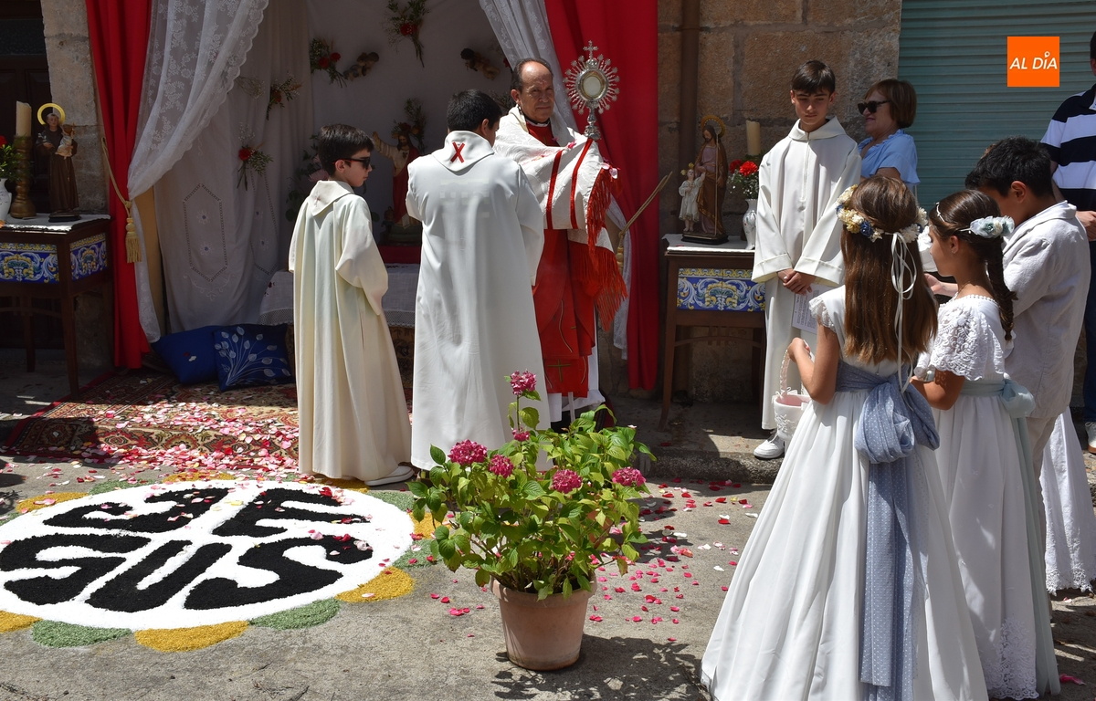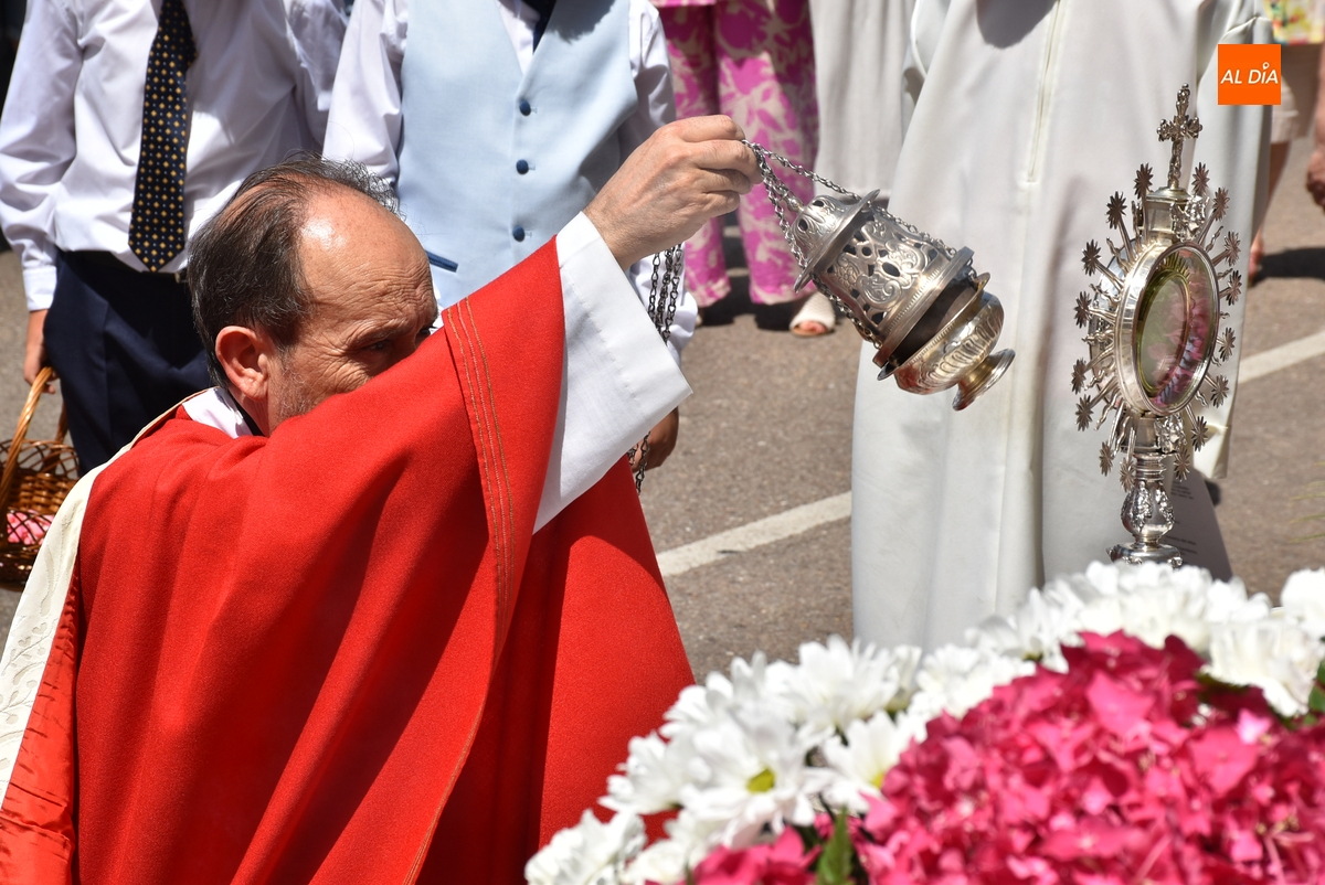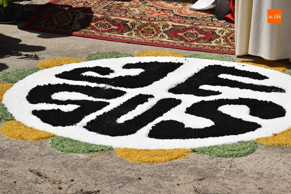 El primero de ellos estuvo situado en unos soportales de la calle Caños, por donde la procesión salió a la calle Mateo Hernández Vegas, donde se encontraba el segundo altar, que estaba presidido por la imagen de la Virgen de la Medalla Milagrosa. Por la calle Ruesga, se regresó a la calle San Antón, donde se había montado como es habitual enfrente de la Parroquia un destacado altar, que este año contaba con una alfombra florida con la leyenda Jesús.