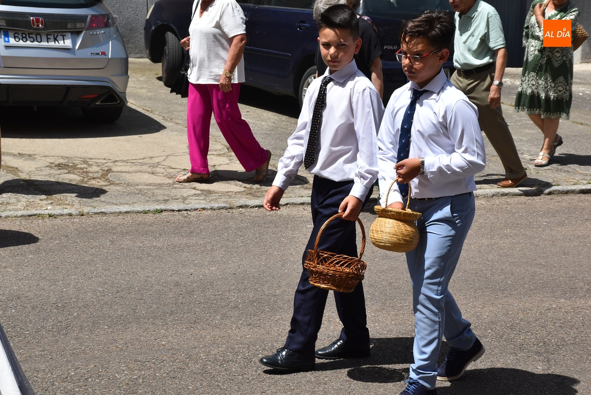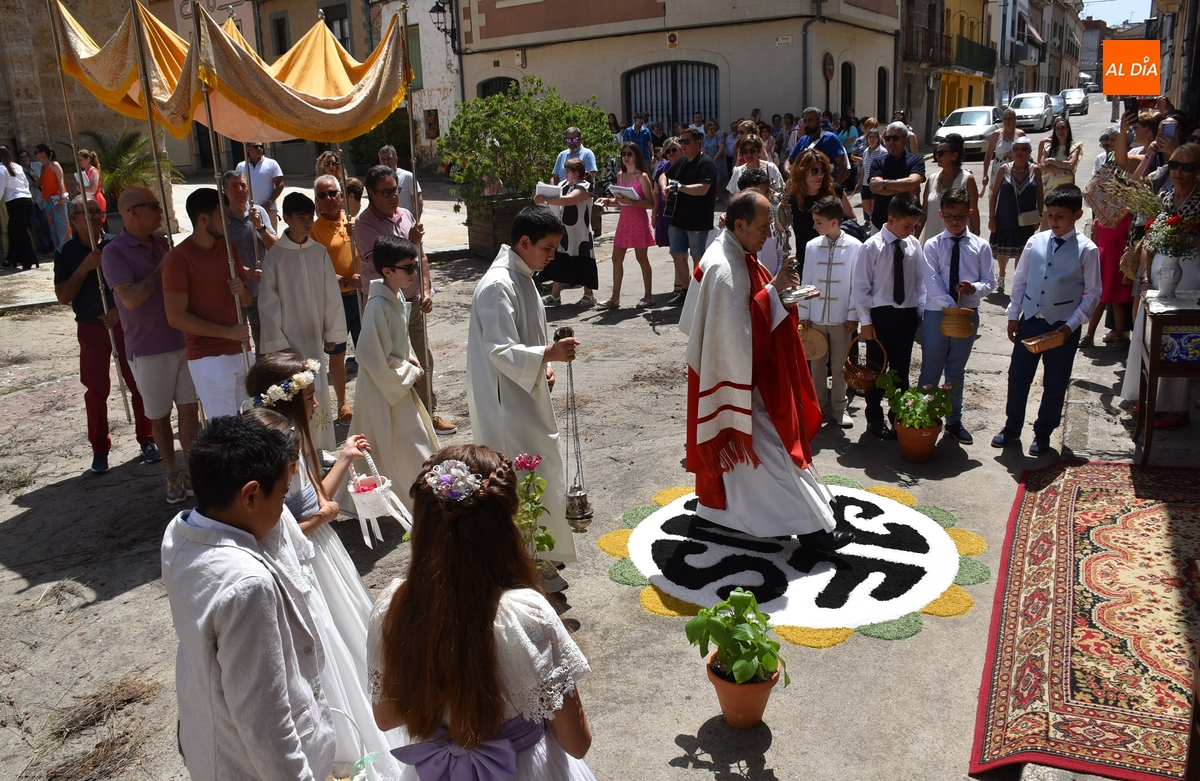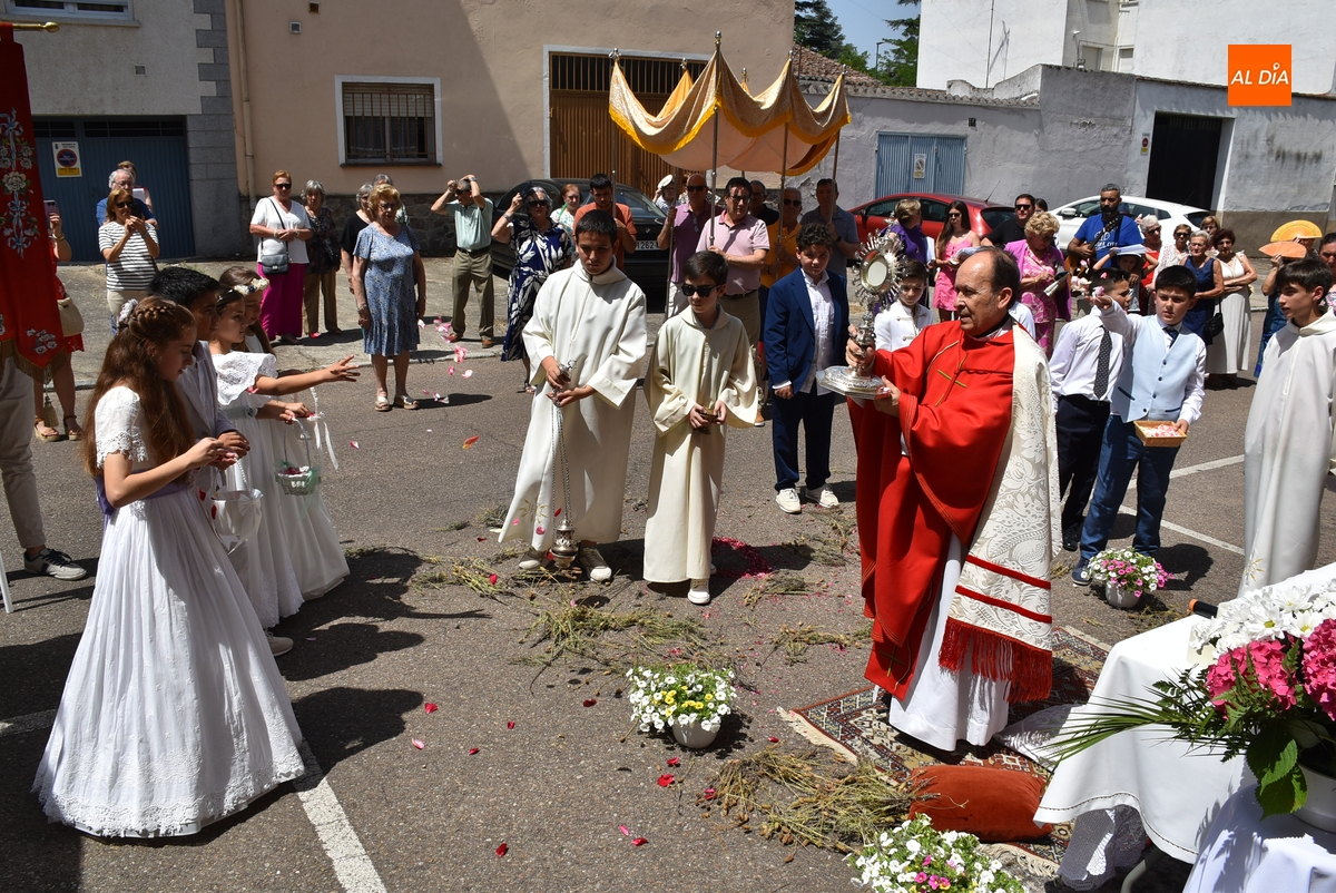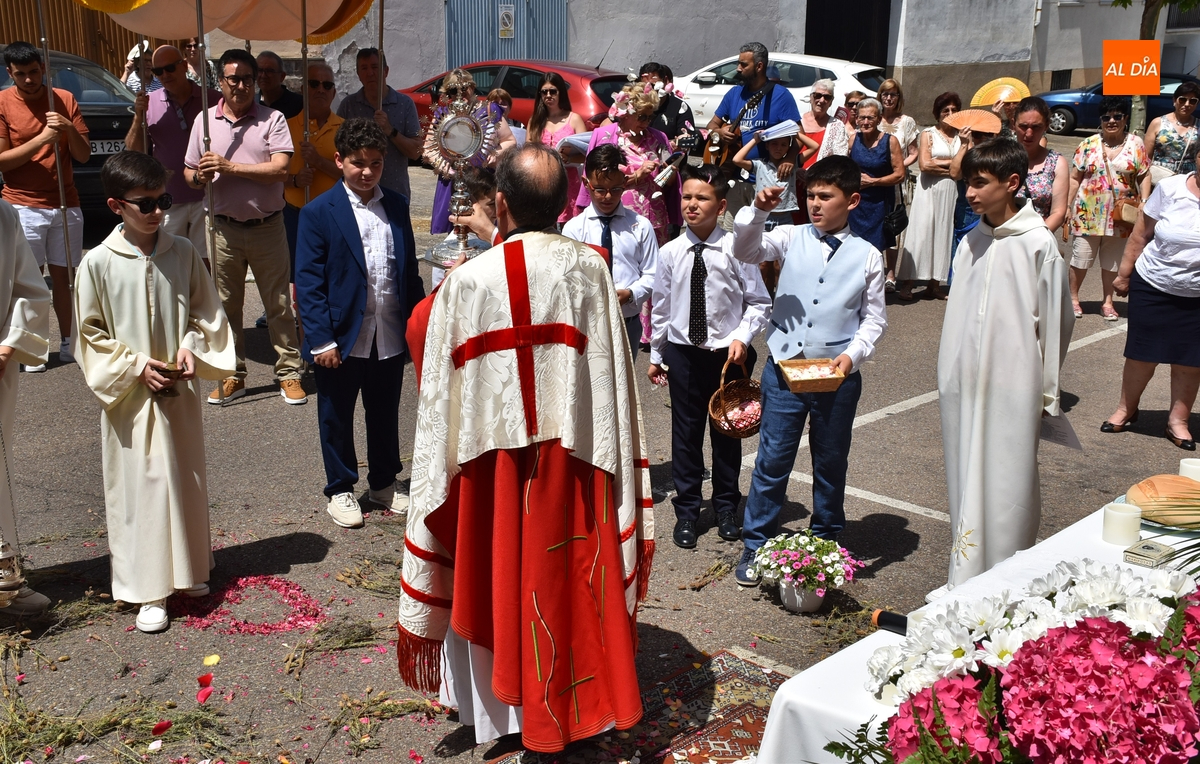 En cada altar, Tomás Muñoz Porras depositó durante unos instantes el Santísimo, con el cual procedió a continuación a bendecir a los presentes, entre los que se encontraban 9 niñ@s que han tomado la Primera Comunión durante esta primavera en esta Parroquia. Como es tradición, estos niñ@s se encargaron de lanzar a la custodia pétalos, que quedaron repartidos por el suelo junto al numeroso tomillo que había sido esparcido previamente por las calles.