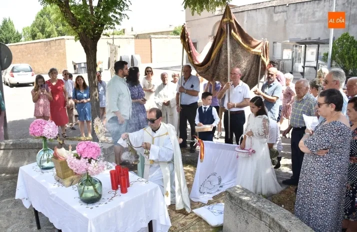Esta salida del Santísimo a las calles de San Cristóbal estuvo acompañado por dos niños que han tomado la Primera Comunión durante esta primavera, que fueron lanzando pétalos a la custodia, así como por una bandera del grupo de Adoración Nocturna de Ciudad Rodrigo, que se inclinó en cada uno de los altares. De regreso al templo, el Santísimo quedó expuesto para ser adorado por todos aquellos que quisieran hasta las 18.00 horas, momento en que se producirá su reserva tras llevarse a cabo el rezo de Vísperas.