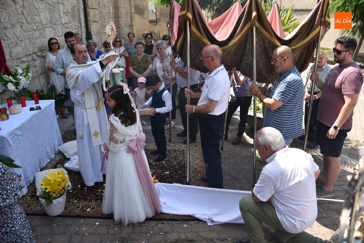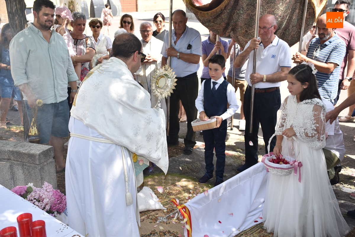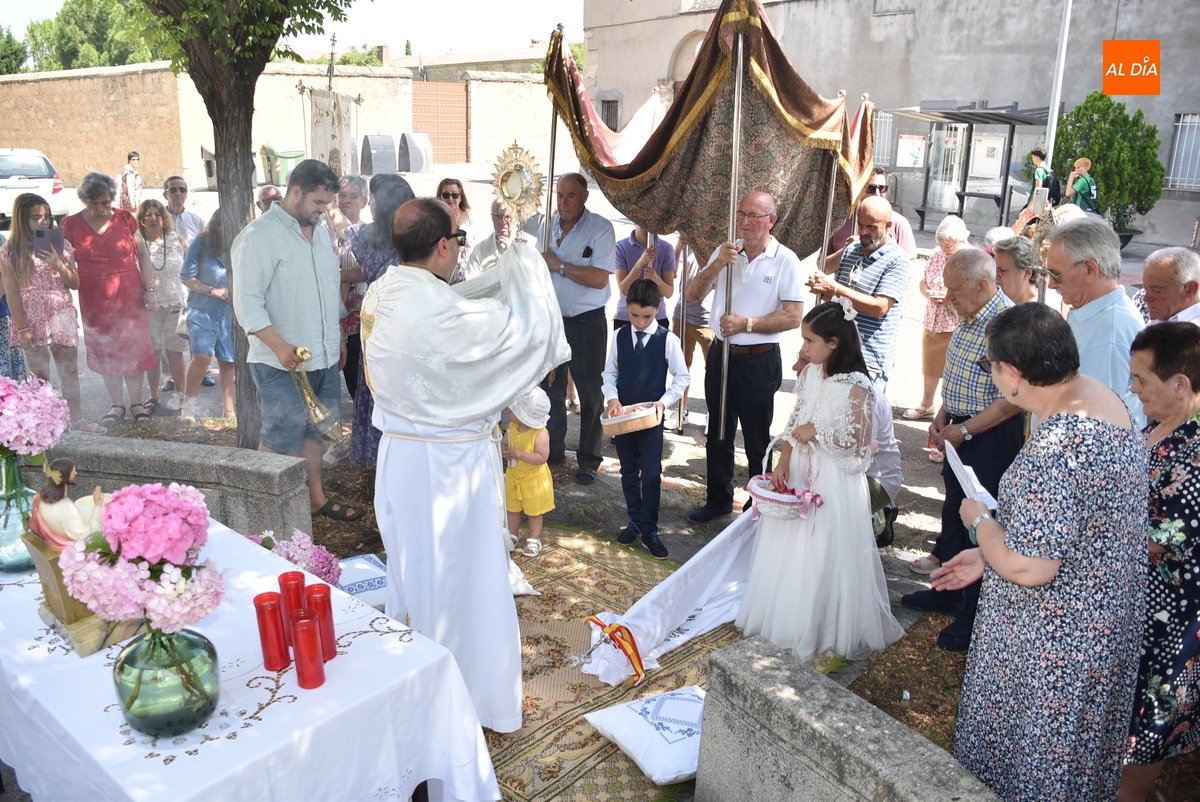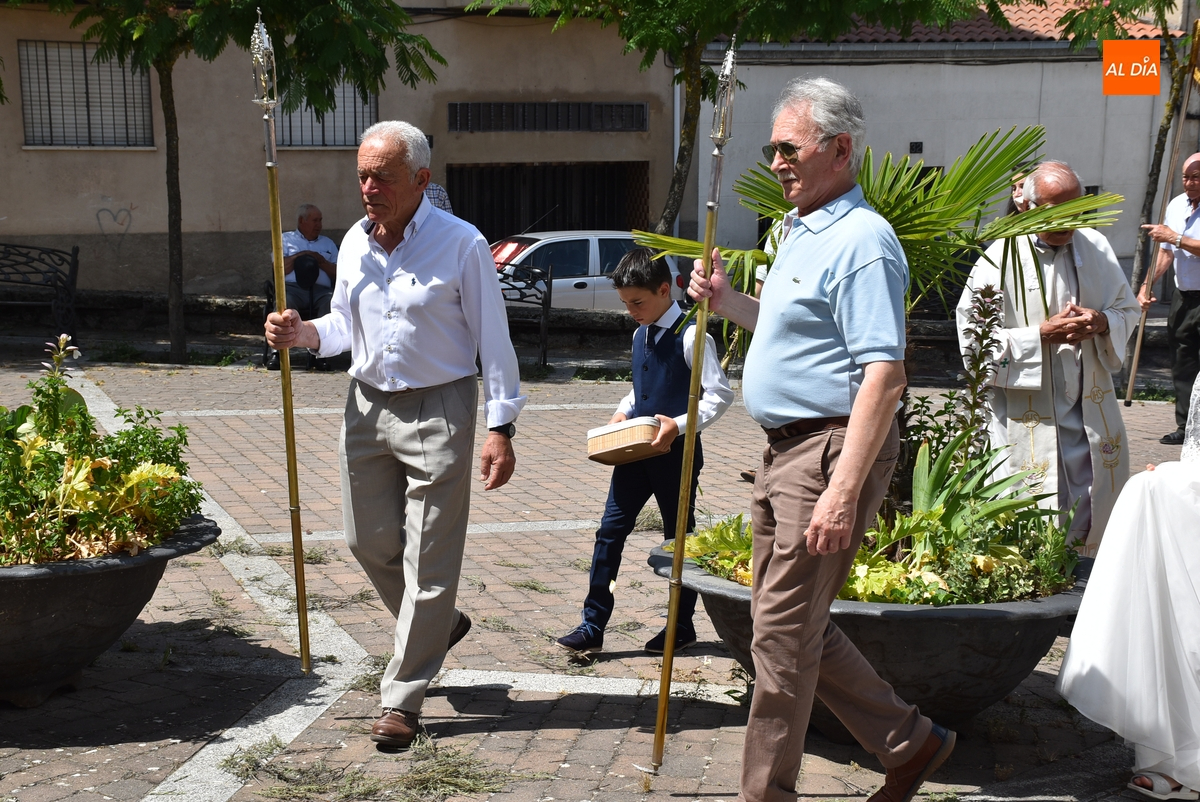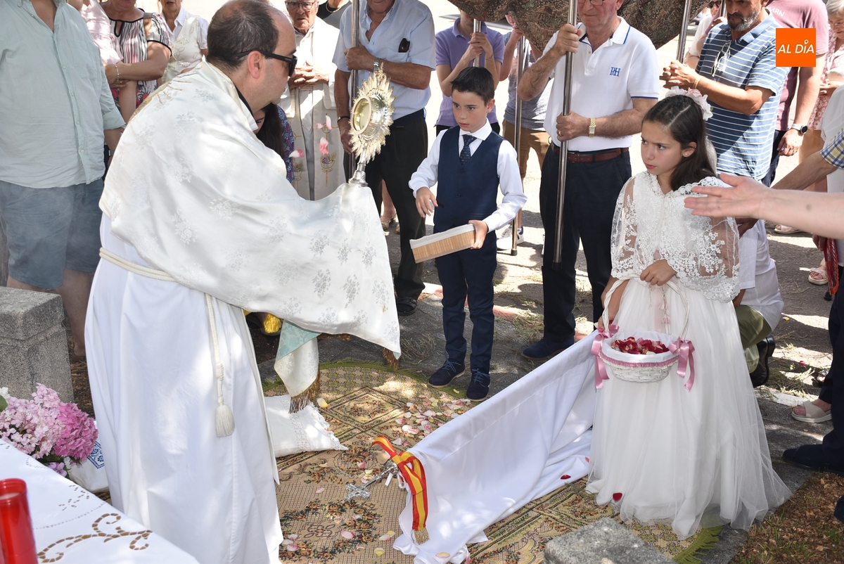 Esta salida del Santísimo a las calles de San Cristóbal estuvo acompañado por dos niños que han tomado la Primera Comunión durante esta primavera, que fueron lanzando pétalos a la custodia, así como por una bandera del grupo de Adoración Nocturna de Ciudad Rodrigo, que se inclinó en cada uno de los altares. De regreso al templo, el Santísimo quedó expuesto para ser adorado por todos aquellos que quisieran hasta las 18.00 horas, momento en que se producirá su reserva tras llevarse a cabo el rezo de Vísperas.