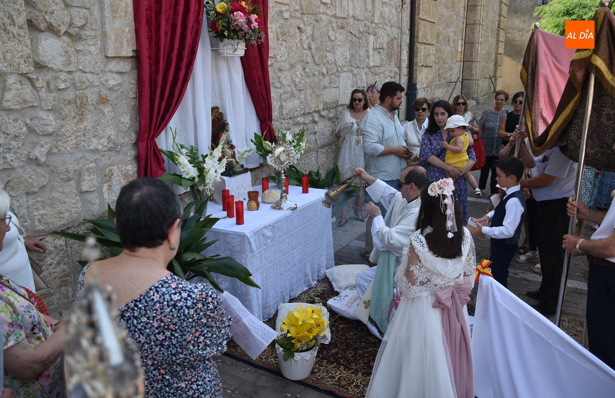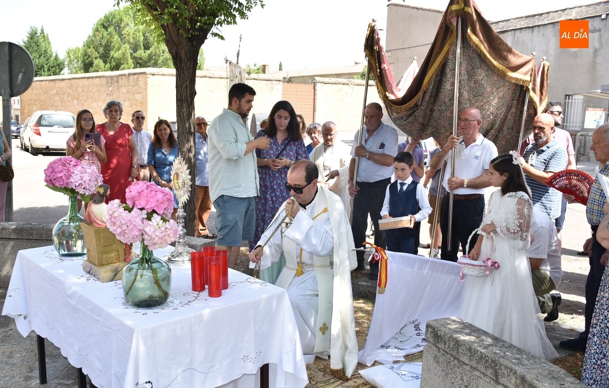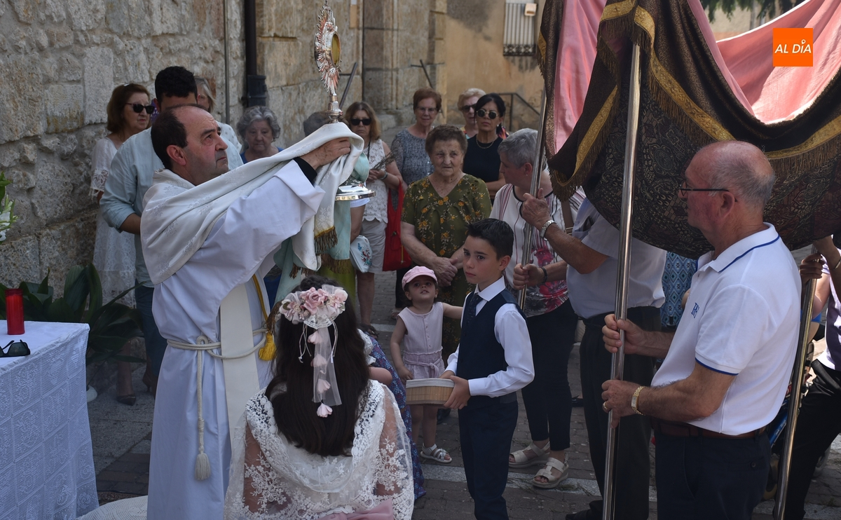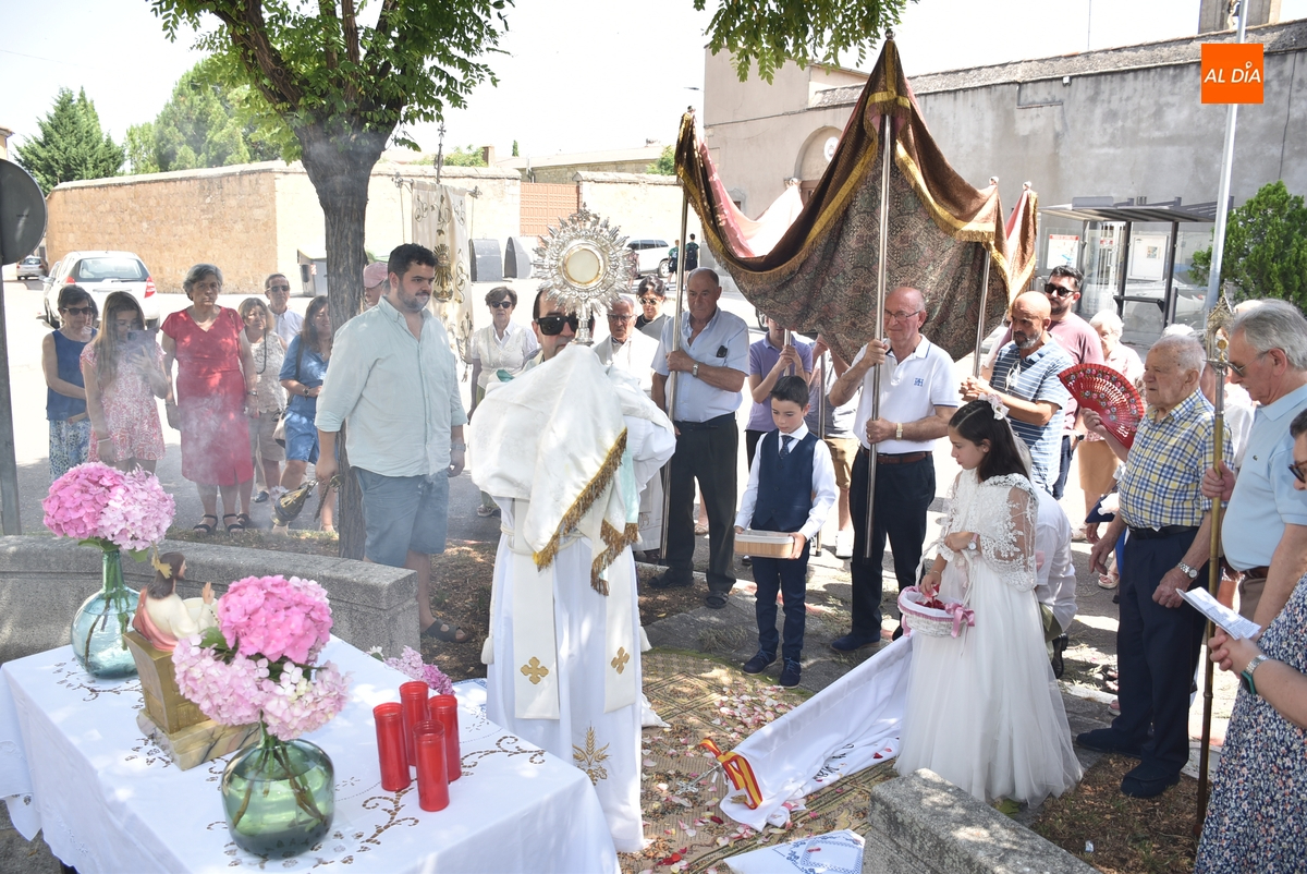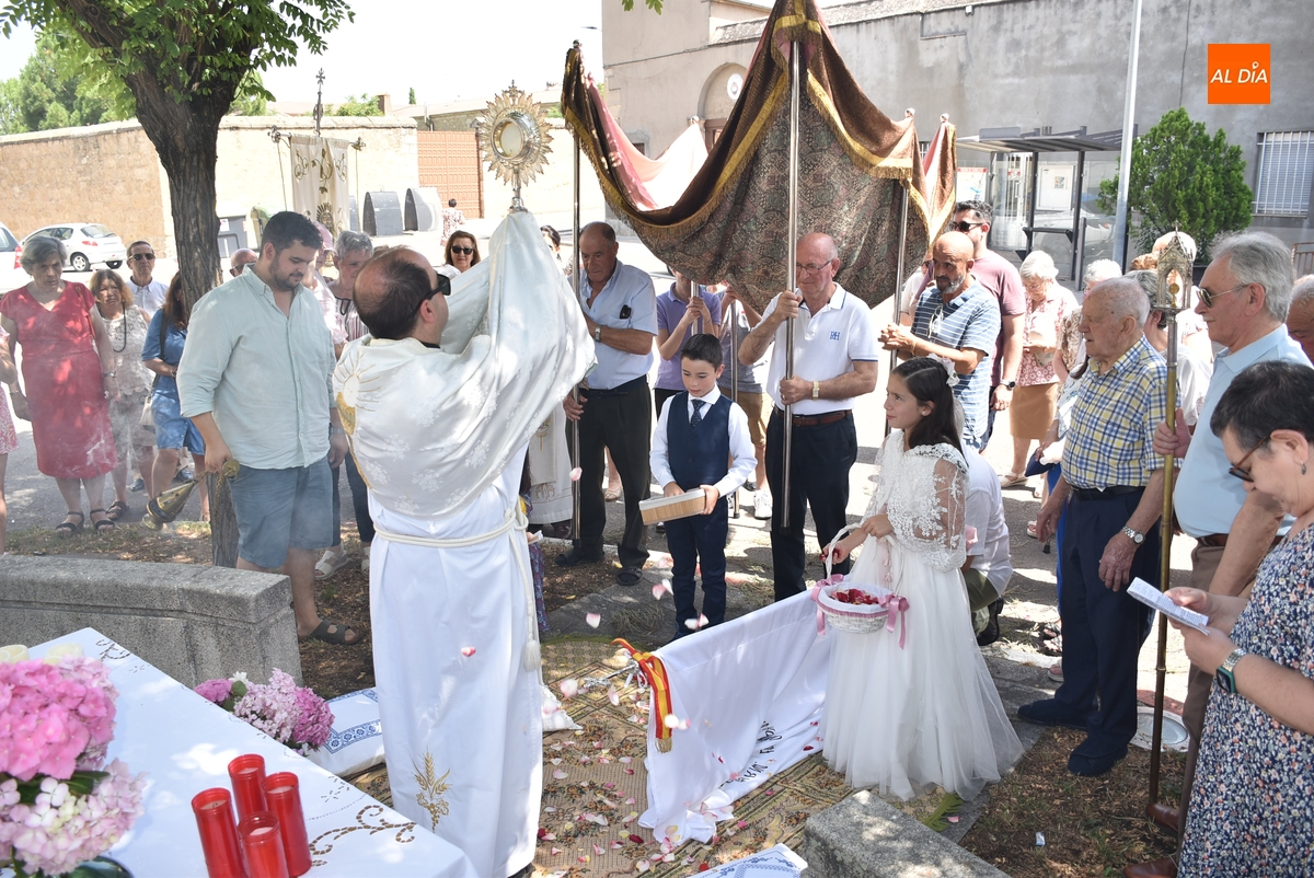 Esta salida del Santísimo a las calles de San Cristóbal estuvo acompañado por dos niños que han tomado la Primera Comunión durante esta primavera, que fueron lanzando pétalos a la custodia, así como por una bandera del grupo de Adoración Nocturna de Ciudad Rodrigo, que se inclinó en cada uno de los altares. De regreso al templo, el Santísimo quedó expuesto para ser adorado por todos aquellos que quisieran hasta las 18.00 horas, momento en que se producirá su reserva tras llevarse a cabo el rezo de Vísperas.