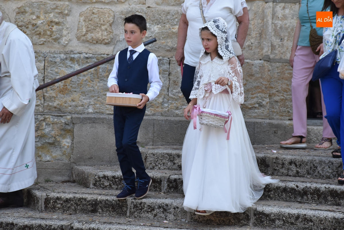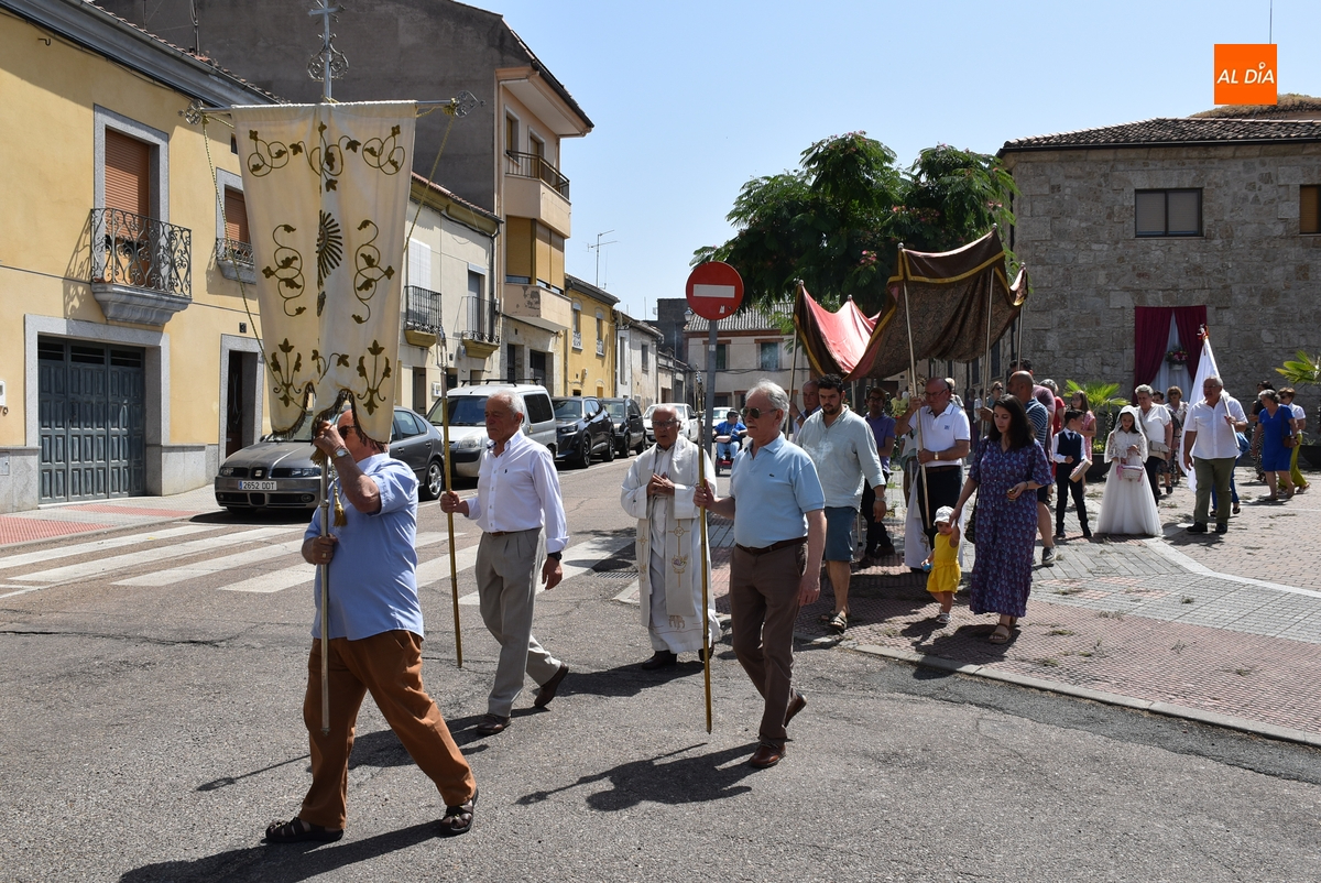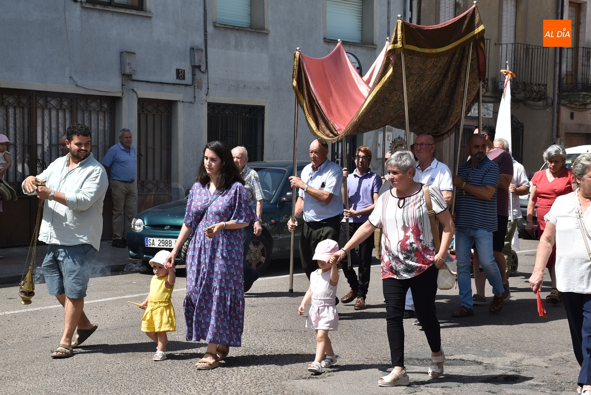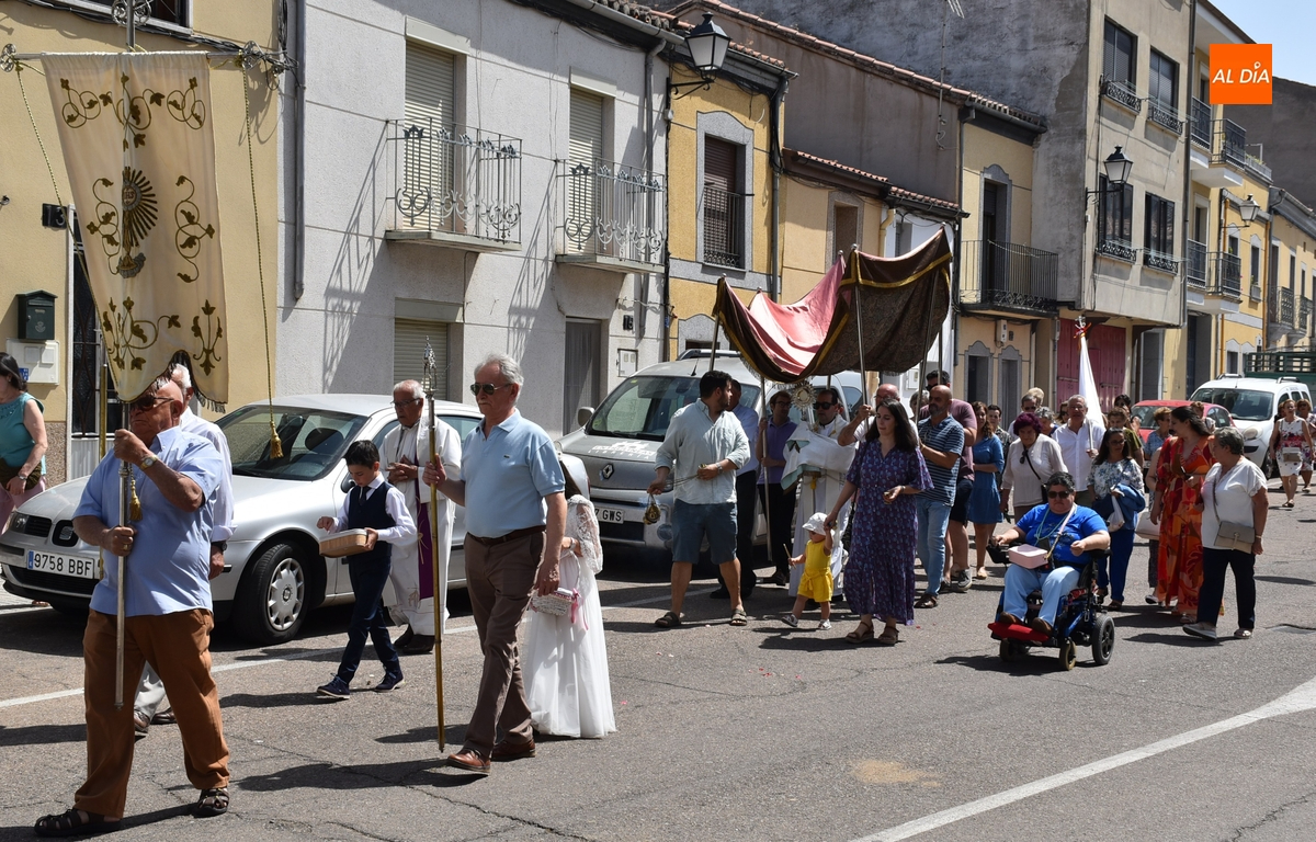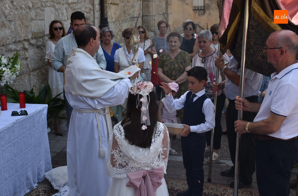 Esta salida del Santísimo a las calles de San Cristóbal estuvo acompañado por dos niños que han tomado la Primera Comunión durante esta primavera, que fueron lanzando pétalos a la custodia, así como por una bandera del grupo de Adoración Nocturna de Ciudad Rodrigo, que se inclinó en cada uno de los altares. De regreso al templo, el Santísimo quedó expuesto para ser adorado por todos aquellos que quisieran hasta las 18.00 horas, momento en que se producirá su reserva tras llevarse a cabo el rezo de Vísperas.