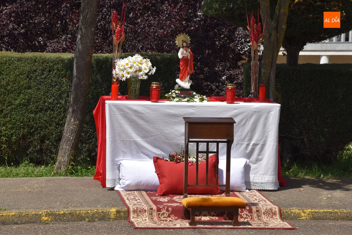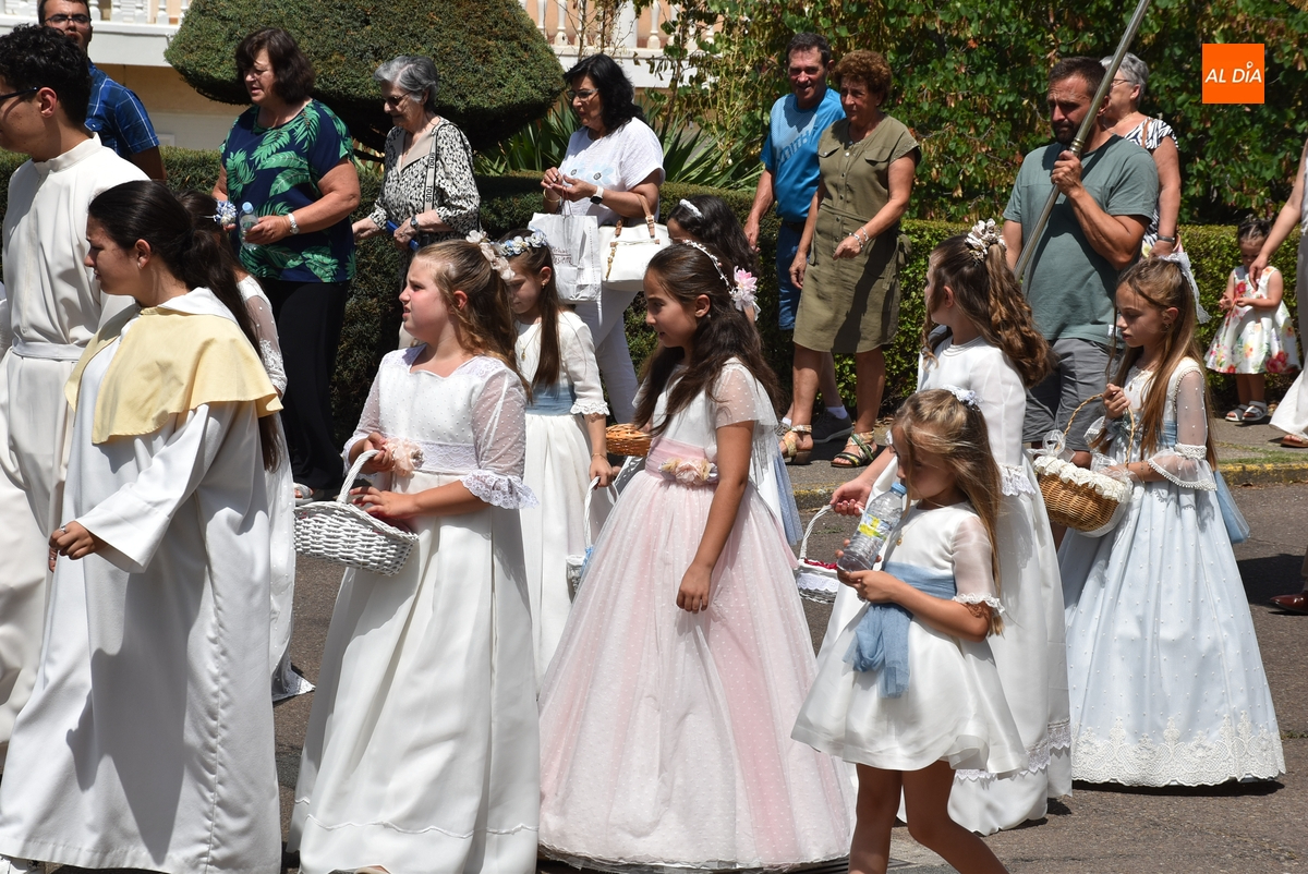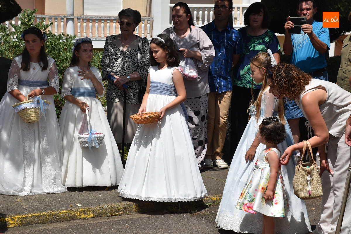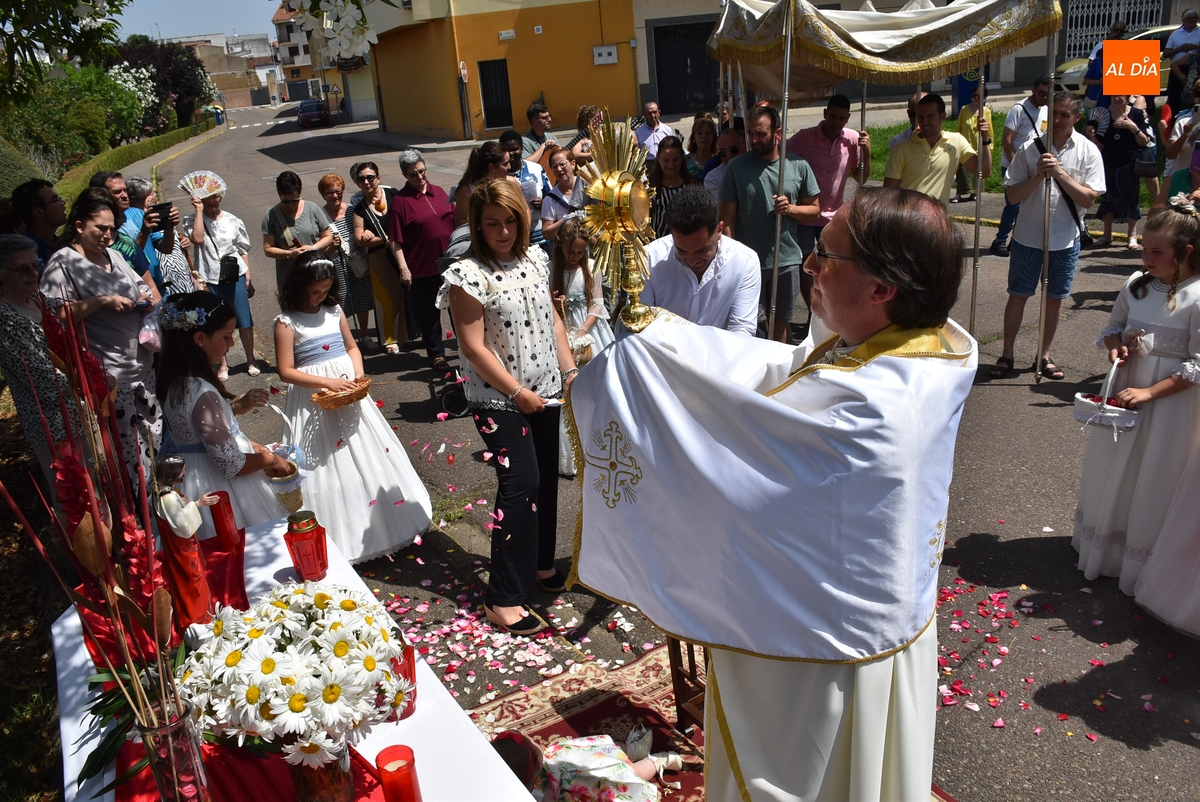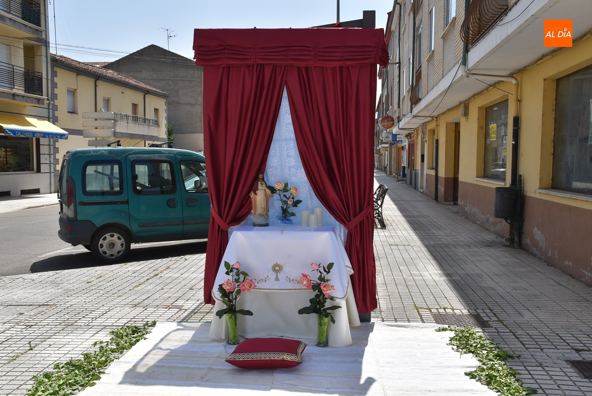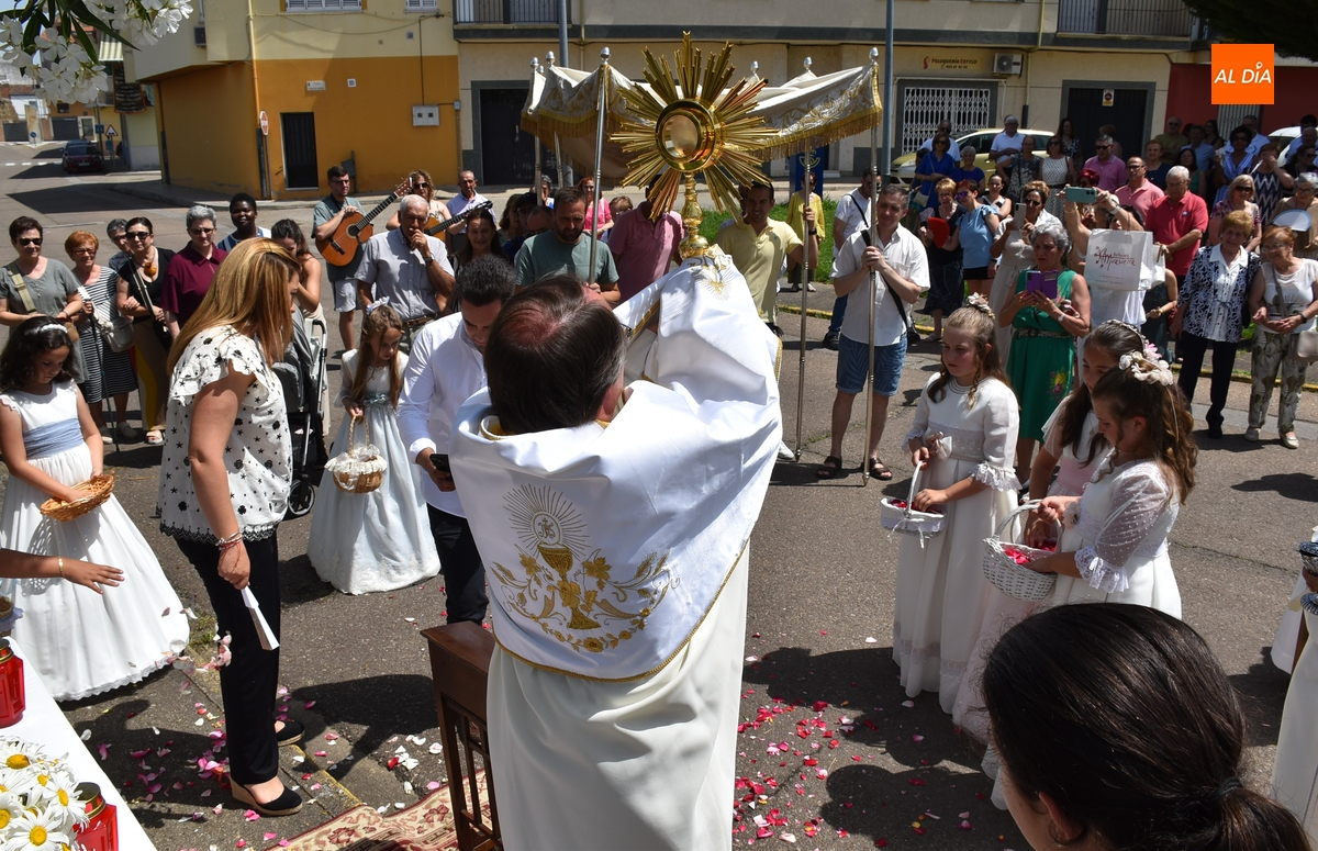Así, tras ir por las calles Figueira da Foz y Vilar Formoso, el Santísimo –que el párroco portó bajo el palio que llevaron entre 8 fieles- alcanzó el primer altar, situado en la confluencia de la Avenida de Los Cañitos con la Avenida Conde de Foxá. En este altar, se mostraron un poco tímidas a la hora de lanzar pétalos las 7 niñas que han tomado la Primera Comunión durante esta primavera que participaron en el desfile (a quienes fueron dando agua e incluso abanicando ante el fuerte calor que hacía).