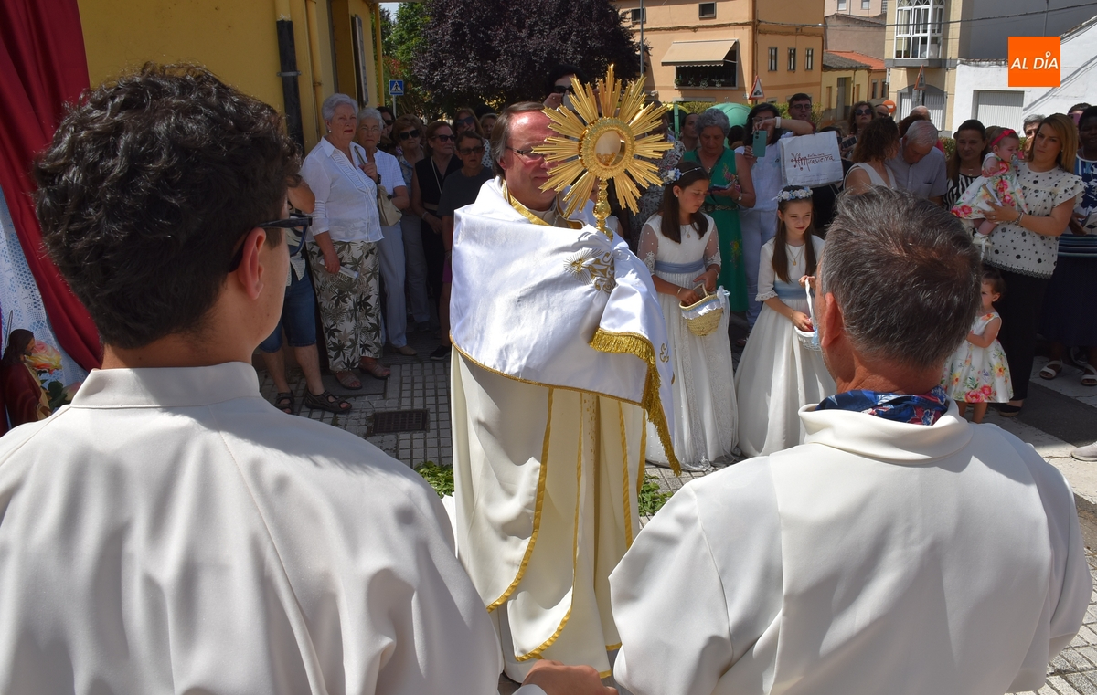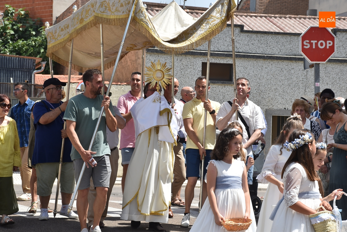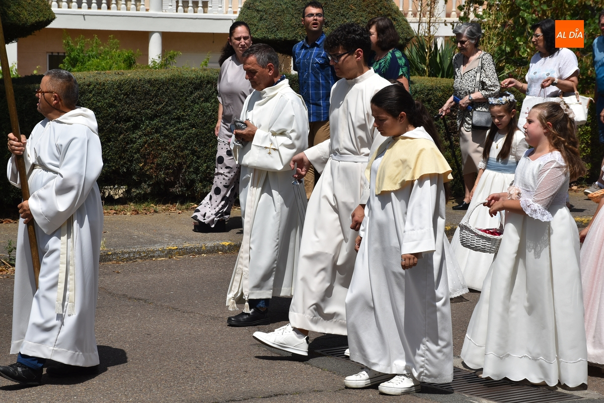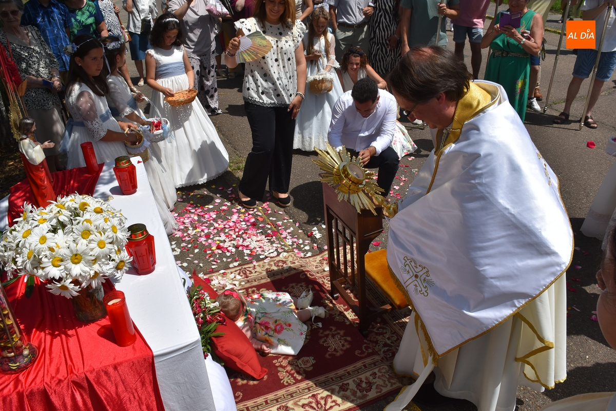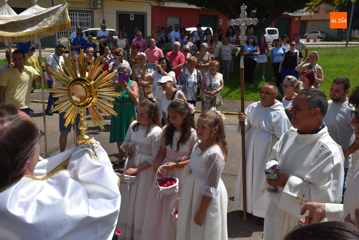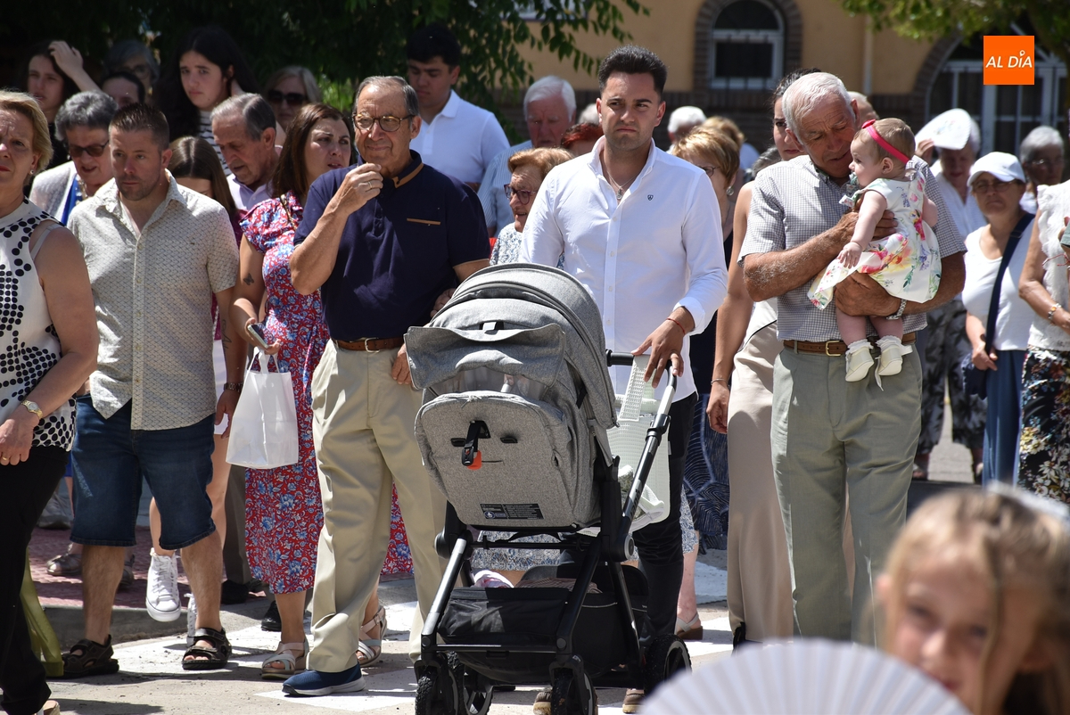 Así, tras ir por las calles Figueira da Foz y Vilar Formoso, el Santísimo –que el párroco portó bajo el palio que llevaron entre 8 fieles- alcanzó el primer altar, situado en la confluencia de la Avenida de Los Cañitos con la Avenida Conde de Foxá. En este altar, se mostraron un poco tímidas a la hora de lanzar pétalos las 7 niñas que han tomado la Primera Comunión durante esta primavera que participaron en el desfile (a quienes fueron dando agua e incluso abanicando ante el fuerte calor que hacía).