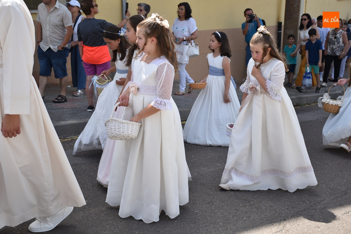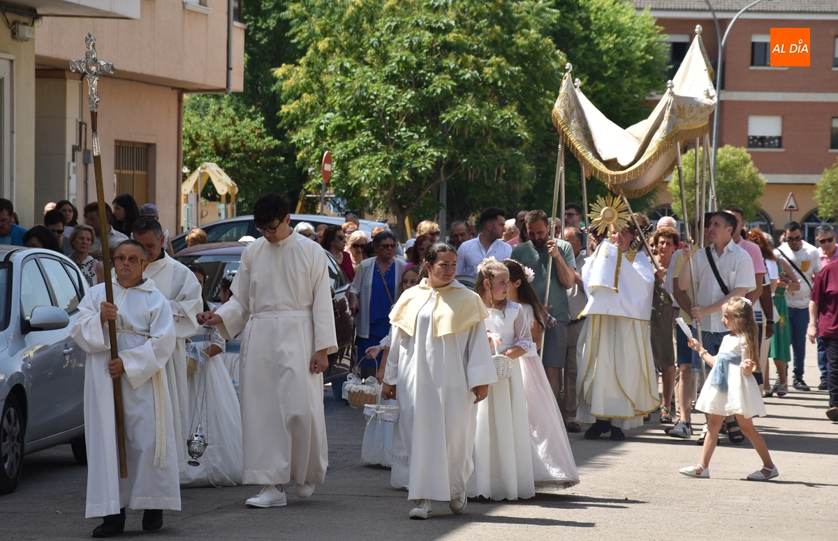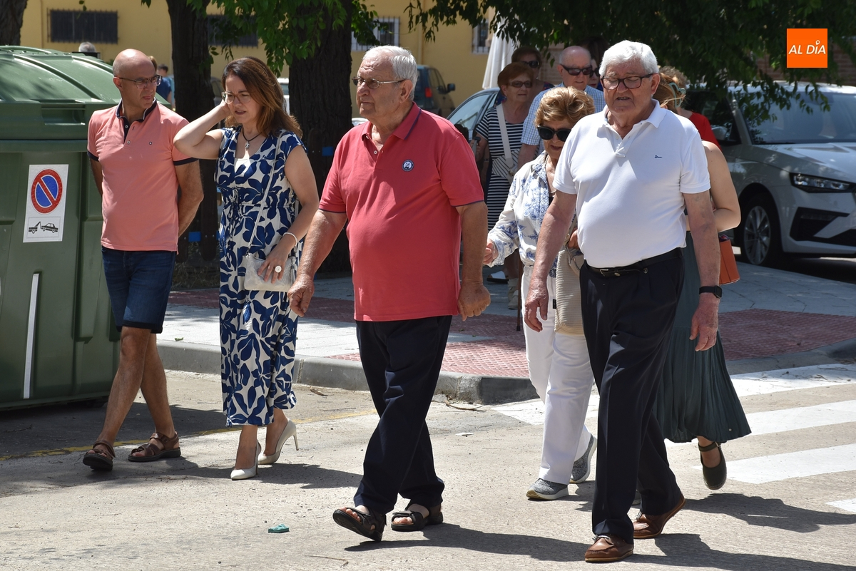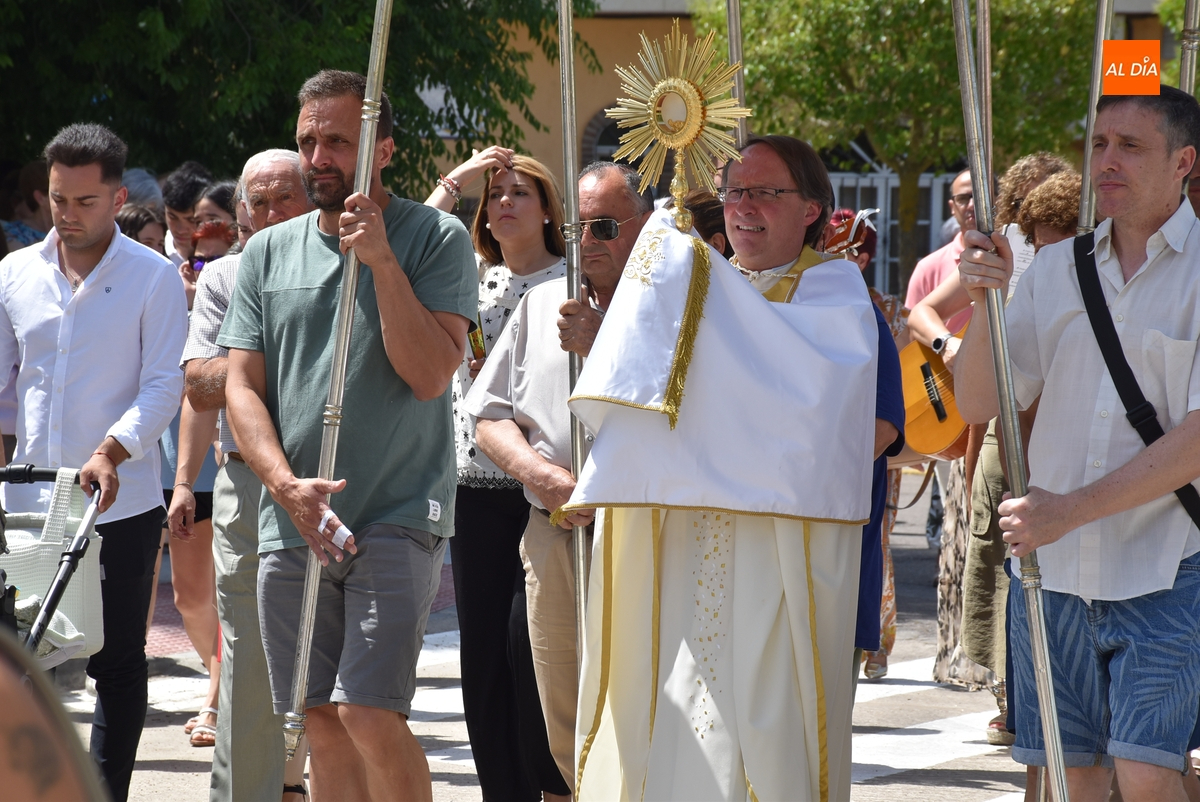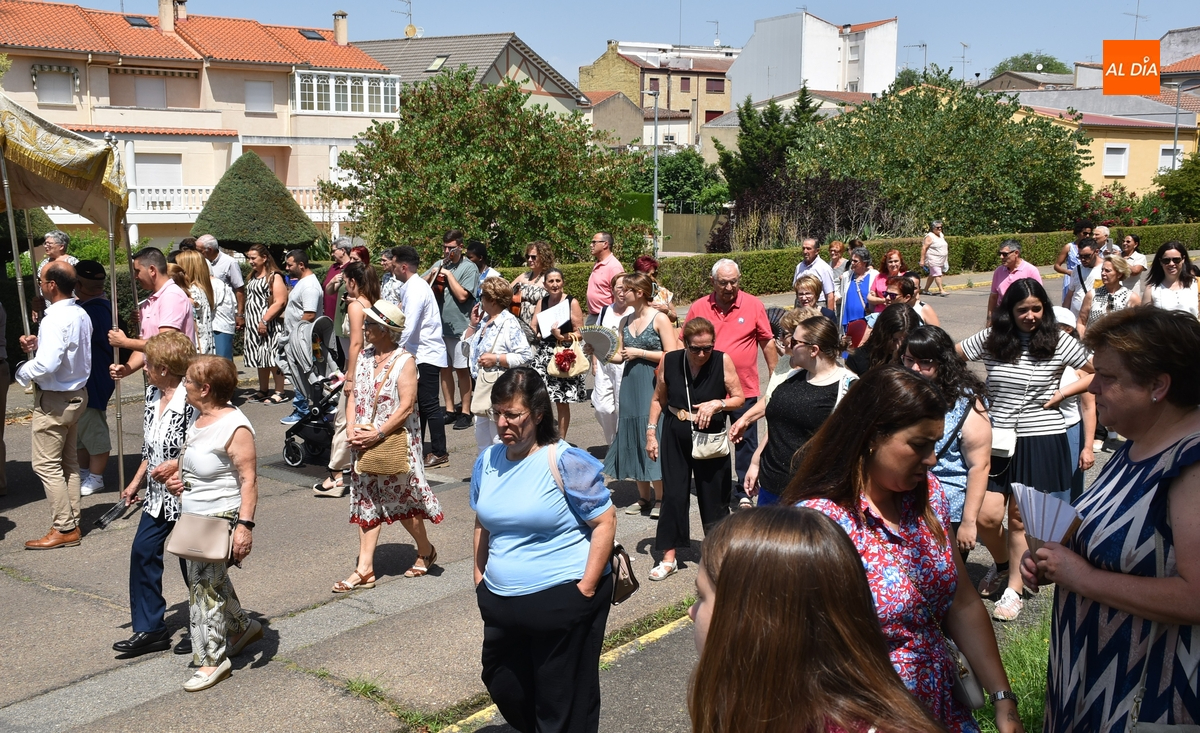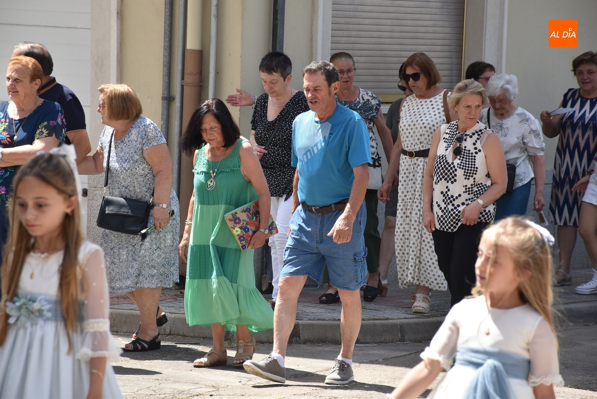 Así, tras ir por las calles Figueira da Foz y Vilar Formoso, el Santísimo –que el párroco portó bajo el palio que llevaron entre 8 fieles- alcanzó el primer altar, situado en la confluencia de la Avenida de Los Cañitos con la Avenida Conde de Foxá. En este altar, se mostraron un poco tímidas a la hora de lanzar pétalos las 7 niñas que han tomado la Primera Comunión durante esta primavera que participaron en el desfile (a quienes fueron dando agua e incluso abanicando ante el fuerte calor que hacía).