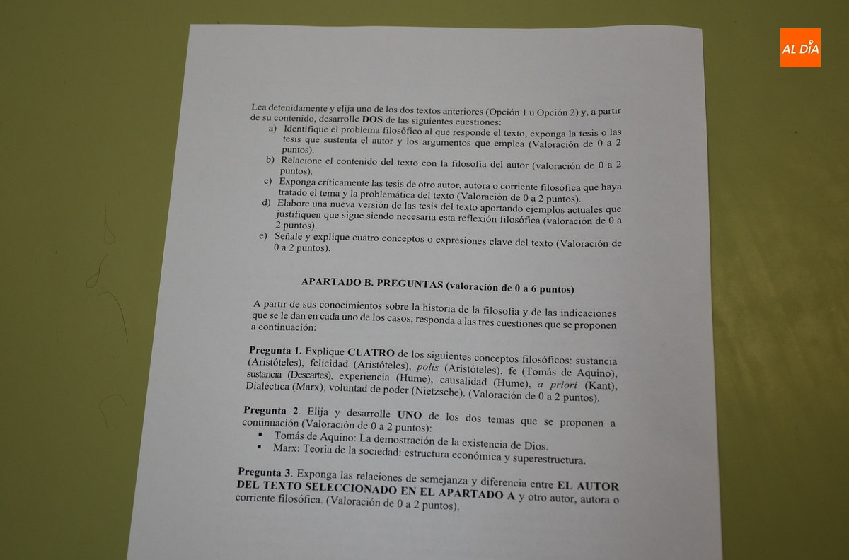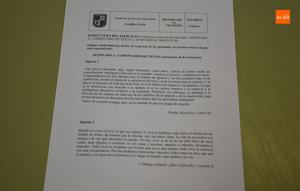 Tras ese primer examen, tuvo lugar el segundo de la convocatoria, el de Historia de la Filosofía, que sólo realizó un alumno (el resto ha optado por otras asignaturas), teniendo como opciones de textos el Libro VII de la República de Platón; y la Lección X de ¿Qué es la filosofía? de Ortega y Gasset.
