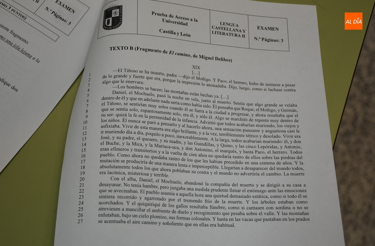 Por último, en el apartado de Comentario Literario del Texto, los alumnos tuvieron dos opciones: el poema El Hospicio de Campos de Castilla, de Antonio Machado; y un fragmento de El Camino de Miguel Delibes; debiendo señalar de la opción escogida el argumento, los temas y la estructura. A partir de ahí, tuvieron que comentar las características formales, relacionándolas con el autor y el movimiento literario en el que se inscribe.