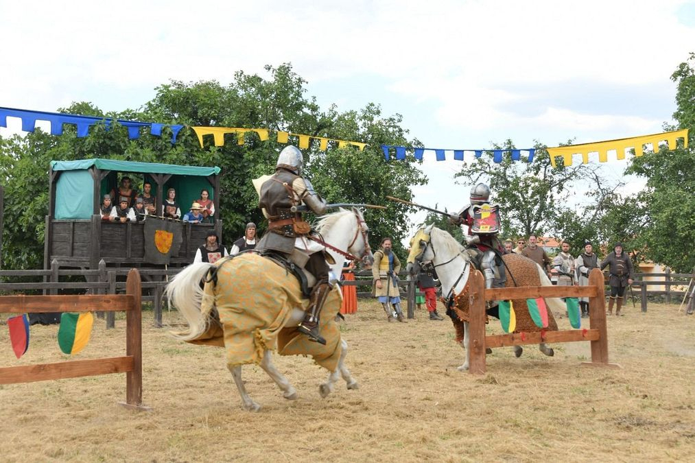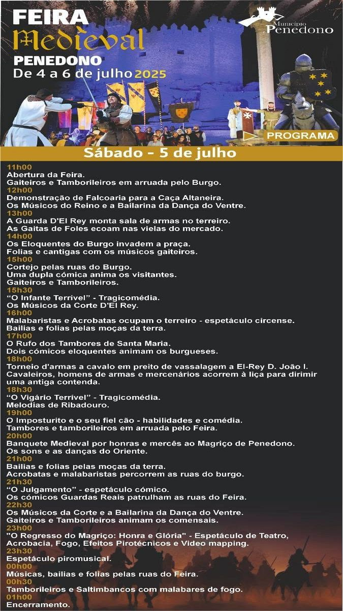 El sábado día 5, el mercado de productos alimenticios y artesanales, así como el resto de los espacios abrirán a las 11:00 horas. Se desarrollará una demostración de halconería para la caza, un nuevo cortejo, circo con malabaristas y acróbatas y torneo de armas a pie y a caballo, par dar paso a uno de los momentos altos del certamen: el Banquete Medieval, una cena de gala en la que todos los participantes deben ir vestidos rigurosamente según los usos de la época.