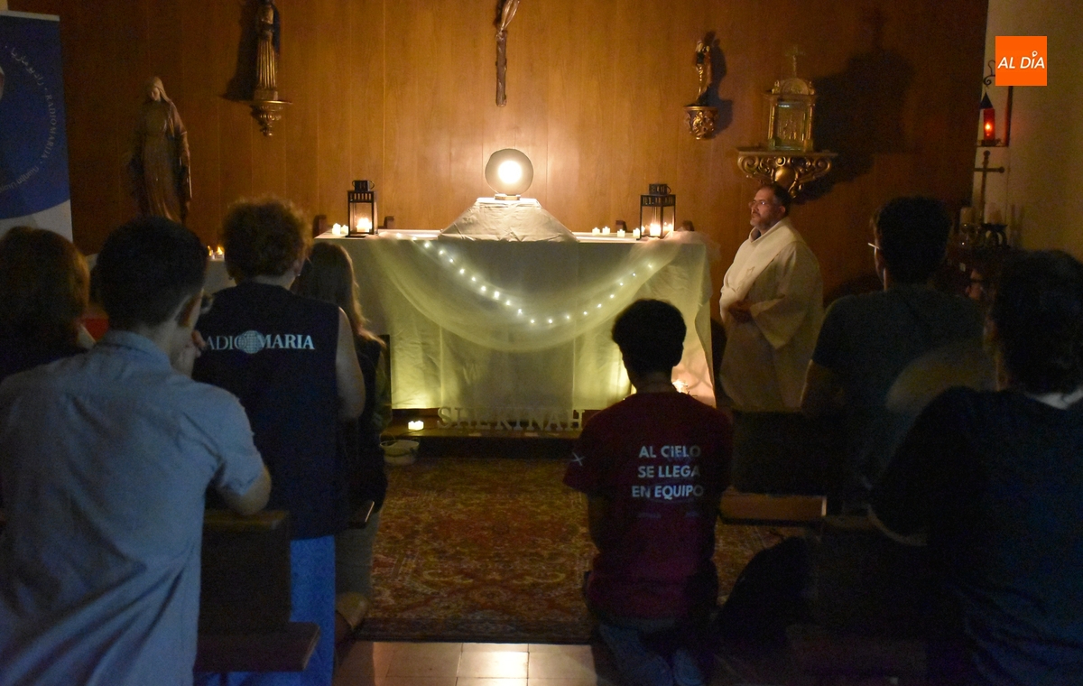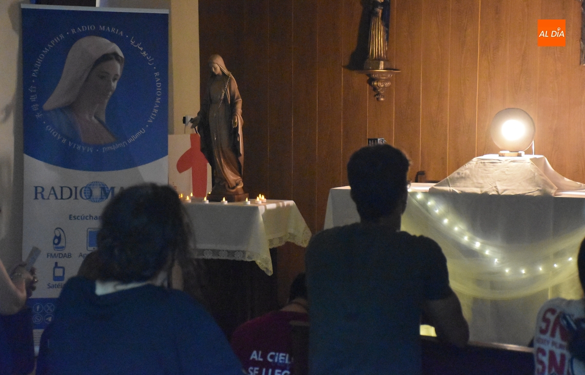 Al hilo de ello, se ofrecieron algunos testimonios, antes de entrar en una solemne parte de adoración por parte de los jóvenes de Shekinah, con cánticos y rezos, ante el Santísimo Sacramento (con la imagen de Reina justo al lado), que fue presidida por el diácono permanente Daniel Mielgo.