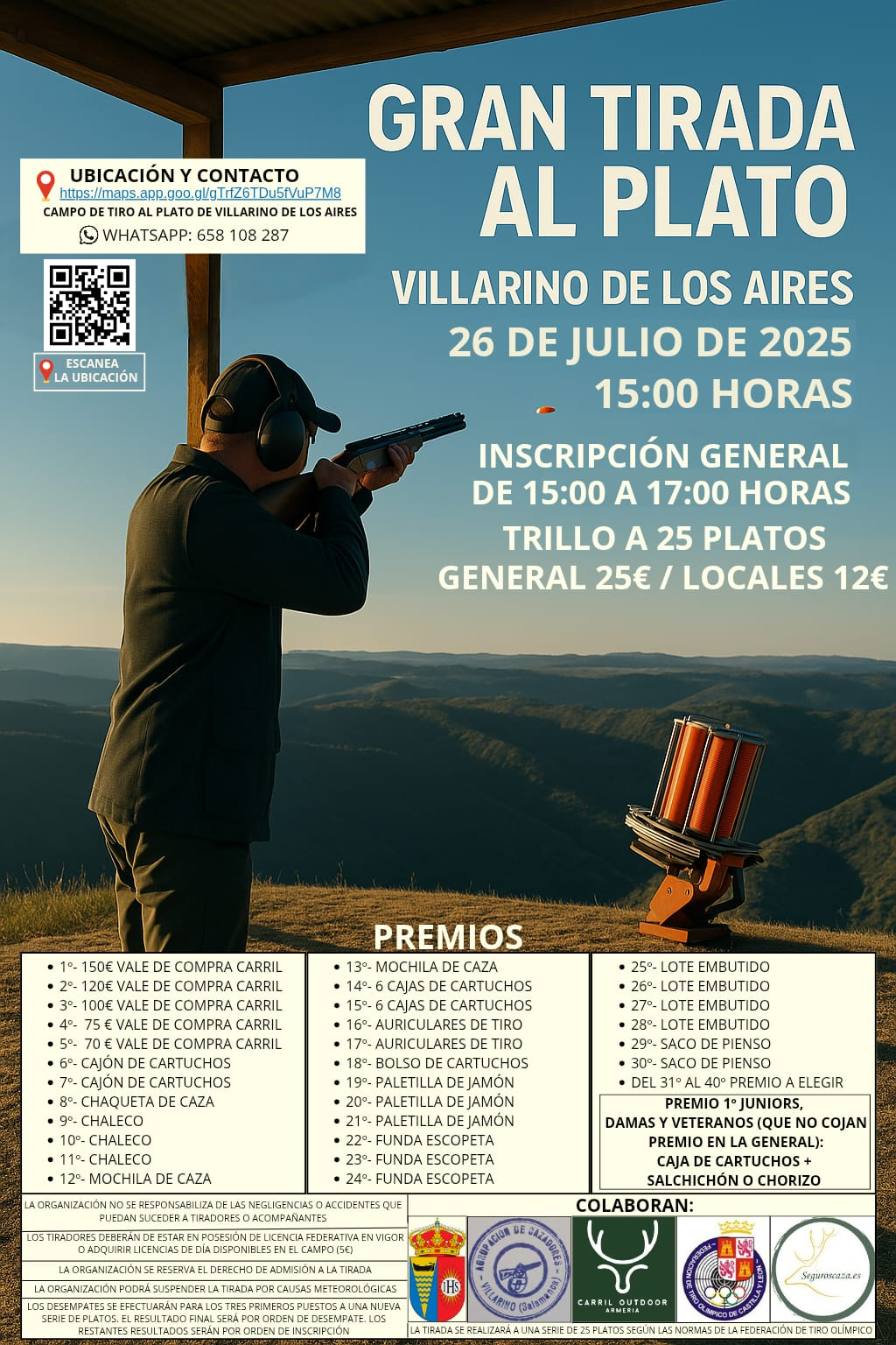 La primera gran cita será el sábado 26 de julio a partir de las 15:00 horas con la Gran Tirada al Plato. El evento, que se celebrará en el Campo de Tiro 'El Soto', se disputará en la modalidad de trillo a 25 platos y contará con inscripciones de 15:00 a 17:00 horas, con un coste de 25 euros para la categoría general y 12 euros para los tiradores locales.