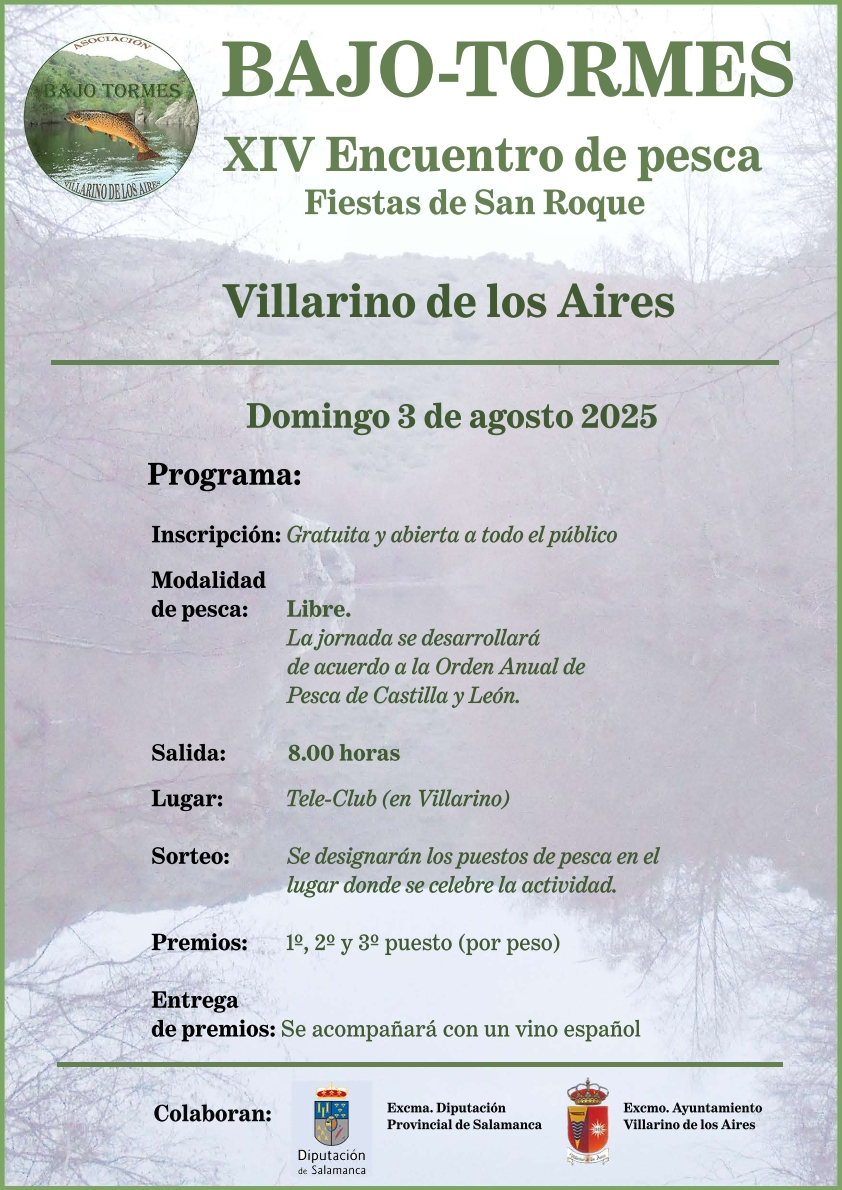 El domingo 3 de agosto será el turno de los amantes de la pesca con el XIV Encuentro 'Bajo-Tormes'. La jornada comenzará a las 8:00 horas con salida desde el Tele-Club. La inscripción es gratuita y abierta a todo el público, desarrollándose la competición en modalidad libre, de acuerdo con la normativa de pesca de Castilla y León.