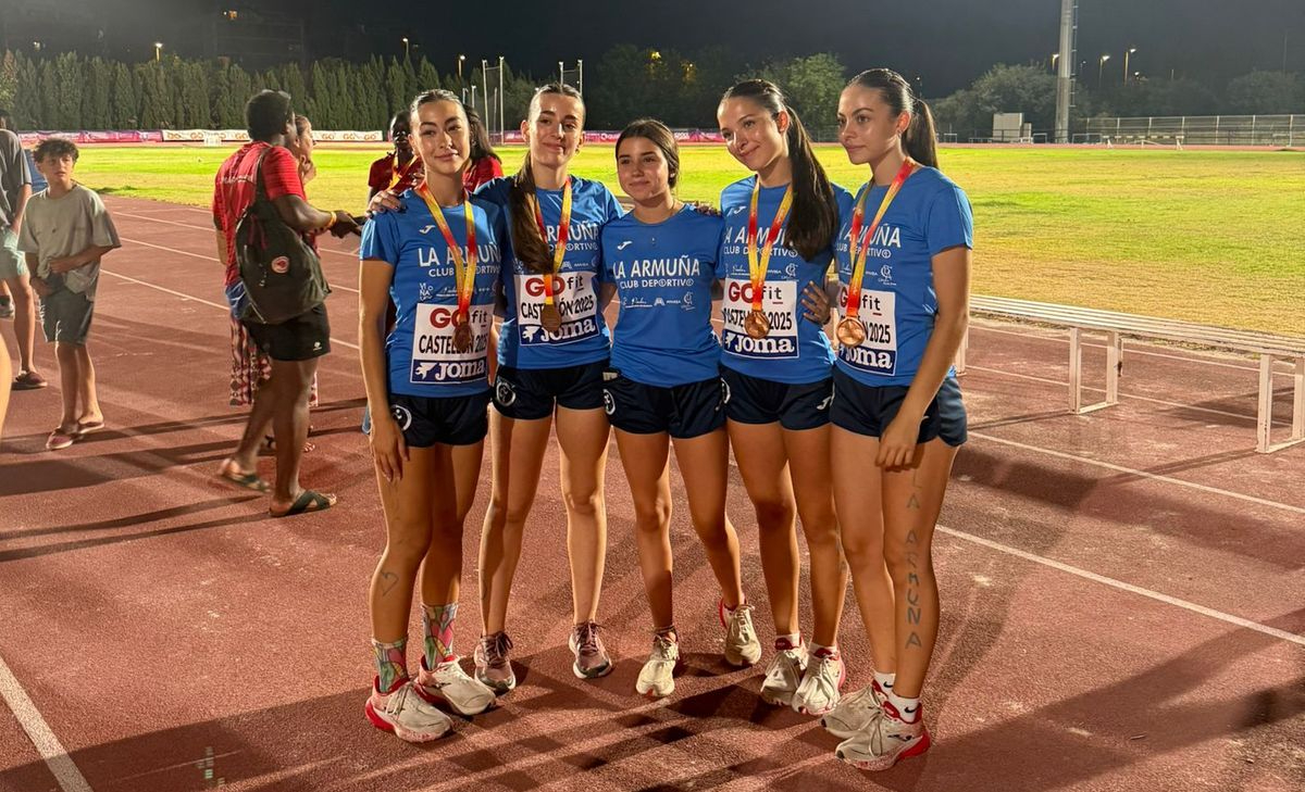 El éxito del fin de semana se completó con el trabajo en equipo. El conjunto femenino del CD La Armuña logró una fantástica tercera posición en la final del relevo 4x100 metros del nacional Sub-18, demostrando una gran coordinación y velocidad.