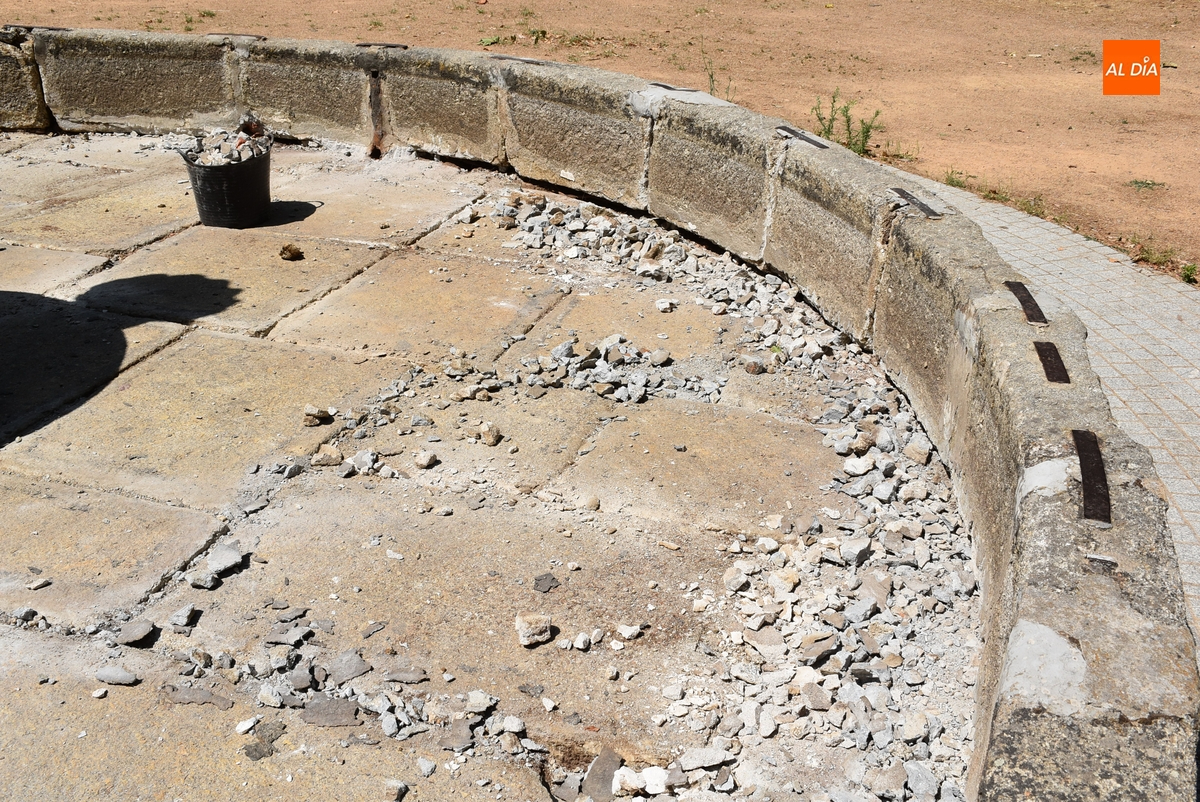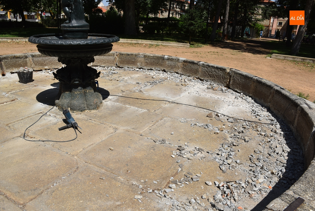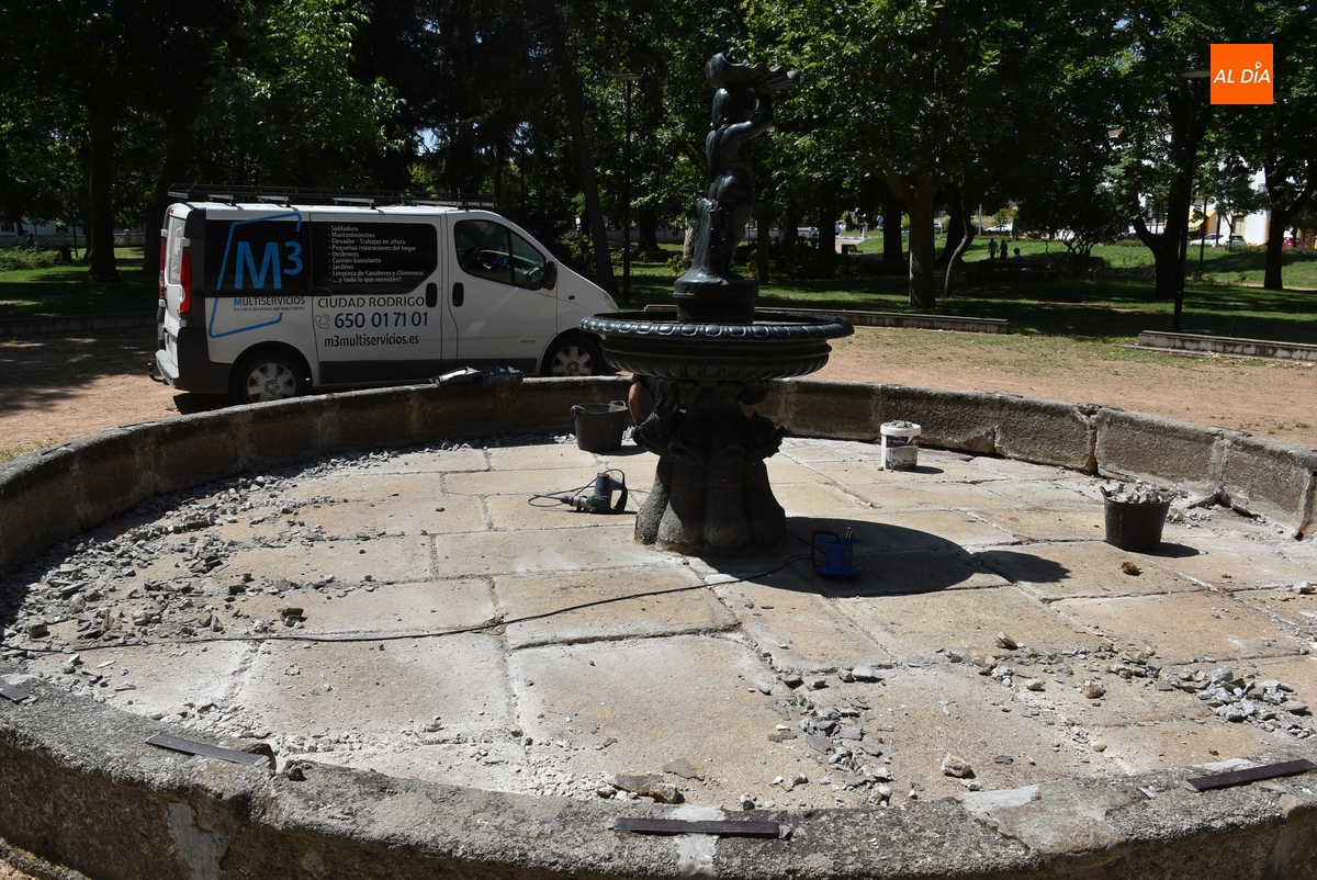 Esta semana han comenzado los trabajos de reparación de la emblemática fuente del Parque de La Florida de Ciudad Rodrigo, que lucía vacía desde hace casi medio año (desde las primeras semanas de 2025), tras haberse generado una serie de fisuras en la estructura que provocaban que el agua se fuese perdiendo (acumulándose además en el exterior).