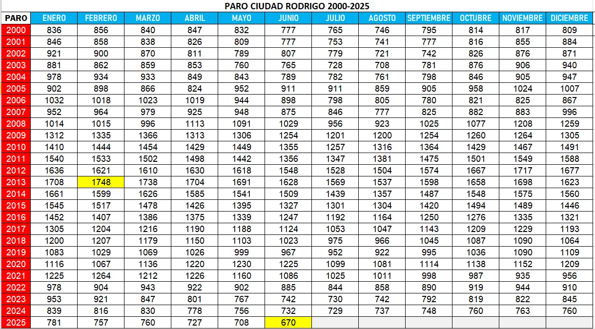 Como era previsible teniendo en cuenta que en mayo ya se igualó la que era cifra más baja hasta la fecha (que databa de agosto de 2003), y que el verano suele traer noticias favorables, Ciudad Rodrigo marcó en el mes de junio su registro mensual de parados más bajo en lo que va de siglo XXI, con un total de 670 personas desempleadas.
