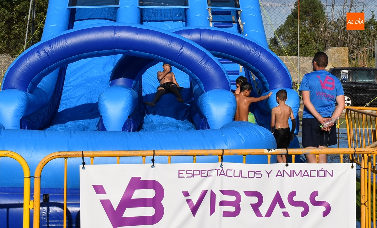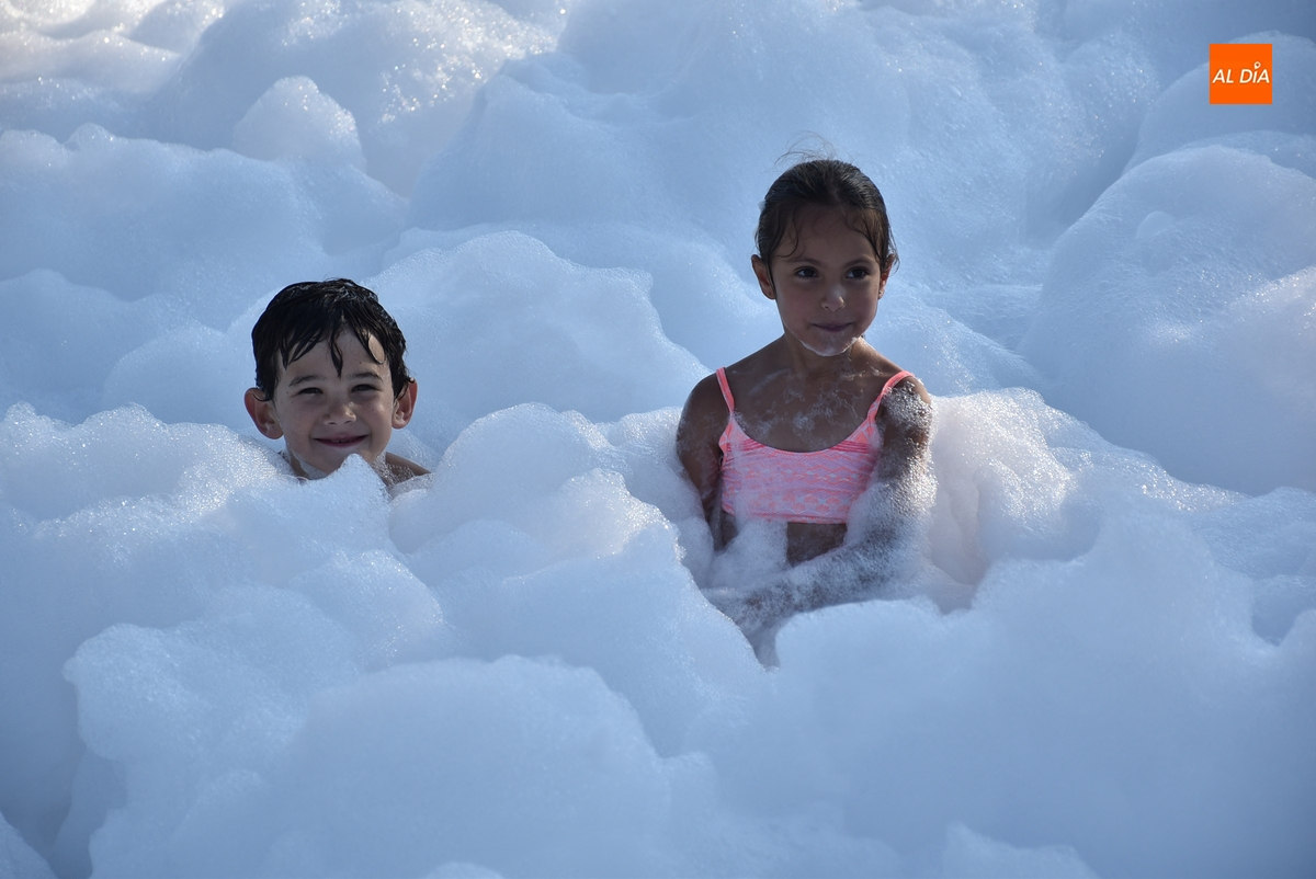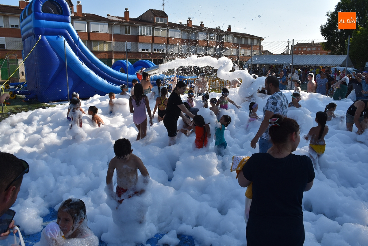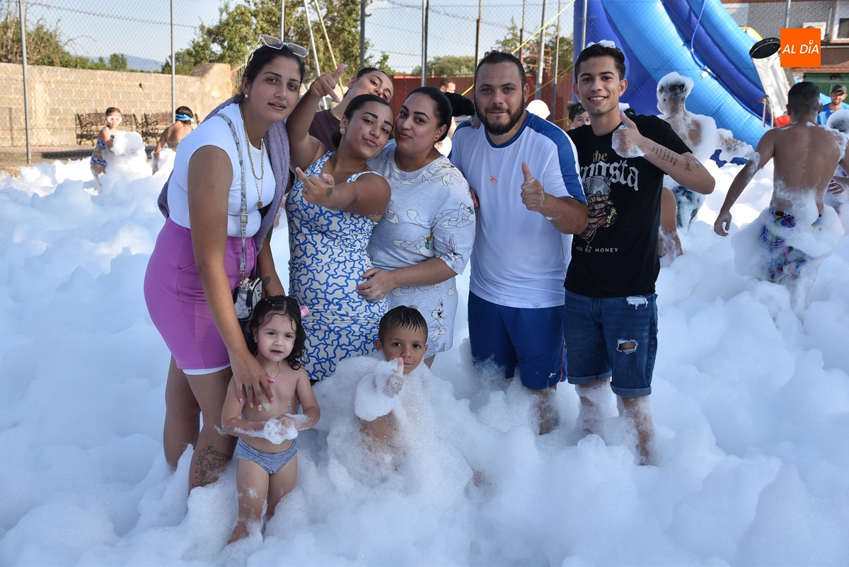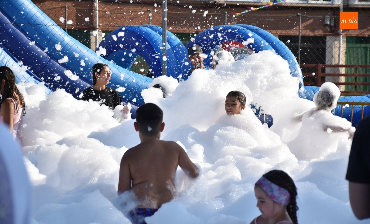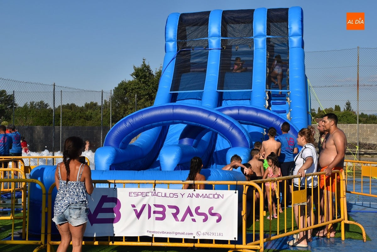 Tras el encierro de carretones de la tarde del sábado, los más pequeños volvieron a tener otra cita en la tarde del domingo dentro de las fiestas de la Asociación de Vecinos del Barrio Nuevo de Ciudad Rodrigo, en este caso, con una sesión de hinchables acuáticos y una fiesta de la espuma, con los cuales pudieron aliviar el calor reinante, que sin ser extremo, sí era intenso.