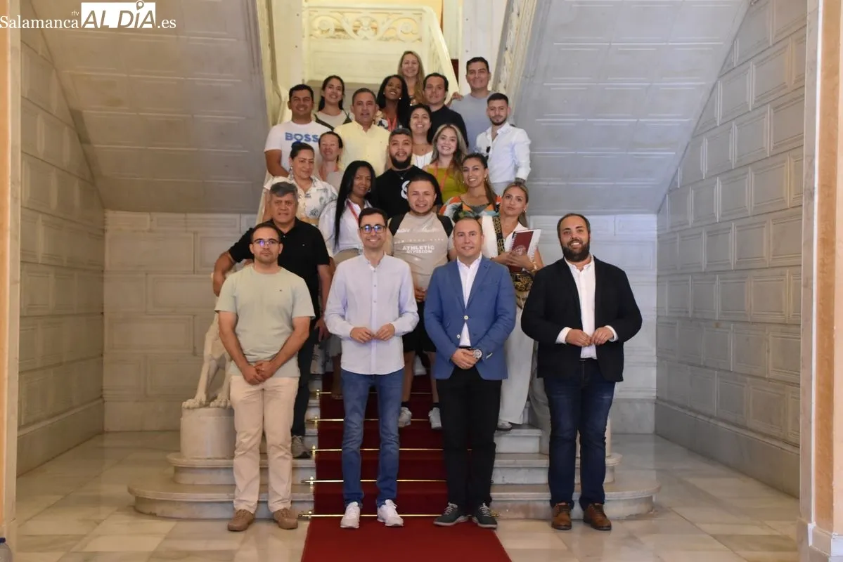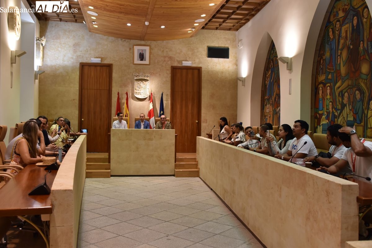 El concejal de Educación del Ayuntamiento de Salamanca, Luis Sánchez, ha recibido durante la mañana de este martes, 15 de julio, en el Salón de Recepciones del consistorio a un grupo de más de una veintena de alumnos, procedentes de la Universidad Gran Colombia.