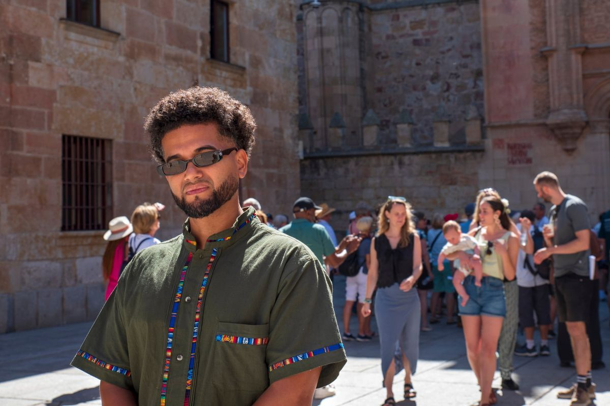 Edwing Vladimir posa para la cámara de Carmen Borrego entre los visitantes que tratan de encontrar la rana en la fachada de la Universidad o asomarse al pozo del Patio de Escuelas. El músico urbano, el poeta rapero que lleva en la piel el verso de Celaya sobre la poesía comprometida, nos ha citado en el mismo centro de la ciudad universitaria: “Se trata de juntar la cultura con mayúsculas con la cultura con minúsculas y con la cultura popular. Hay que mezclar y avanzar”.