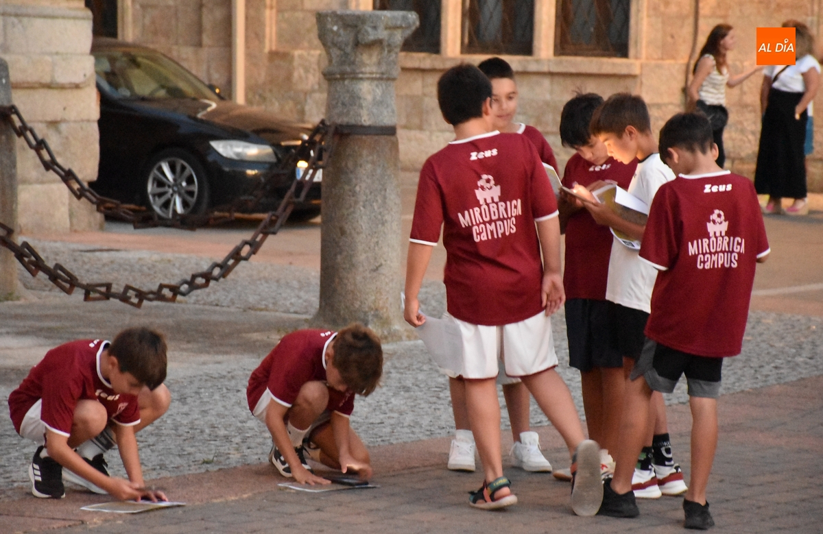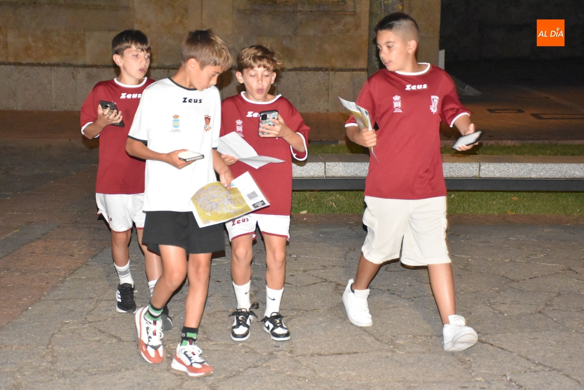 Por un lado, los grupos de pequeños fueron redistribuidos (mezclando las edades) para, acompañados por monitores, ir en busca de algo más de una decena de códigos QR repartidos por el recinto amurallado, que fueron leyendo con dispositivos móviles, para ir descubriendo unas palabras con las cuales conformar un texto en torno al origen de Ciudad Rodrigo, conduciéndoles asimismo a un tesoro en el escenario del final del juego, la Plazuela del Conde.