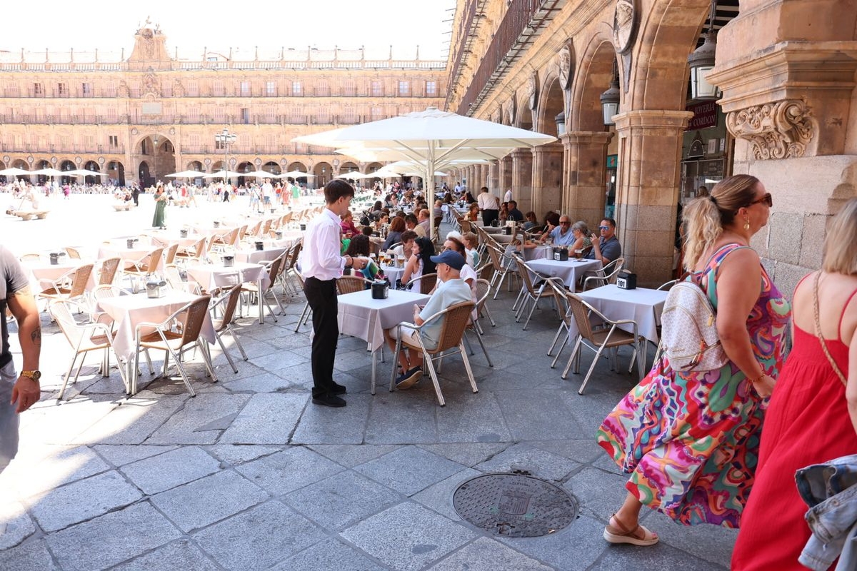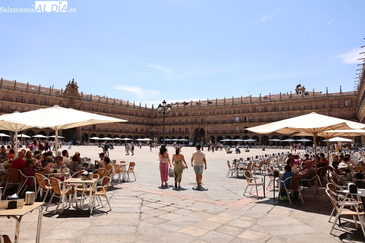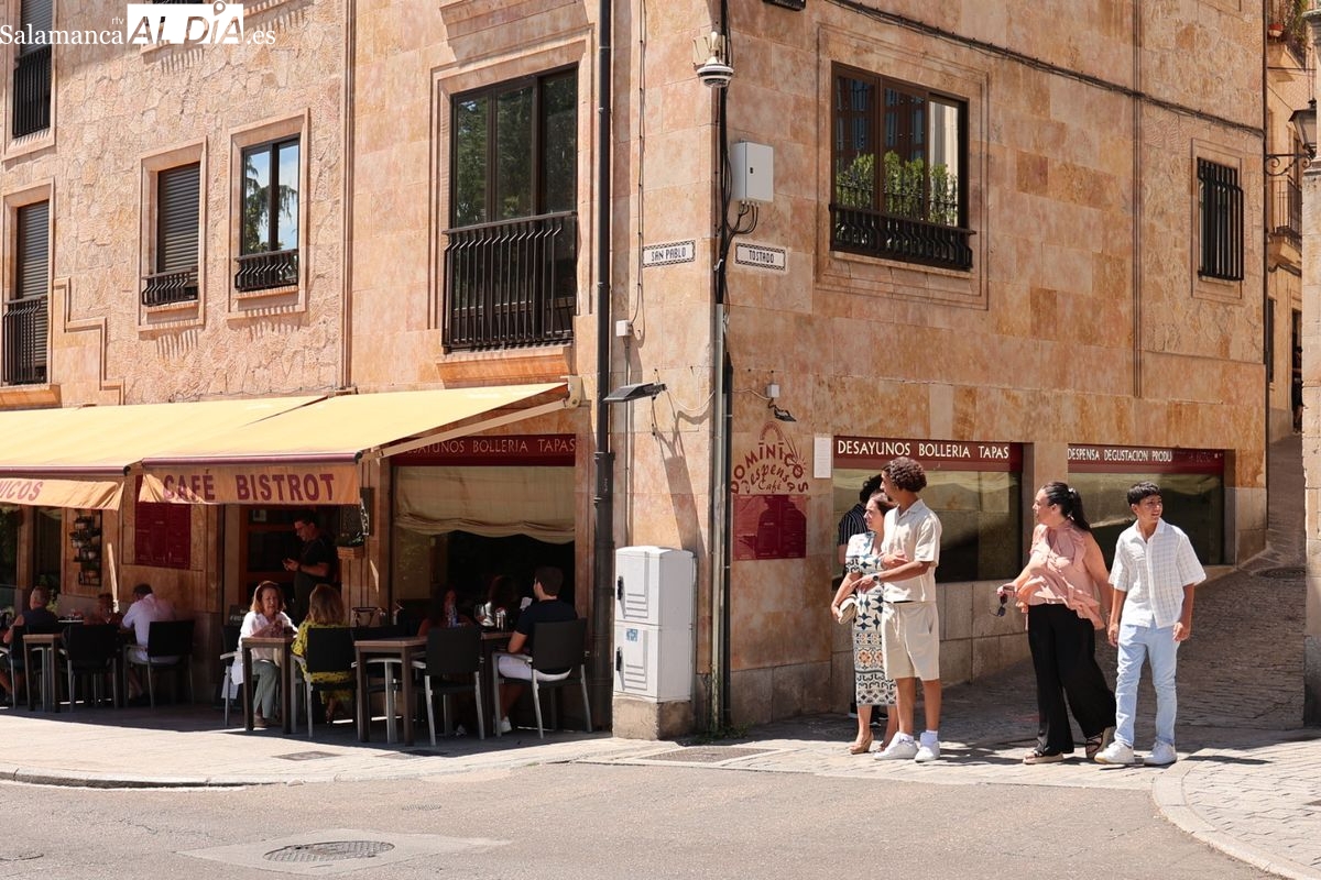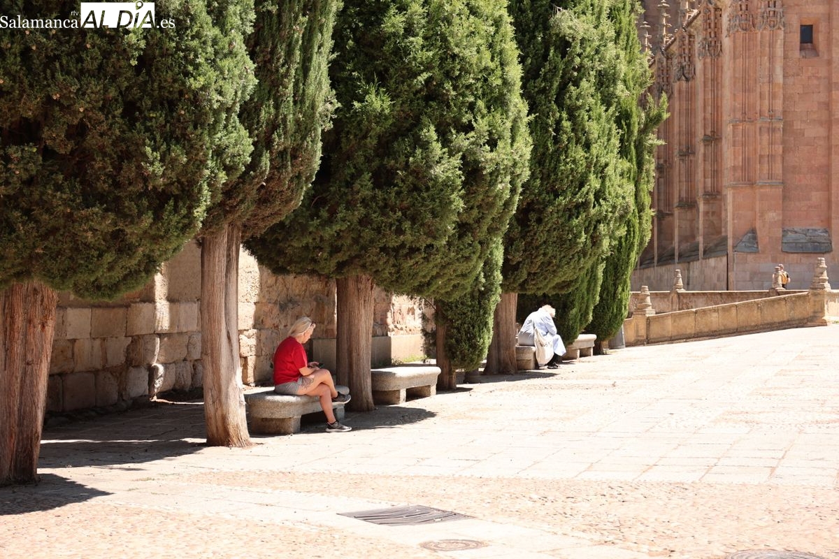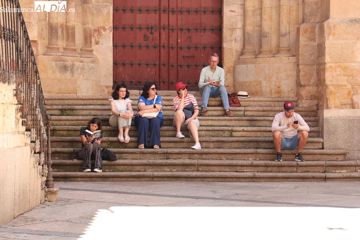 El descenso de las temperaturas, que ha concedido un bienvenido respiro este sábado tras el calor intenso de días precedentes, ha animado a salmantinos y turistas a disfrutar del centro de la ciudad, tantos en las terrazas como en la zona monumental, así como en parques y zonas ajardinadas.