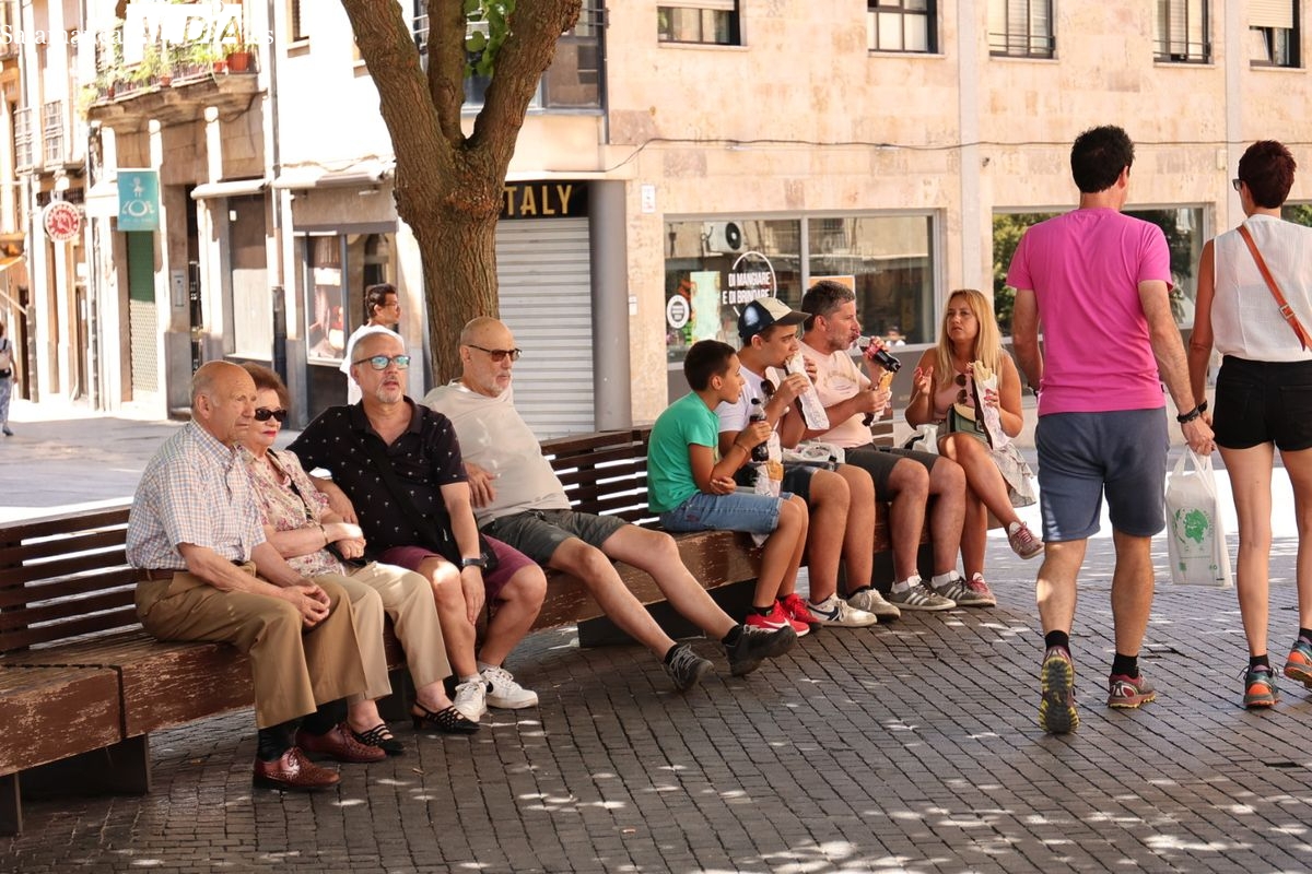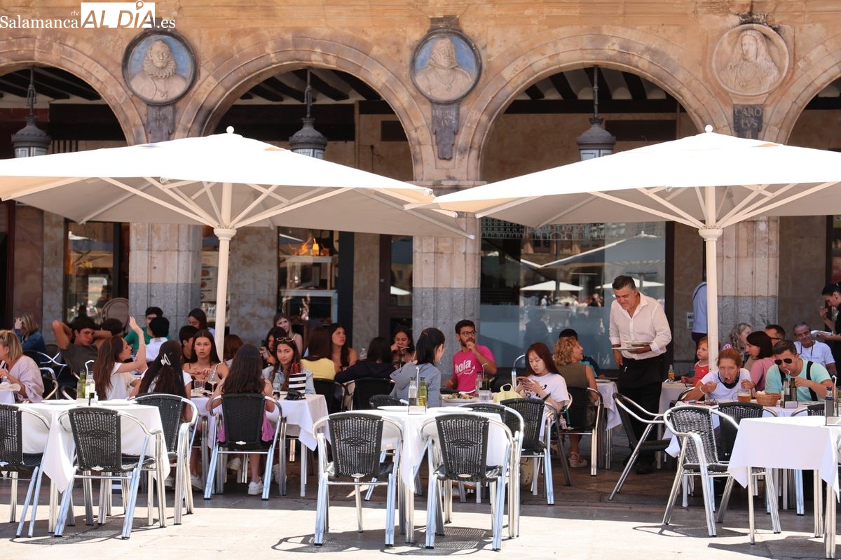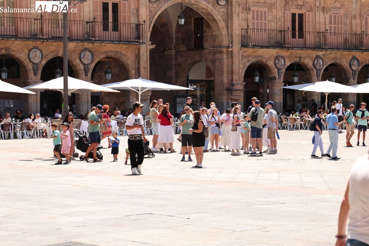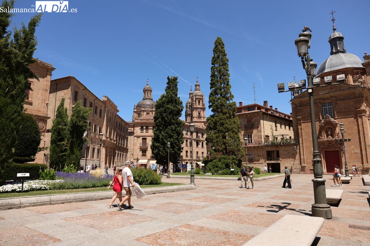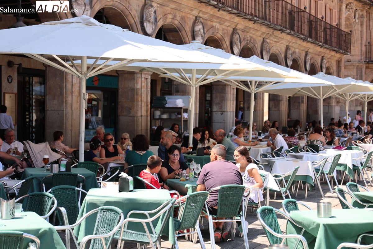 El descenso de las temperaturas, que ha concedido un bienvenido respiro este sábado tras el calor intenso de días precedentes, ha animado a salmantinos y turistas a disfrutar del centro de la ciudad, tantos en las terrazas como en la zona monumental, así como en parques y zonas ajardinadas.