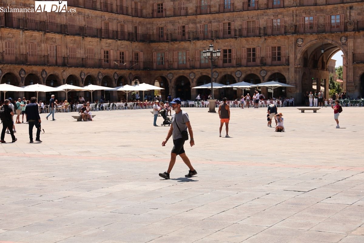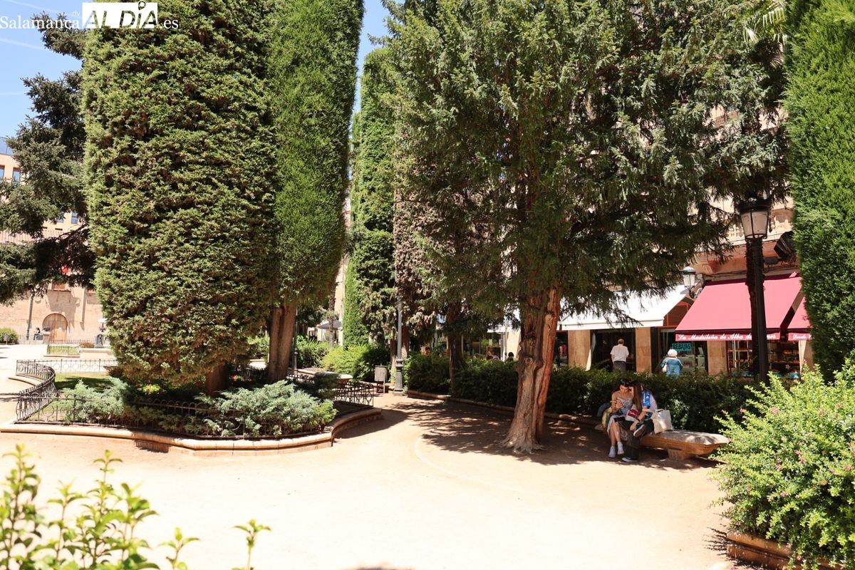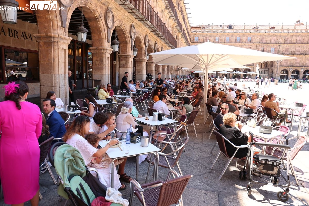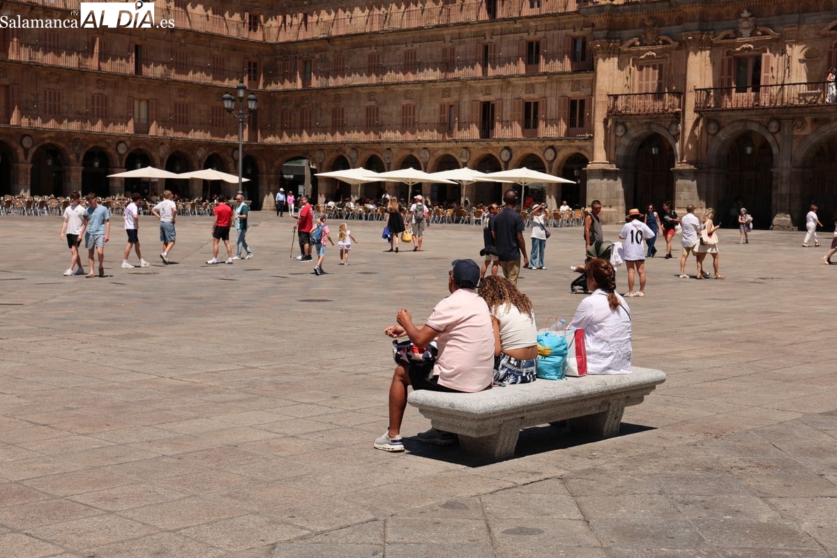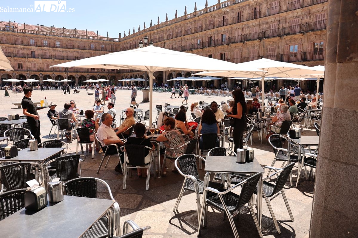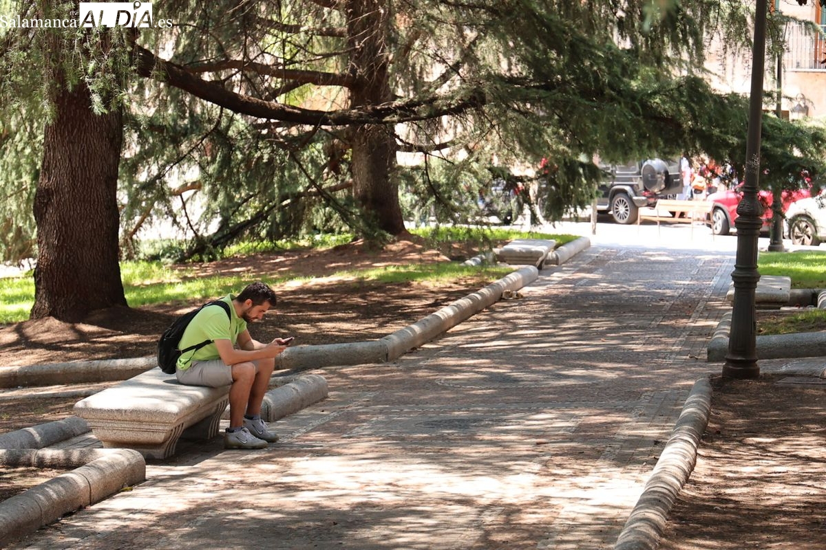 El descenso de las temperaturas, que ha concedido un bienvenido respiro este sábado tras el calor intenso de días precedentes, ha animado a salmantinos y turistas a disfrutar del centro de la ciudad, tantos en las terrazas como en la zona monumental, así como en parques y zonas ajardinadas.