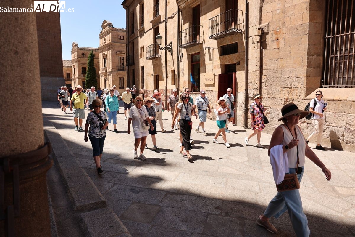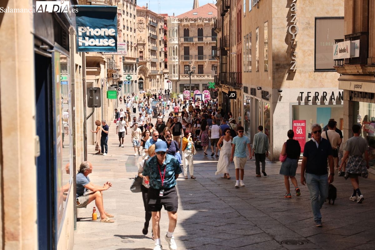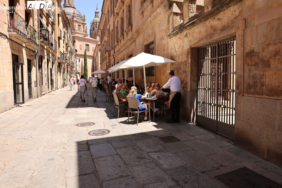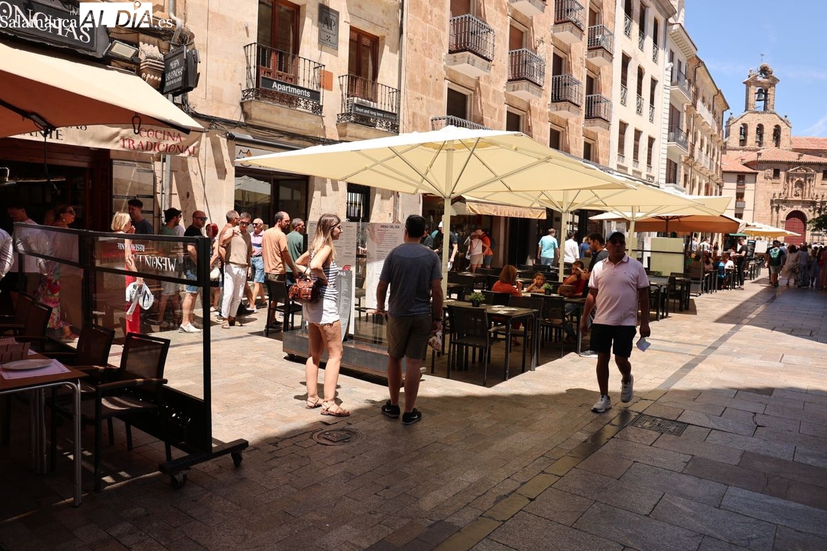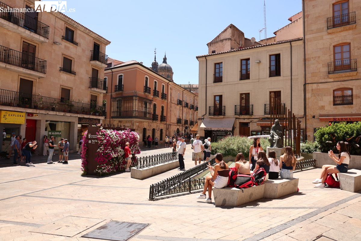 El descenso de las temperaturas, que ha concedido un bienvenido respiro este sábado tras el calor intenso de días precedentes, ha animado a salmantinos y turistas a disfrutar del centro de la ciudad, tantos en las terrazas como en la zona monumental, así como en parques y zonas ajardinadas.