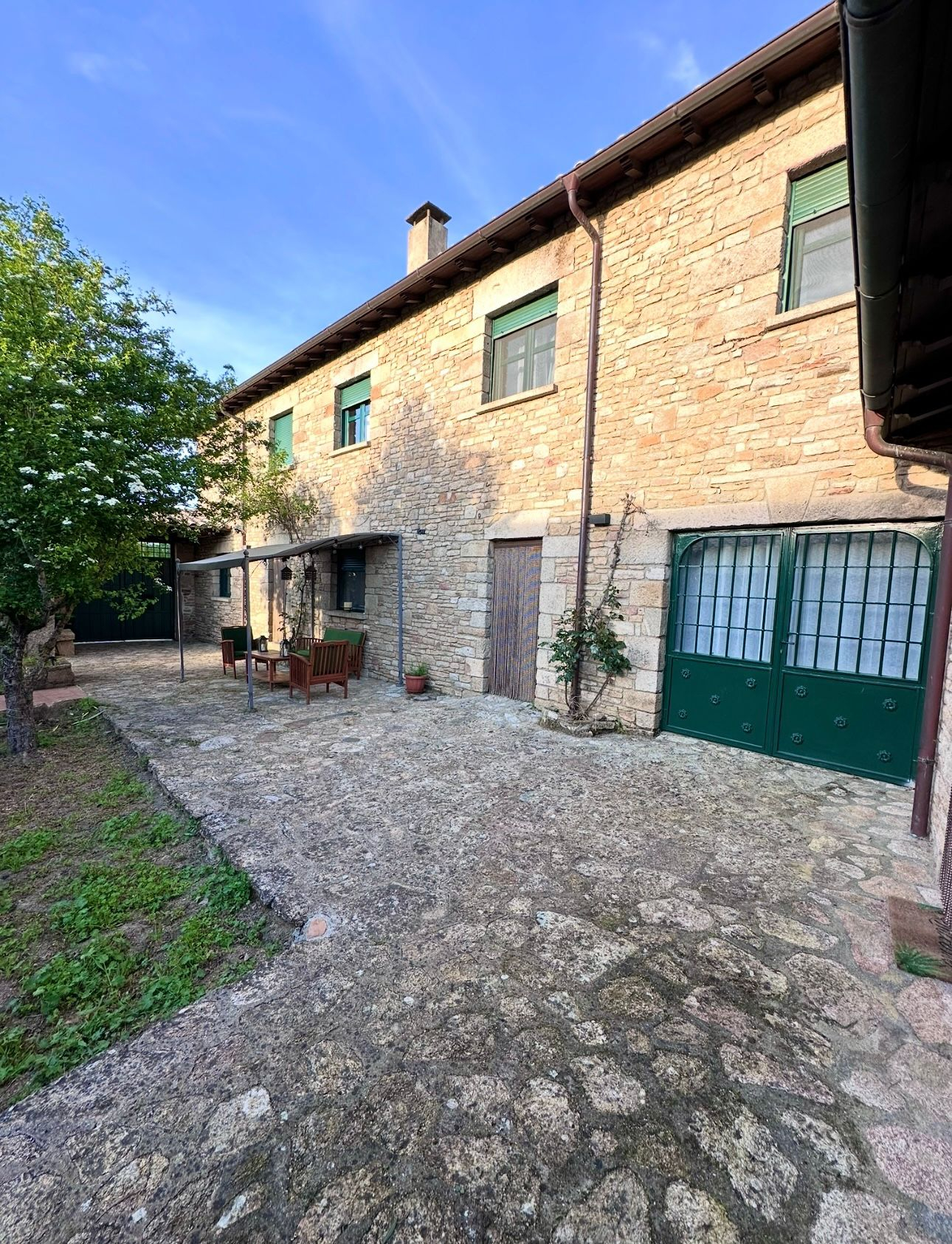 El edificio, con una fachada de piedra labrada, se distribuye en dos alturas y presenta una singular construcción en forma de U que gira en torno a un gran patio interior, equipado con zona de barbacoa-paellero, concebido como el corazón social de la casa.