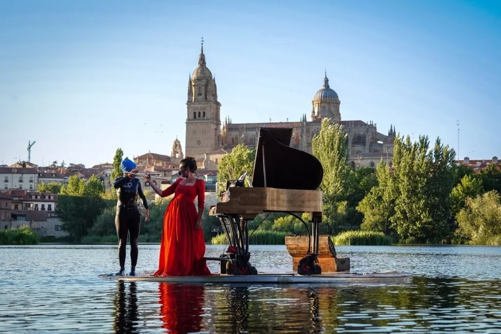 Una de las citas más esperadas es ‘Pedalopiano. A fleur d’eau. El Piano Flotante’, un espectáculo que se desarrollará directamente sobre las aguas del río Tormes. Este proyecto es el fruto del encuentro entre la cantante Louise Perret y el pianista Cédric Granelle.
