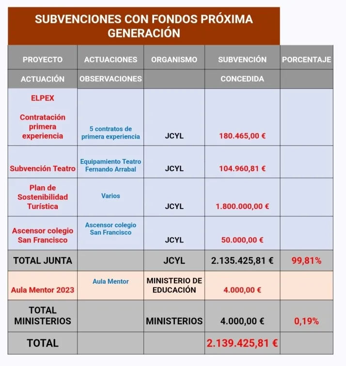 En concreto, por medio de la Junta se ha recibido el 99,81% de esa cantidad (2.135.425,81€), correspondiendo la mayor parte (1,8 millones) al Plan de Sostenibilidad Turística, mientras que por medio del Gobierno ha sido el 0,19% (una “escueta” subvención de 4.000€ para el Aula Mentor 2023 del Ministerio de Educación).