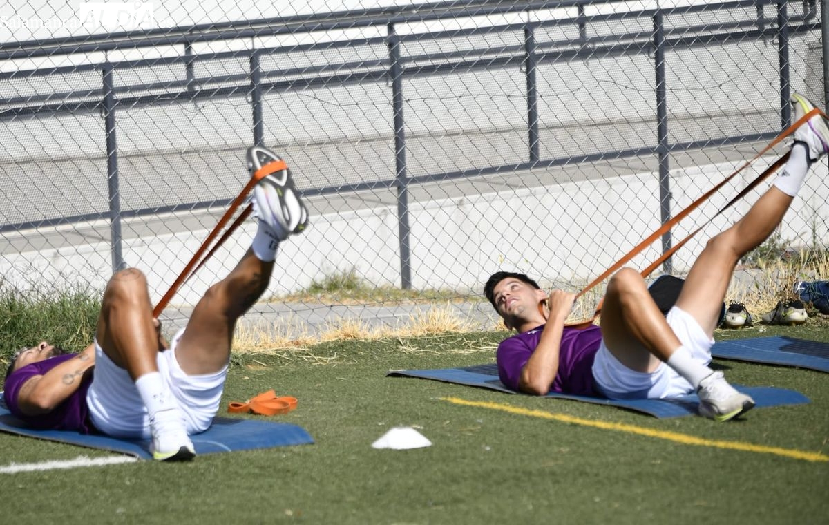 El entrenamiento de este jueves se dividió en dos partes bien diferenciadas. La jornada comenzó con un intenso trabajo físico en el que los jugadores utilizaron gomas, pesas y otros elementos de preparación.