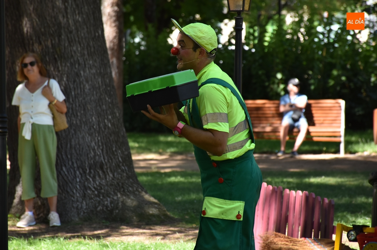 Interpretando al jardinero de un parque (con sus propios bancos, vallas y farolas), Claudio Cleaner Clown ofreció un montaje en clave cómica repleto de conciencia ecológica, para que los pequeños que asistieron a la representación tomen conciencia de la necesidad de cuidar los entornos naturales (de hecho al final les recordó que la ciudad más limpia es aquella que menos se ensucia).