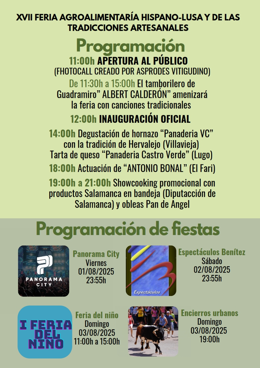 El fin de semana continuará con dos importantes citas feriales. El sábado, 2 de agosto, se celebrará la XVII Feria Agroalimentaria, que este año crece hasta los 32 expositores. Para el alcalde, la feria da "un salto de calidad" con la incorporación del stand de Salamanca en Bandeja y las degustaciones del cocinero David Monaguillo. Además, el Ayuntamiento ofrecerá degustaciones de hornazo de Villavieja y tarta de queso de Lugo para apoyar a los artesanos presentes.