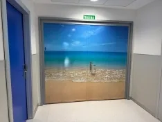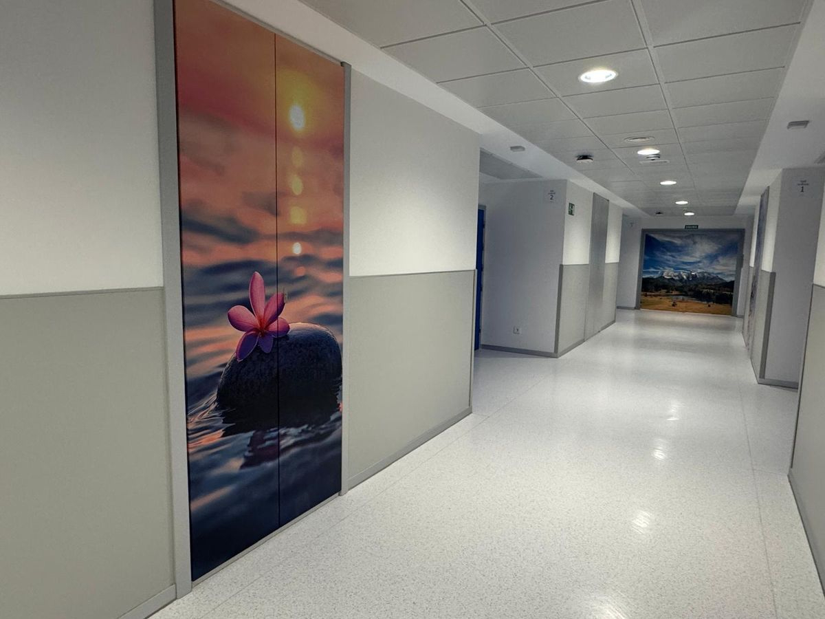 En la planta de hospitalización del servicio de Psiquiatría lo que ha hecho ha sido una dulcificación decorativa del pasillo interno que une las habitaciones de los pacientes hospitalizados y las salas comunes. Se han puesto un total de siete vinilos de gran tamaño: cinco de ellos repartidos por el pasillo, en las puertas de los 2 armarios de mantenimiento; y dos más, de un tamaño mayor, que marcan las dos grandes puertas de acceso a la unidad. Los motivos elegidos en esta ocasión son elementos paisajísticos con el objetivo de acercar, mediante estas imágenes, la naturaleza del exterior a los pacientes hospitalizados.
