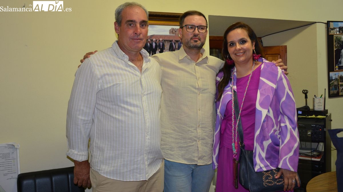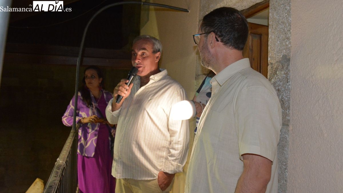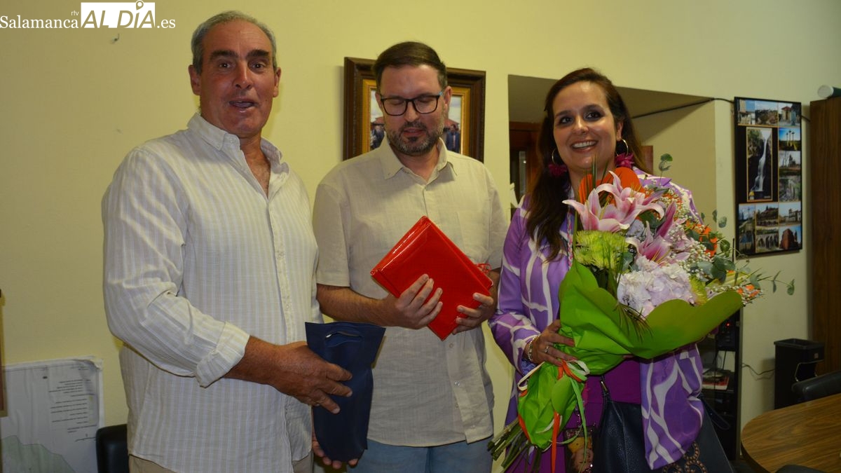 El alcalde, José María González, le hizo entrega al pregonero del libro de Sobradillo y un ramo de flores a su esposa, María Corral.