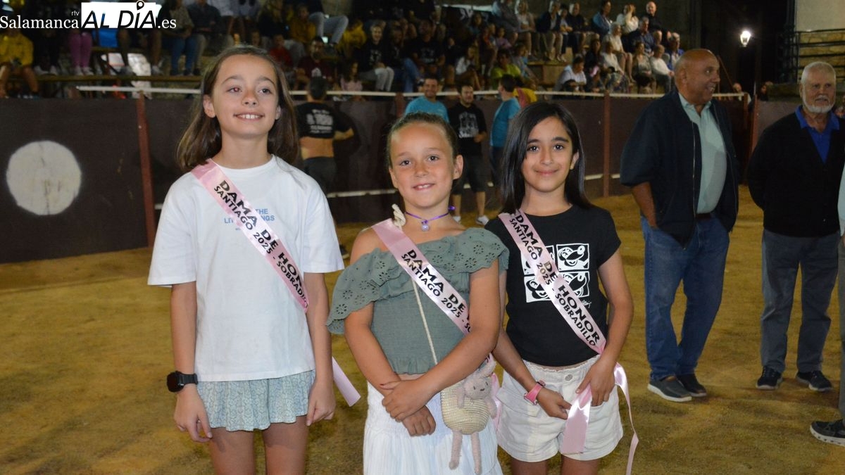 Tras el pregón, se procedió de damas Elección damas, caballeros, Rey y Reina de las Fiestas. Las niñas Alba Becerril Simón, Eva Ruiz Hernández e Isabel Mendez Hernández recibieron sus bandas como Damas Infantiles del 2025.