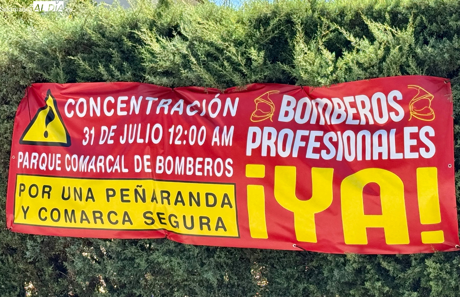 En plena cuenta atrás para la llegada de la manifestación en favor de la llegada de bomberos profesionales al parque de Peñaranda, una gran pancarta ya anuncia la fecha del evento en las inmediaciones del parque peñarandino.