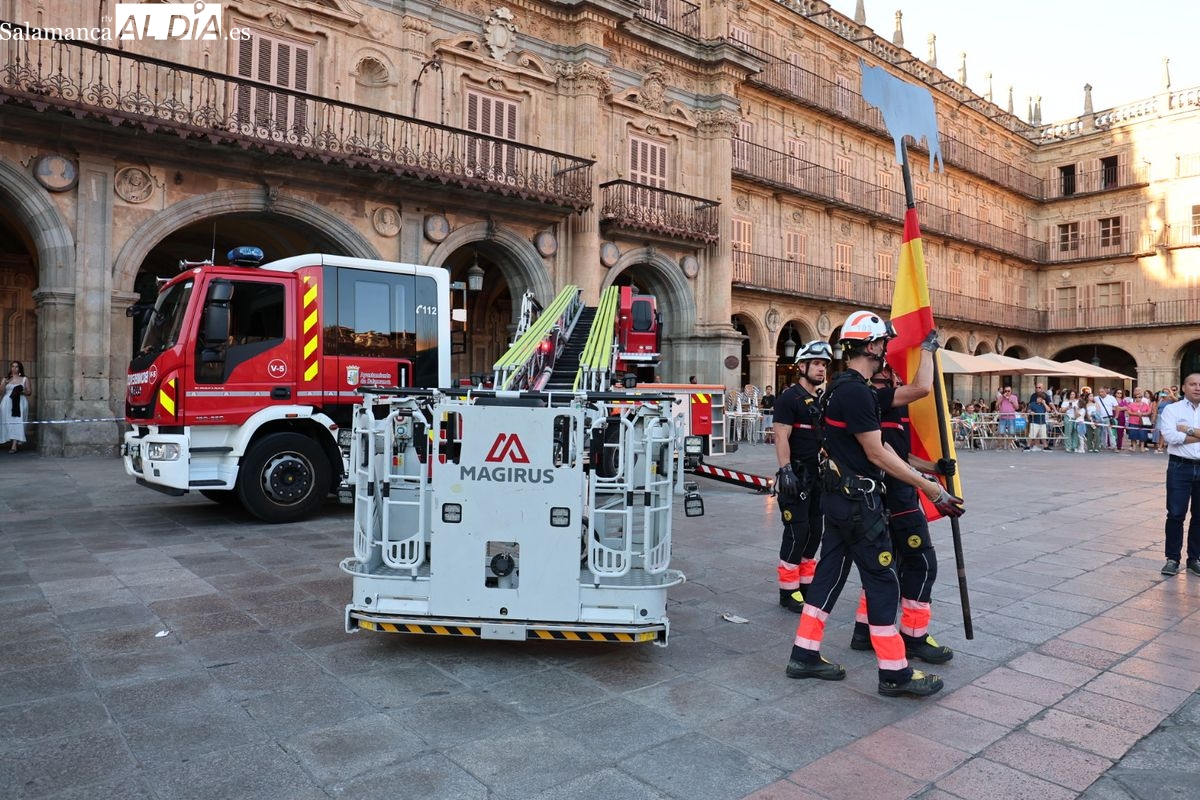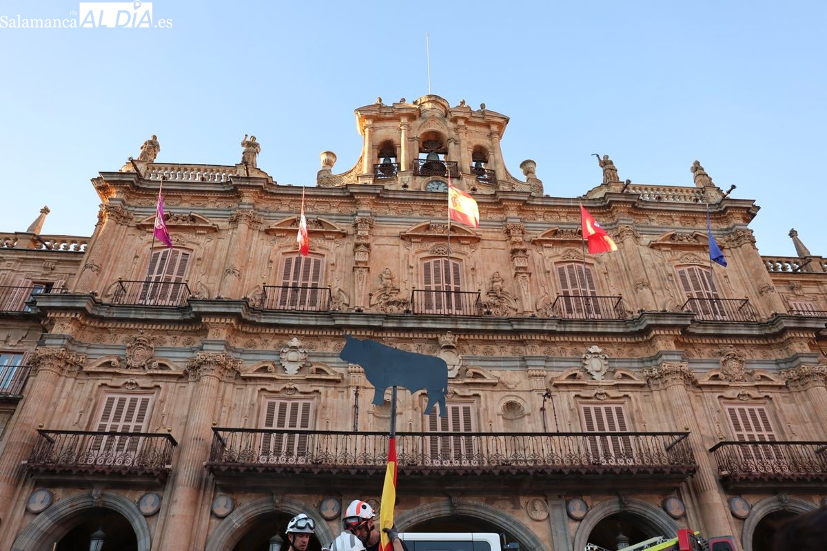 Los bomberos municipales de Salamanca han cumplido este viernes, 25 de julio, con una de las tradiciones más esperadas que marcan el inicio de la cuenta atrás para las celebraciones patronales. Como cada año, han procedido a la colocación de La Mariseca en lo más alto de la espadaña del Ayuntamiento, en una Plaza Mayor que ha sido testigo del simbólico acto.