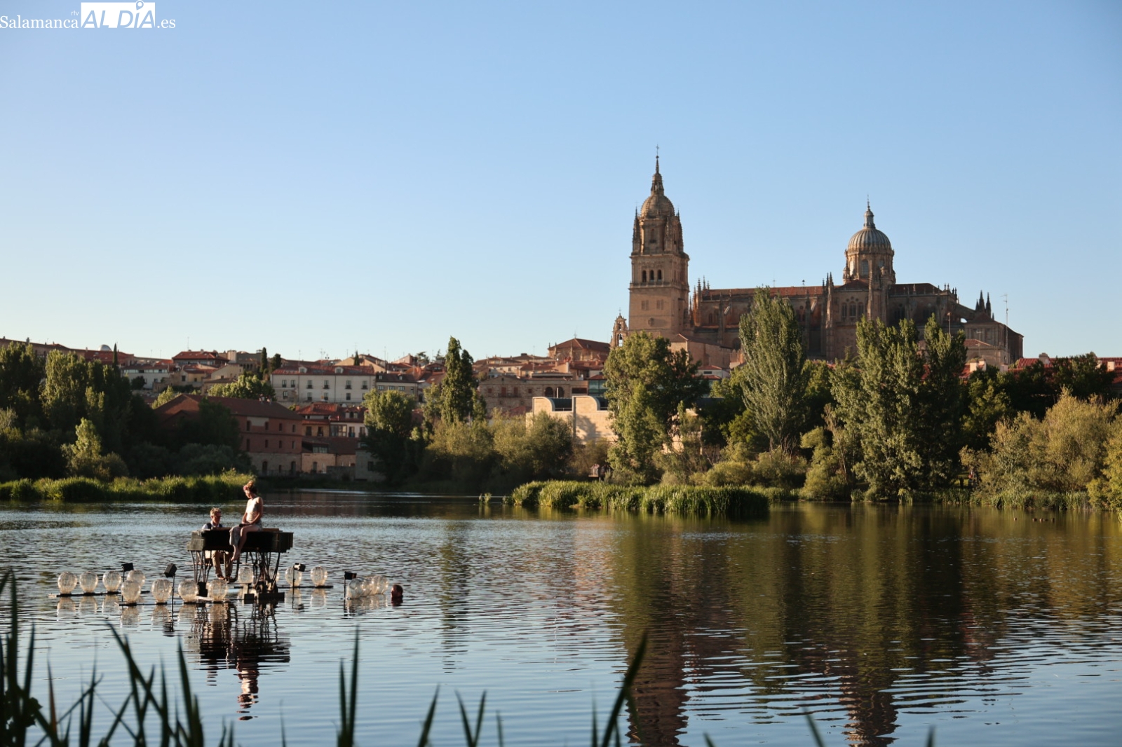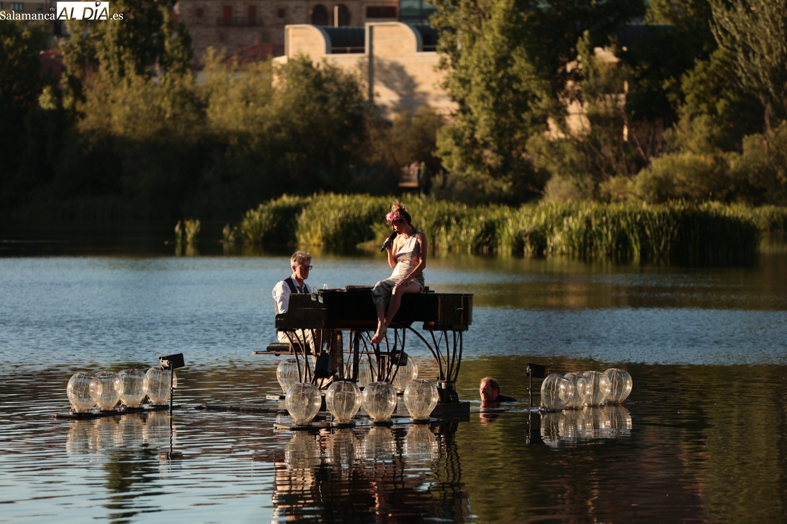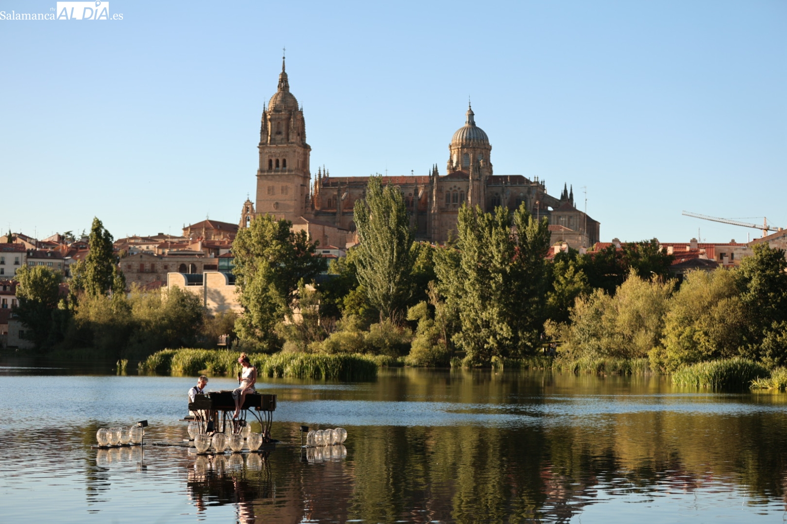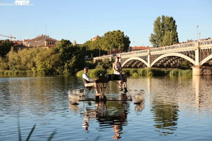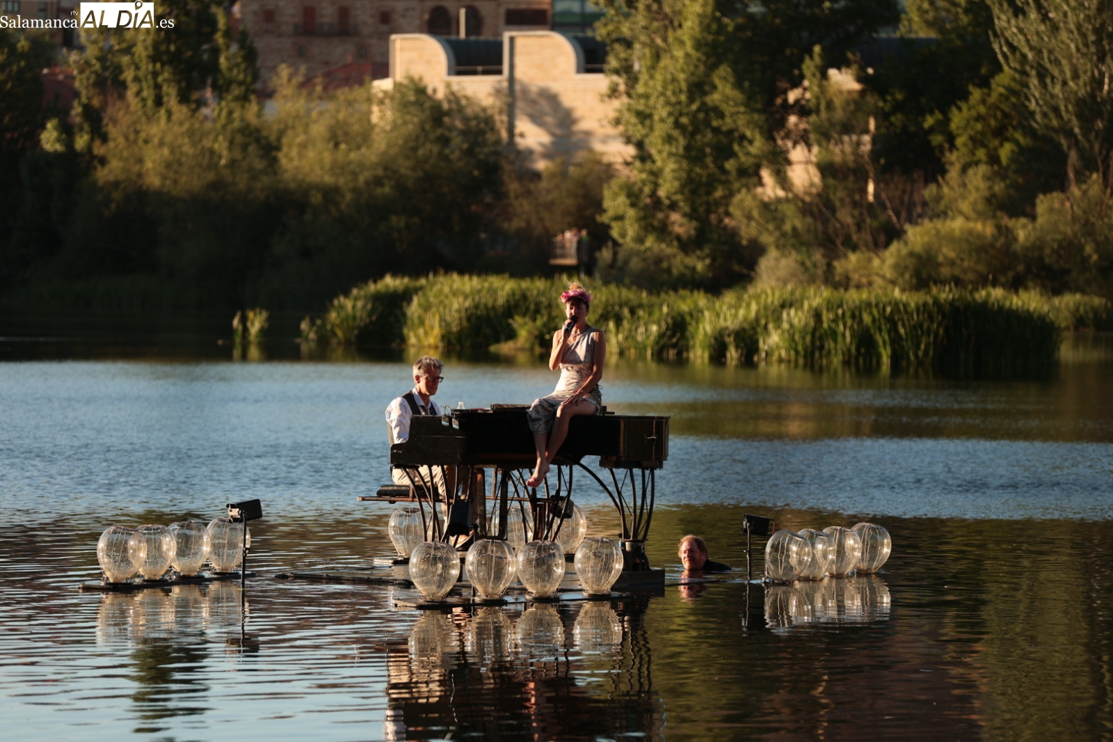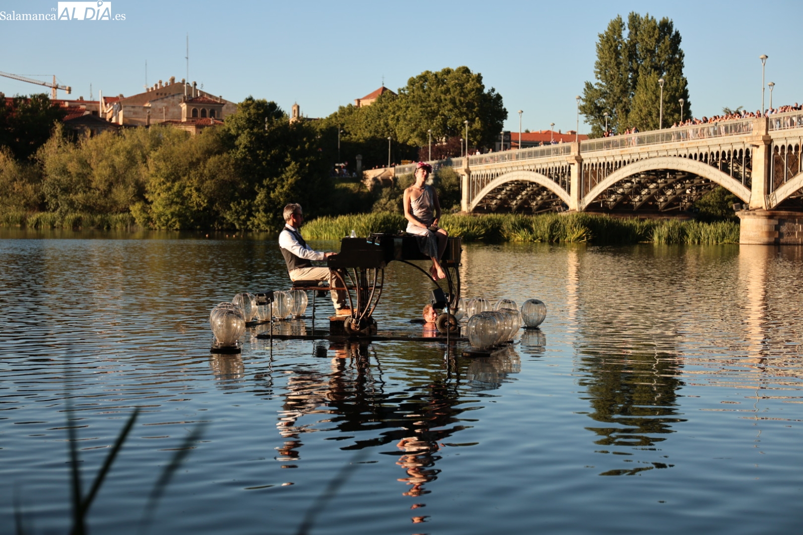 El río Tormes se ha convertido este viernes, 25 de julio, en un escenario mágico con la primera de las dos representaciones del espectáculo ‘Pedalopiano. A fleur d’eau. El Piano Flotante’. Numerosos salmantinos y visitantes se han congregado en las orillas del Paseo del Progreso para presenciar una de las citas de la programación cultural de Salamanca Plazas y Patios.