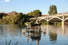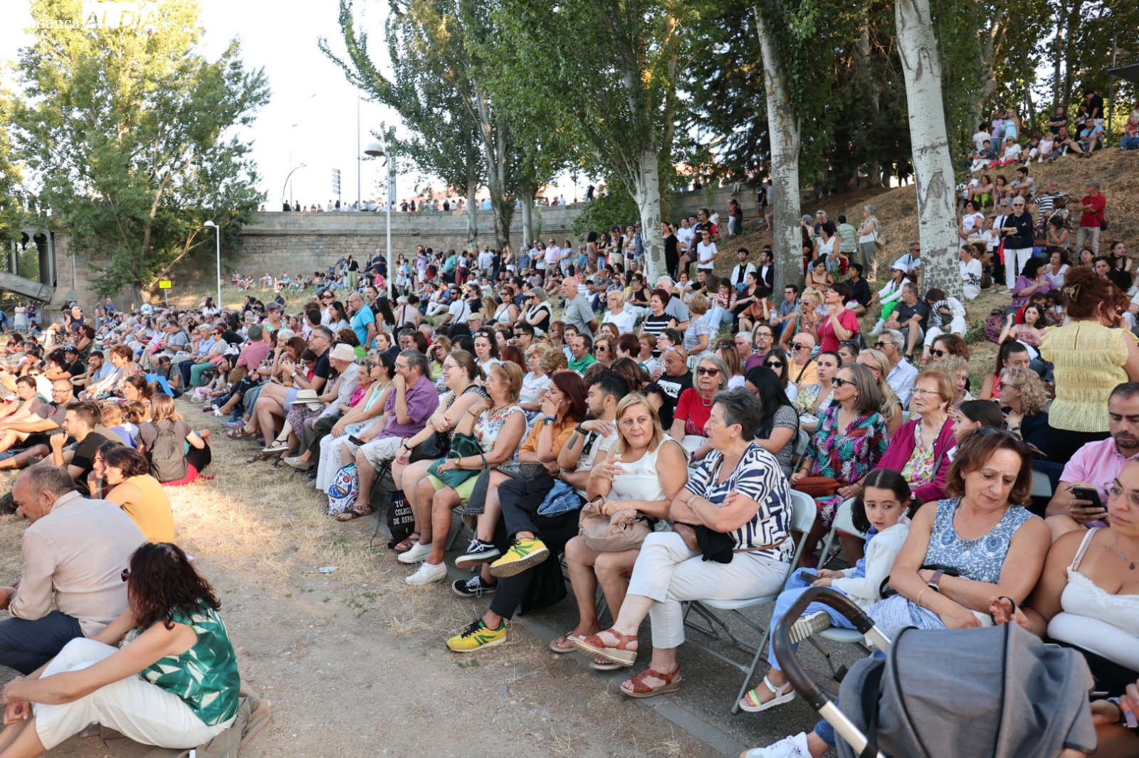 El espectáculo se ha desarrollado directamente sobre las aguas del río, con la imponente silueta de la Iglesia del Arrabal como telón de fondo, creando una estampa inolvidable al atardecer de este viernes.