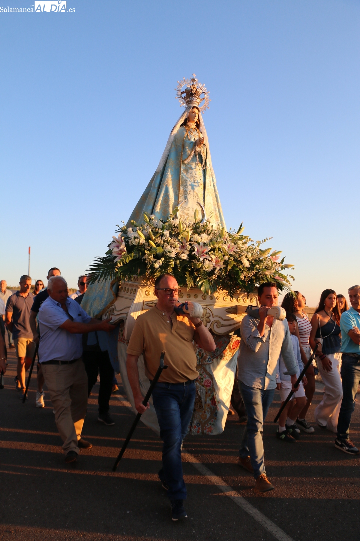 Finalizada la homilía oficiada por los párrocos José Antonio Andújar y Francisco Fraile, Alberto Moro dedicaba unas palabras a la Virgen ante los asistentes que llenaban la ermita, momento que vivió con gran emoción y que finalizaba con tres ¡vivas’ a la Nuestra Señora del Socorro. A continuación, se entonaba la canción dedicada a la Virgen del Socorro, para a continuación salir de su ermita guiada por sus mayordomos, acompañados de sus familiares. Ya en el paseo, el silencio de la tarde únicamente era roto por las oraciones de los fieles y el volteo de las campanas que desde la torre de la iglesia anunciaban la llegada de Virgen.
