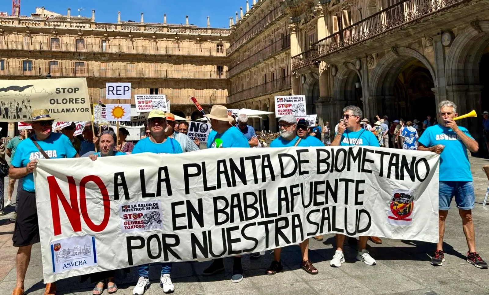 La Plaza Mayor de Salamanca acogía en la mañana de este domingo una nueva manifestación de vecinos de diferentes municipios de la provincia con la que han querido mostrar su rechazo total a la instalación de plantas de biogás en su municipio.