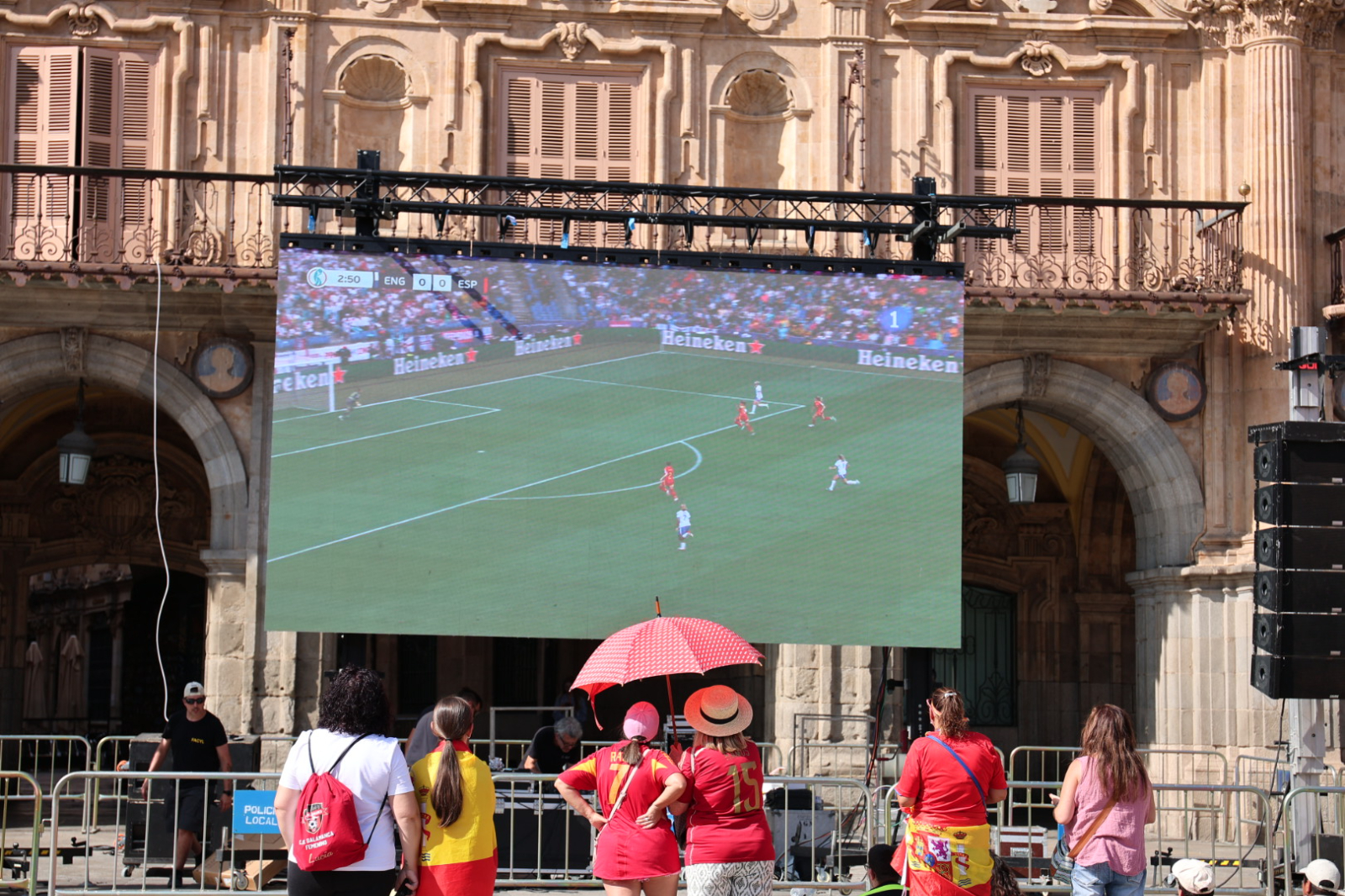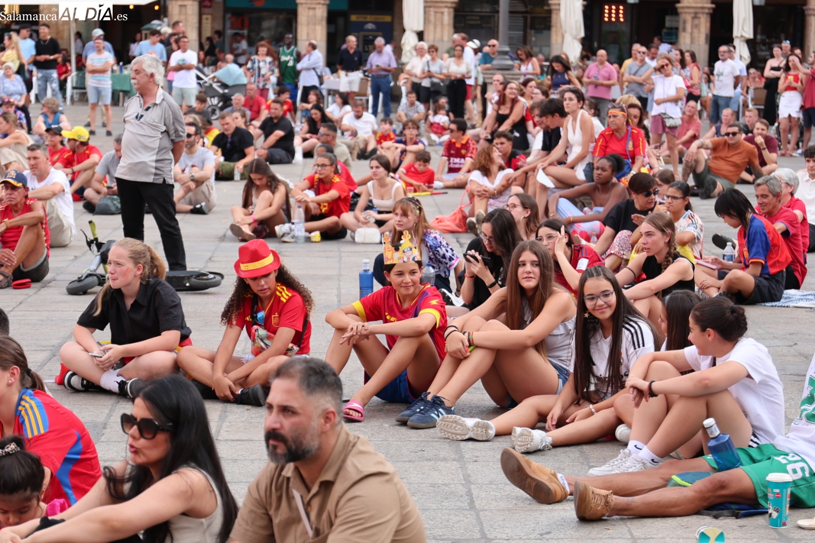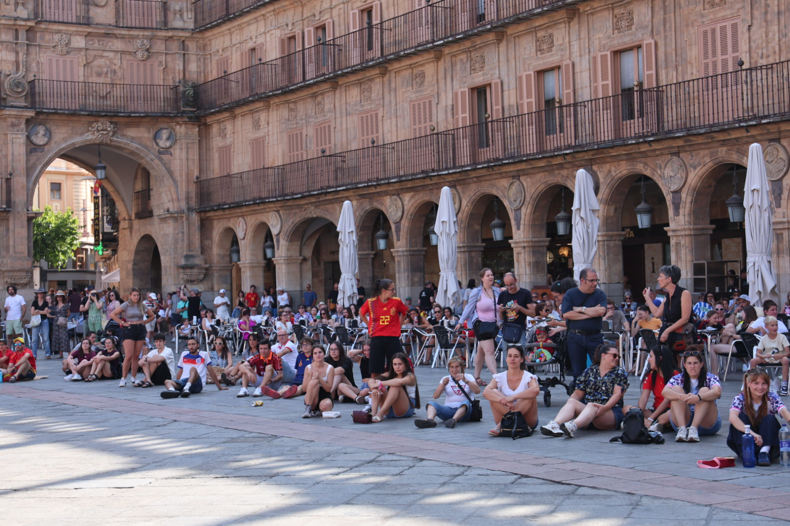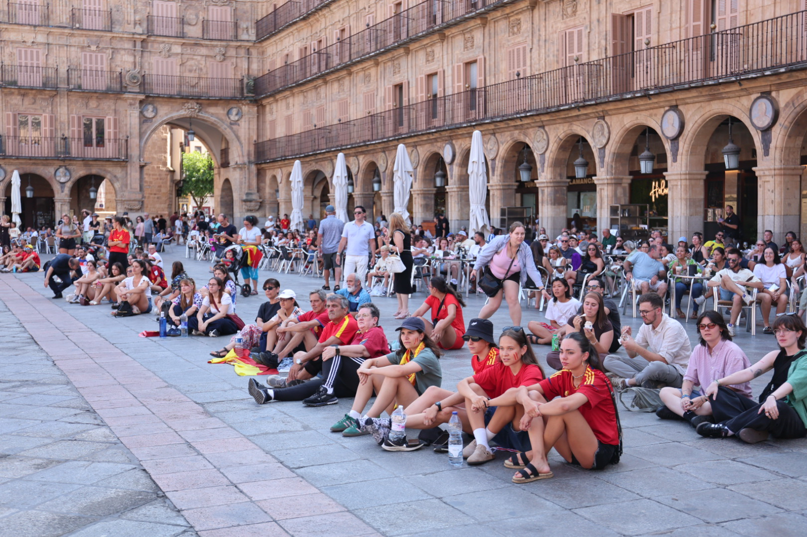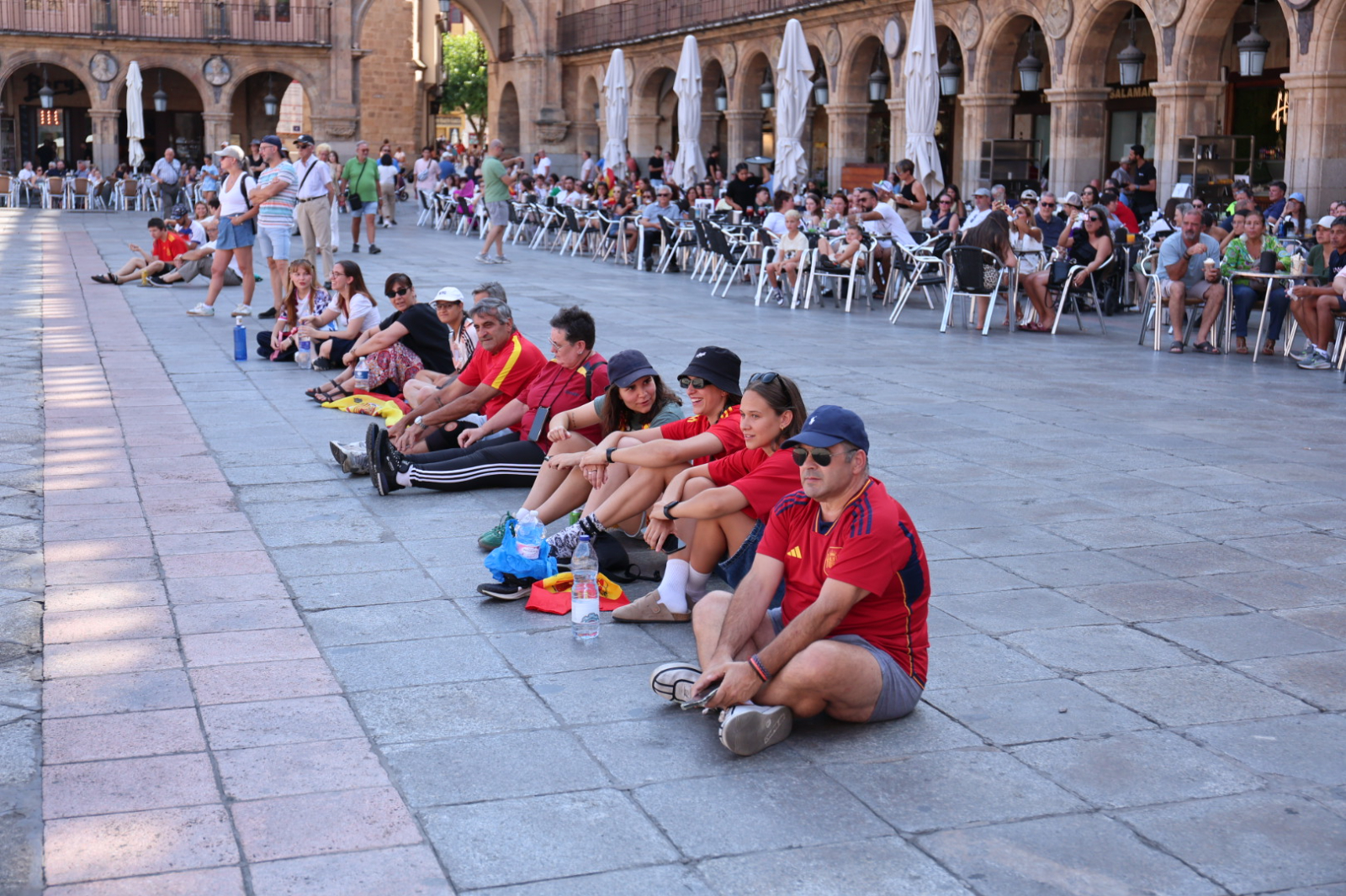 La Plaza Mayor de Salamanca fue punto neurálgico de la concentración de varios aficionados que no dudaron en desafiar al calor y acudir a apoyar de forma conjunta a la Selección Española de Fútbol Femenino en la disputa de la final de la Eurocopa ante Inglaterra, que cayó del lado británico (2-1) en la tanda de penaltis.
