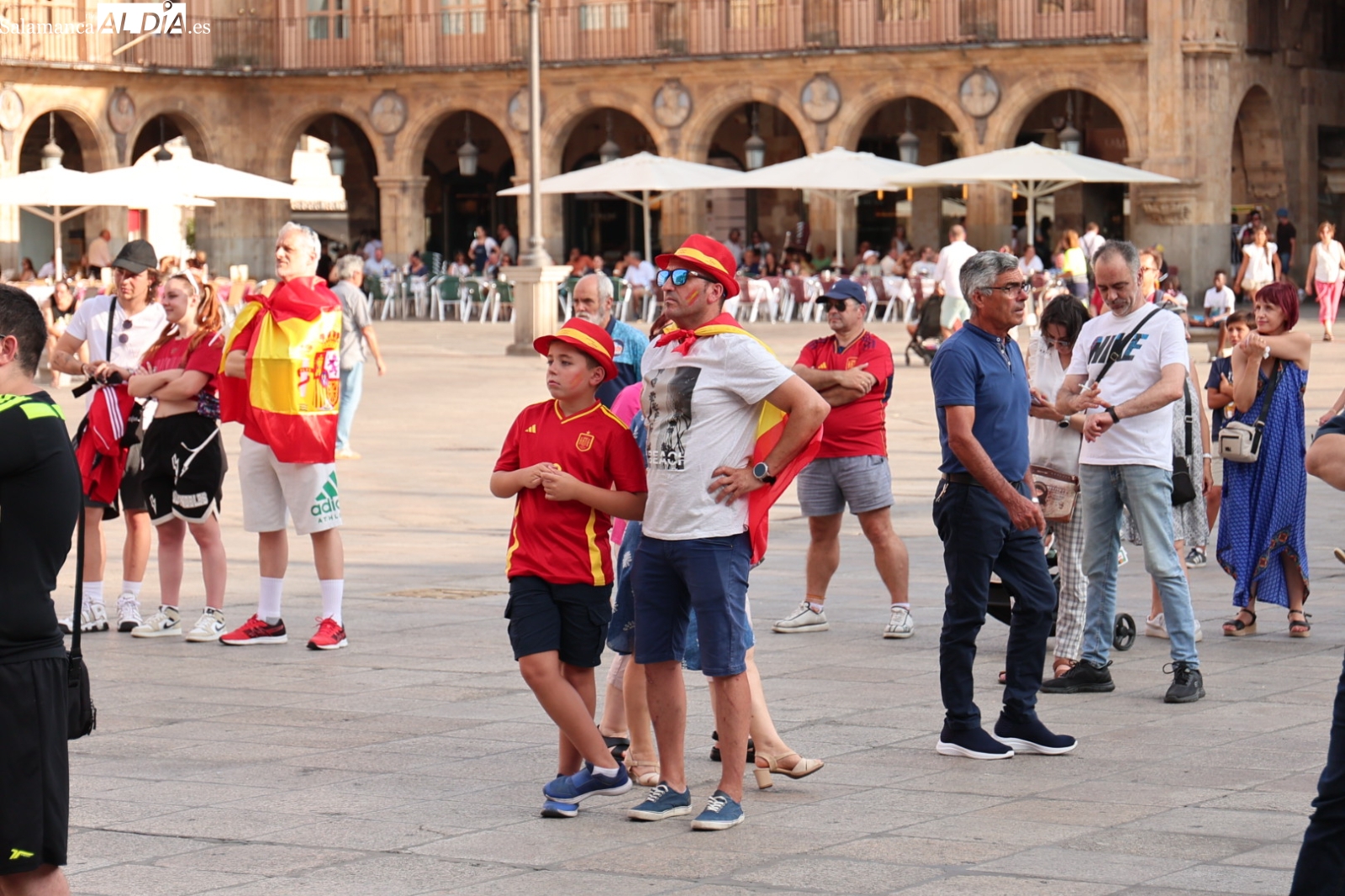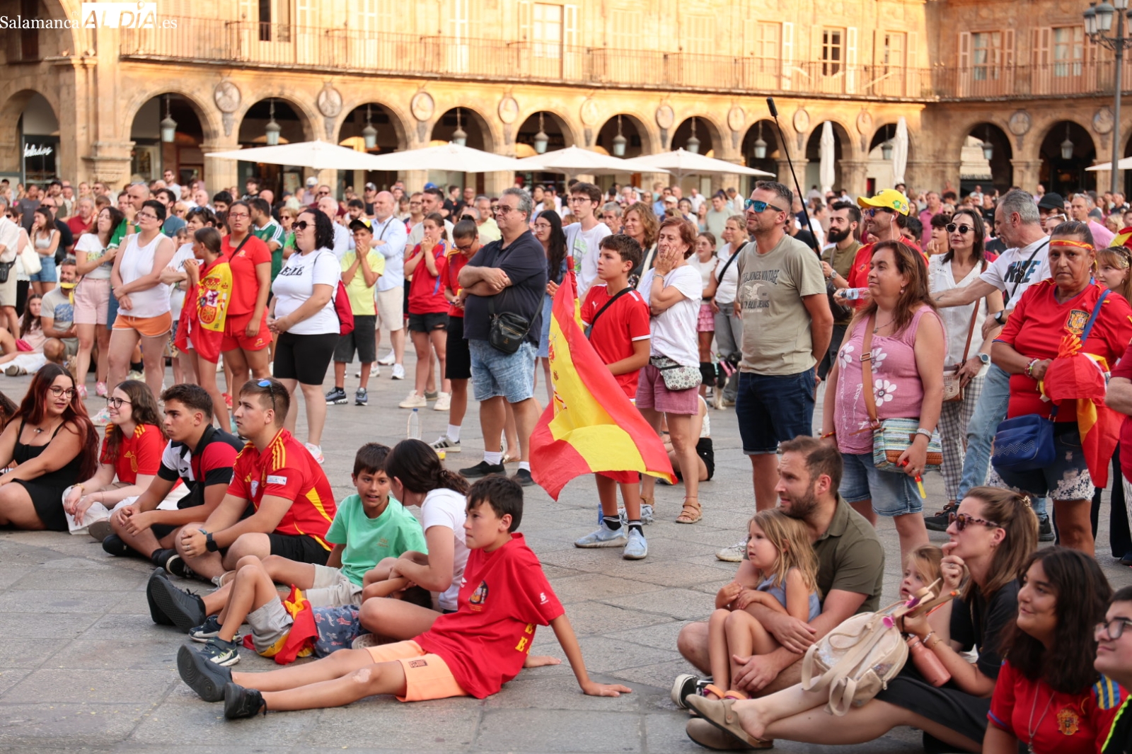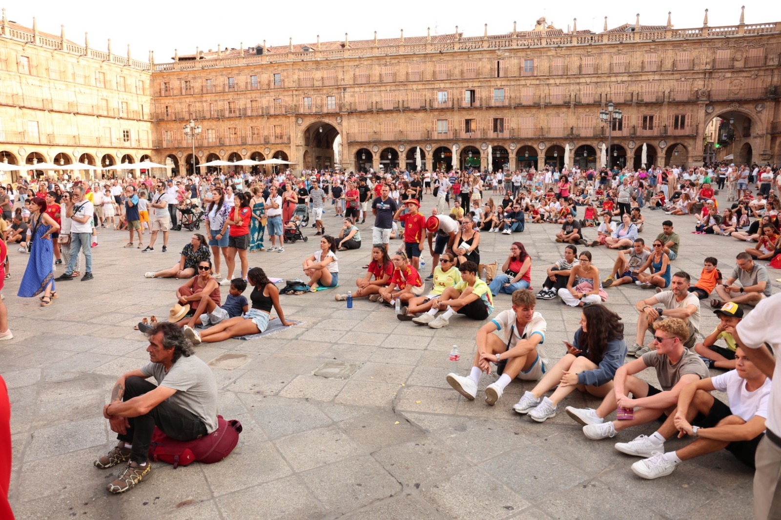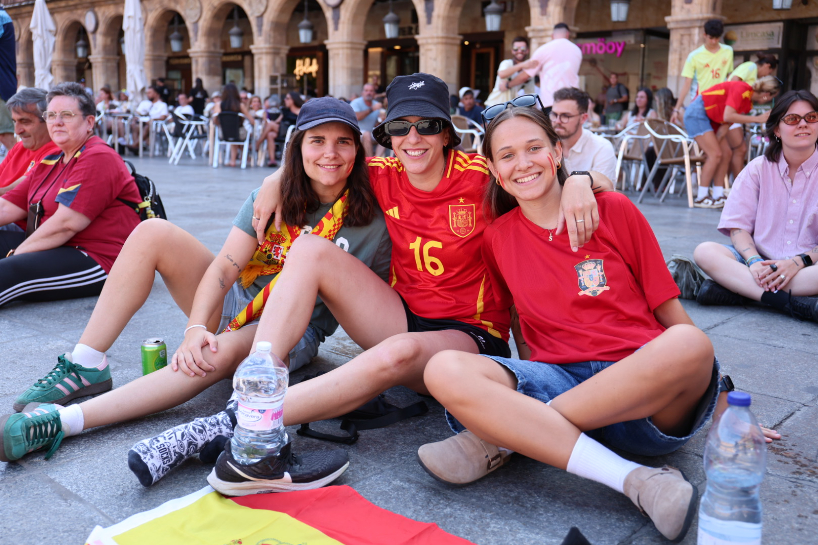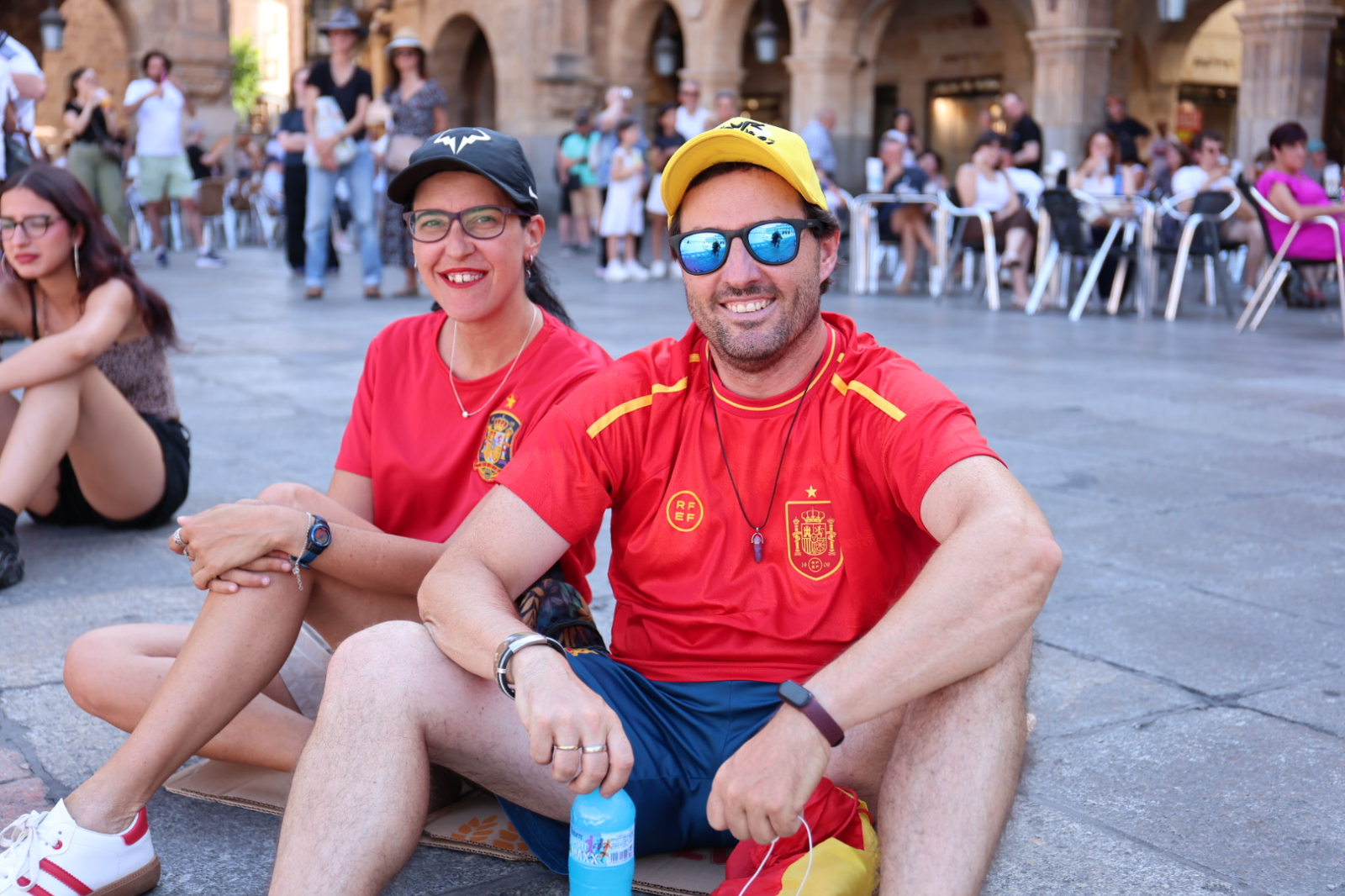 La Plaza Mayor de Salamanca fue punto neurálgico de la concentración de varios aficionados que no dudaron en desafiar al calor y acudir a apoyar de forma conjunta a la Selección Española de Fútbol Femenino en la disputa de la final de la Eurocopa ante Inglaterra, que cayó del lado británico (2-1) en la tanda de penaltis.