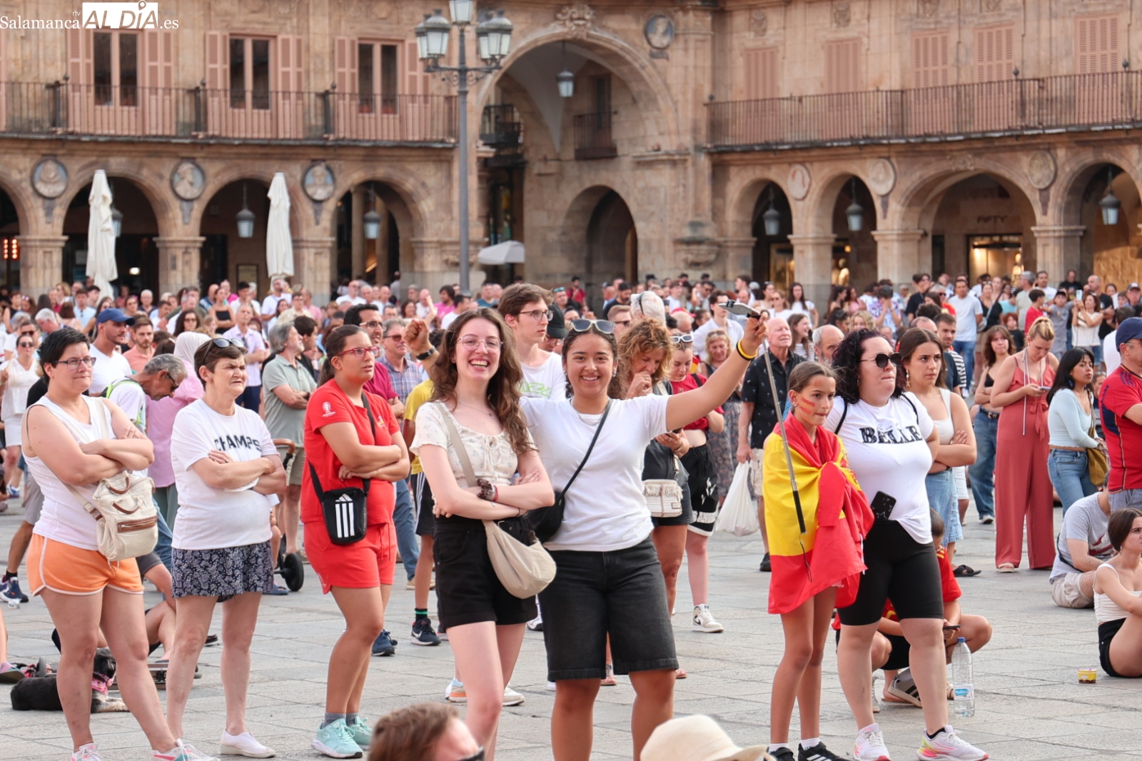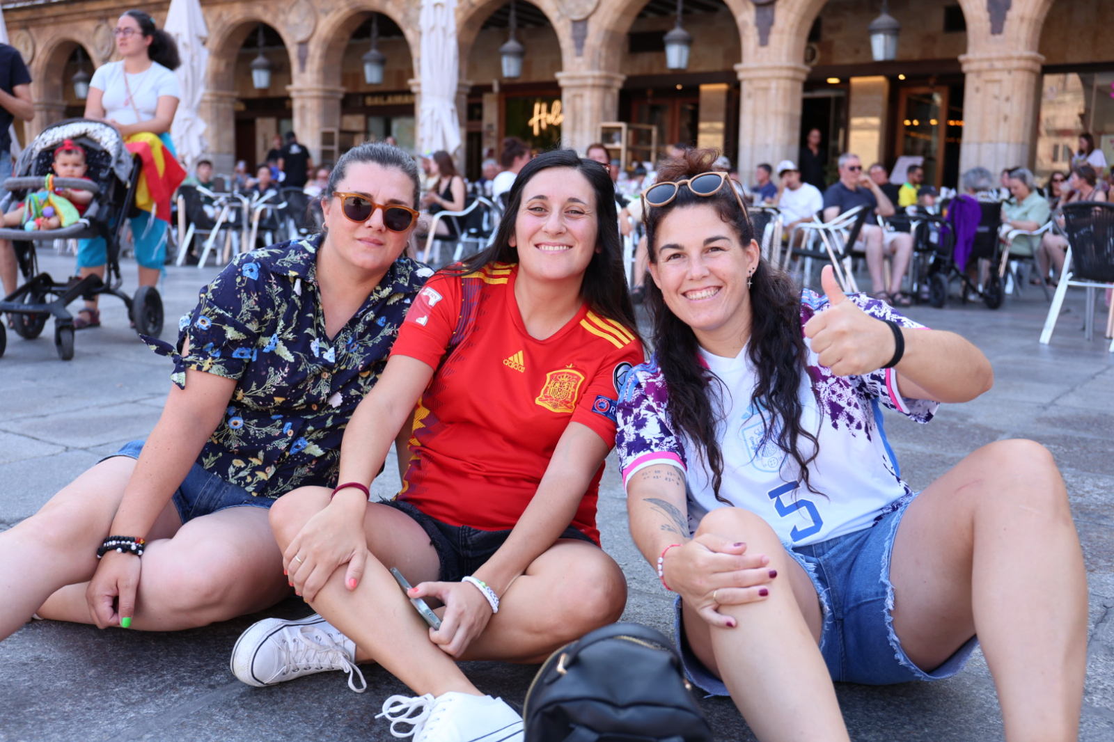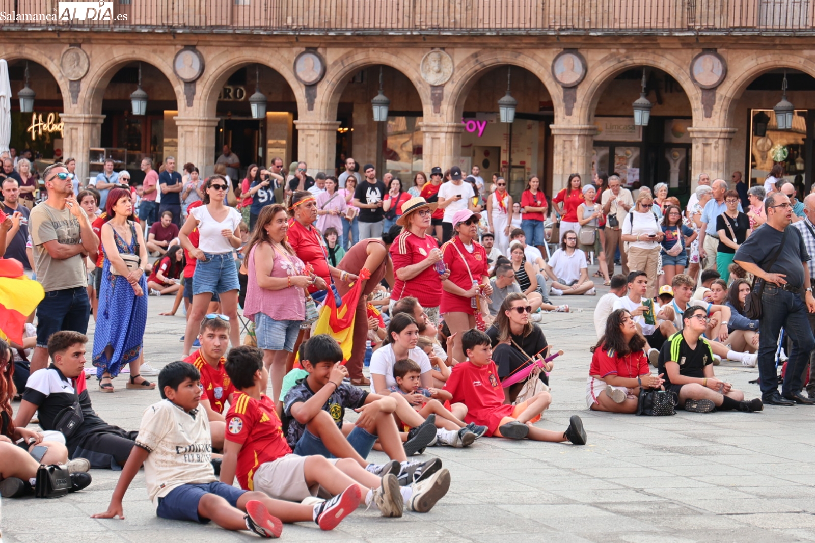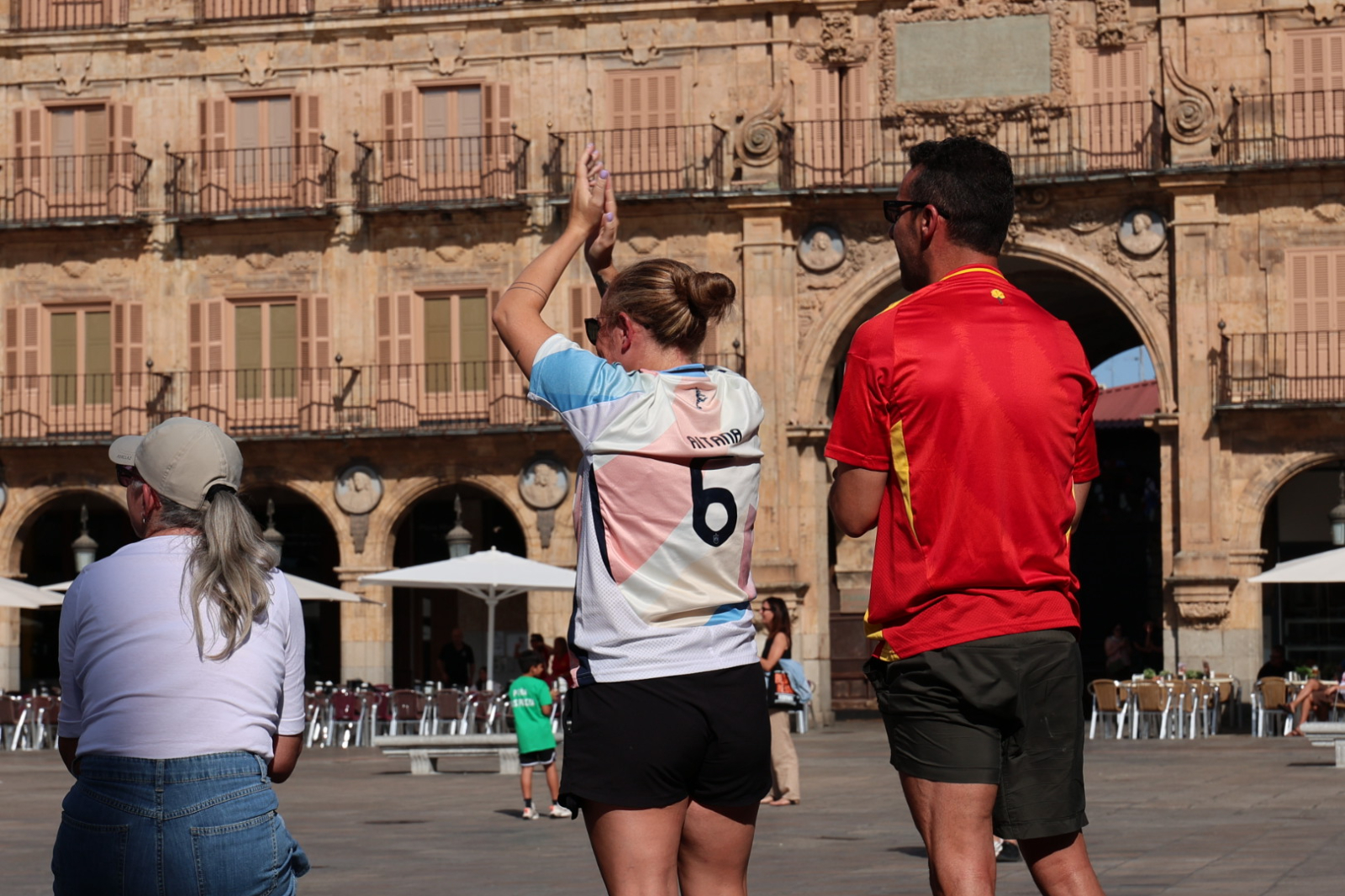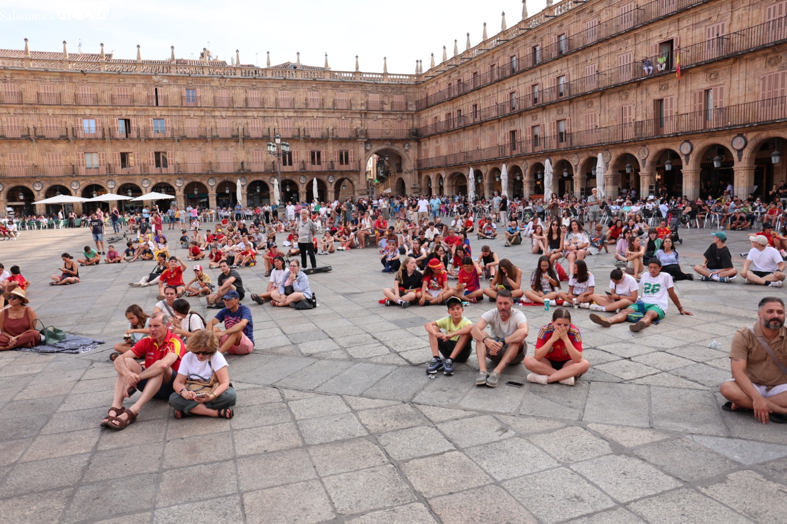La Plaza Mayor de Salamanca fue punto neurálgico de la concentración de varios aficionados que no dudaron en desafiar al calor y acudir a apoyar de forma conjunta a la Selección Española de Fútbol Femenino en la disputa de la final de la Eurocopa ante Inglaterra, que cayó del lado británico (2-1) en la tanda de penaltis.