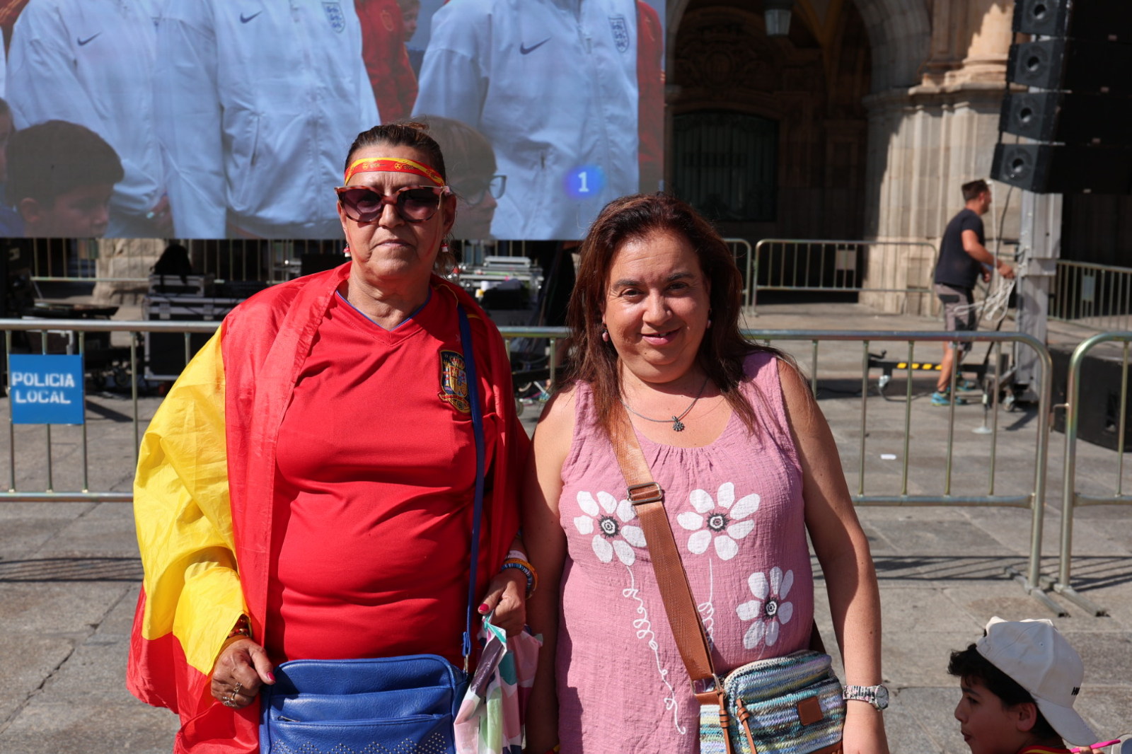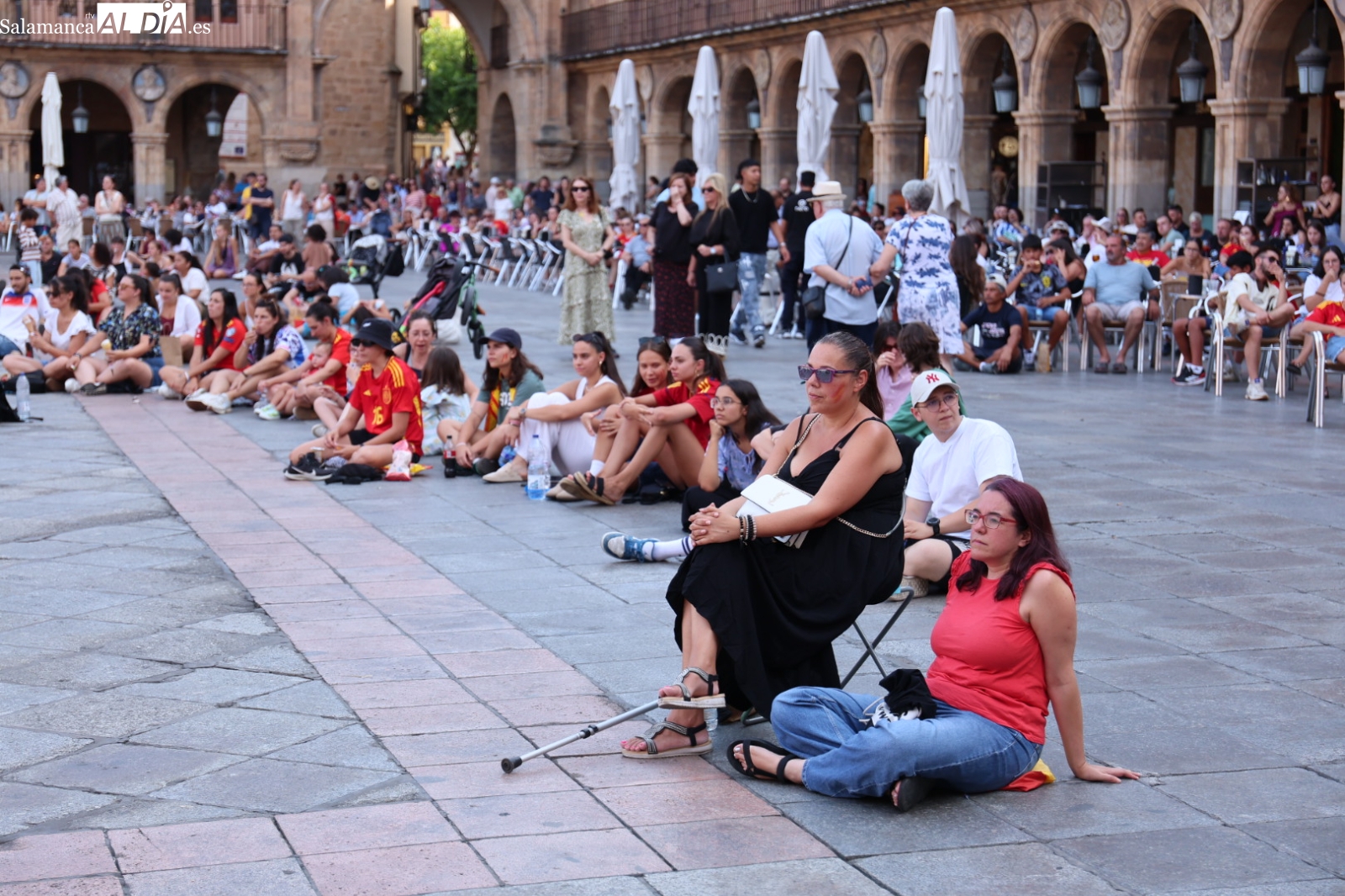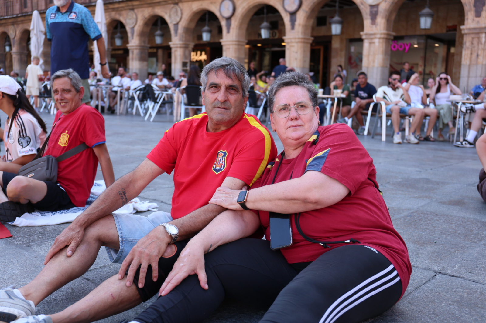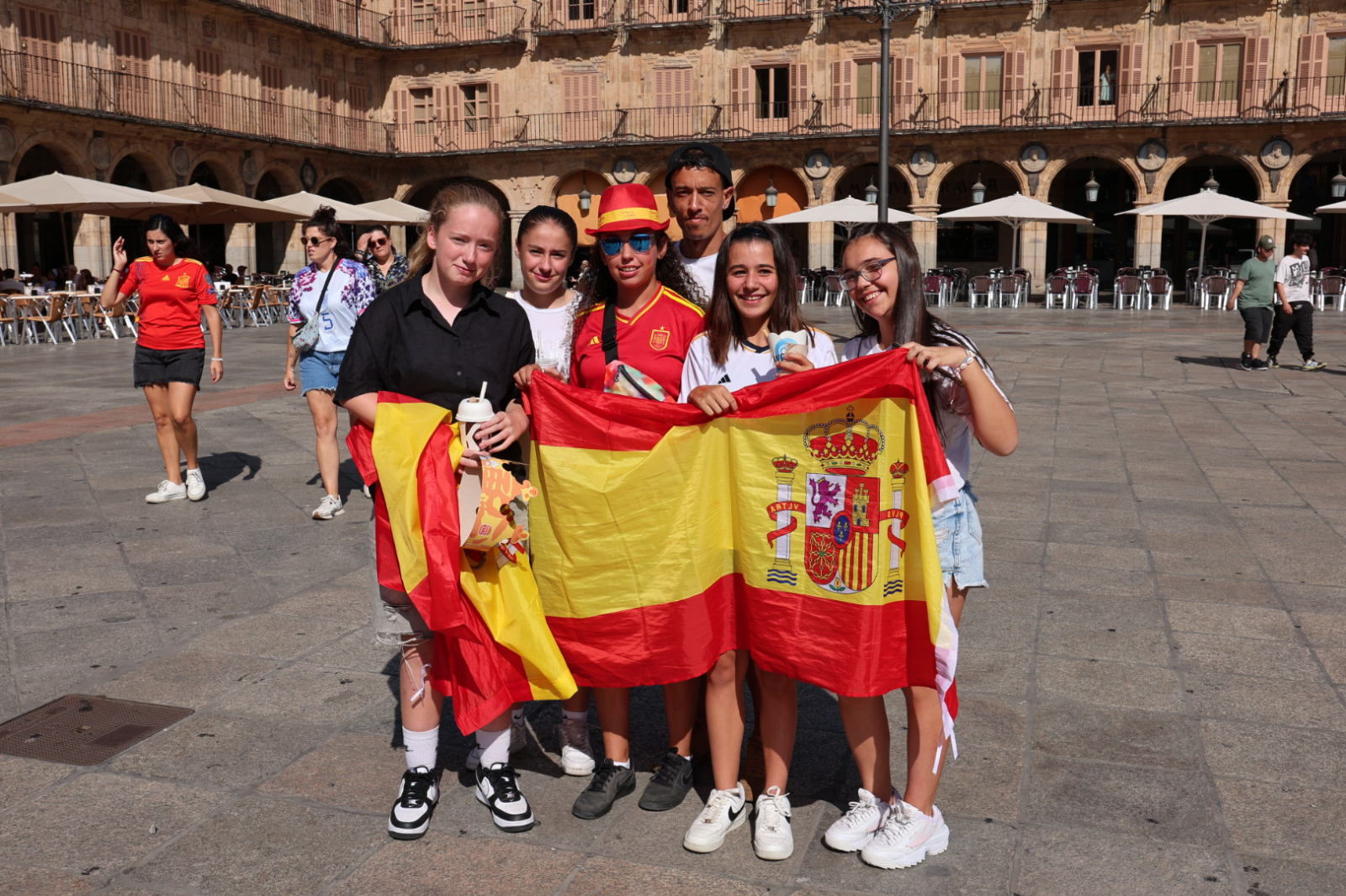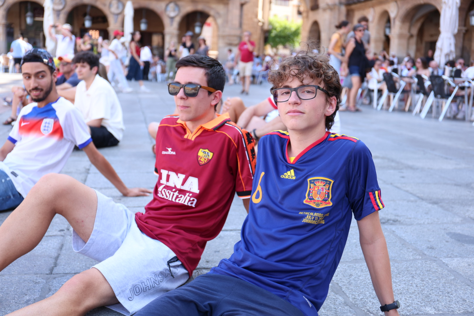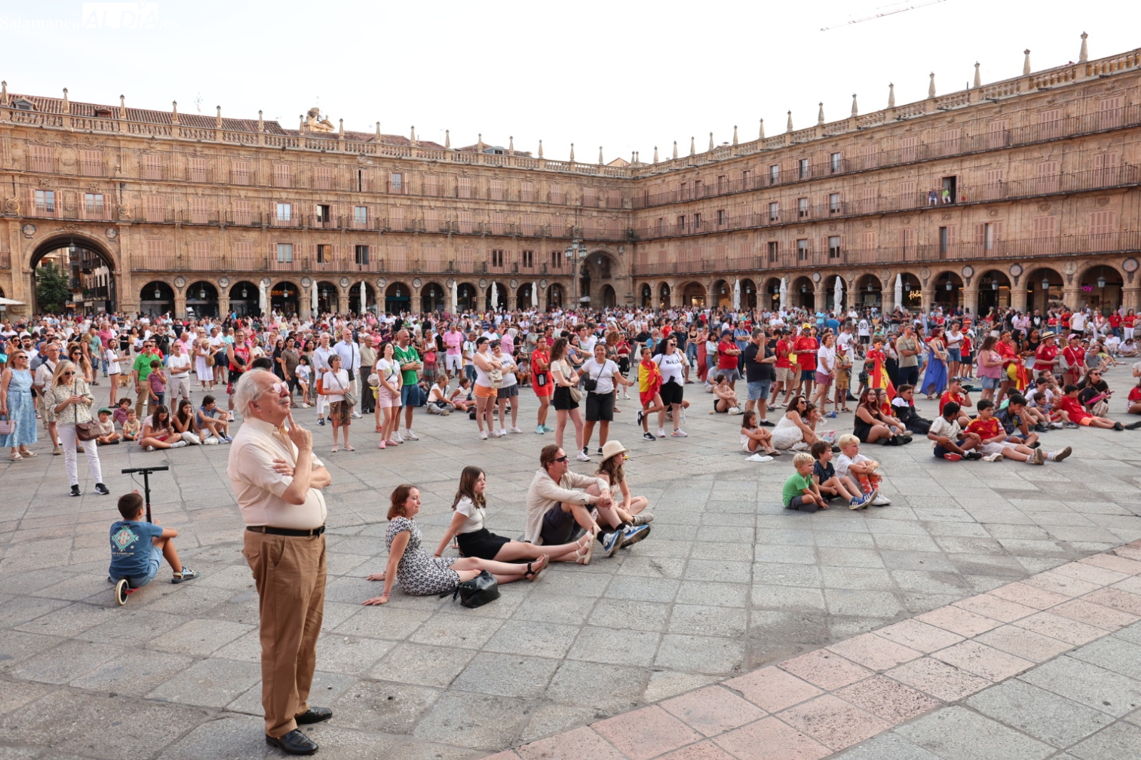 La Plaza Mayor de Salamanca fue punto neurálgico de la concentración de varios aficionados que no dudaron en desafiar al calor y acudir a apoyar de forma conjunta a la Selección Española de Fútbol Femenino en la disputa de la final de la Eurocopa ante Inglaterra, que cayó del lado británico (2-1) en la tanda de penaltis.