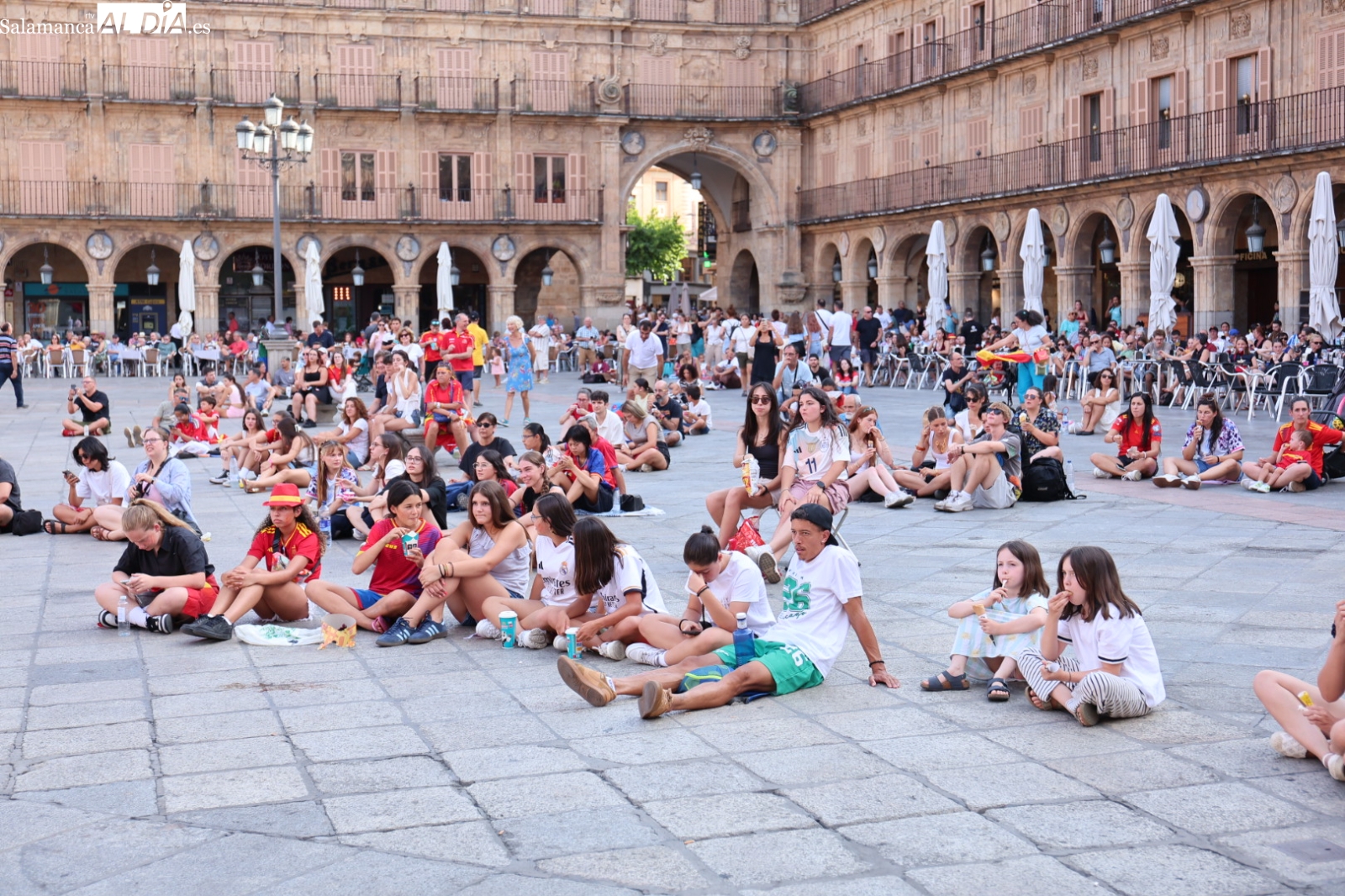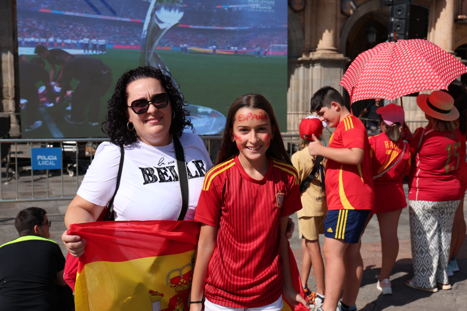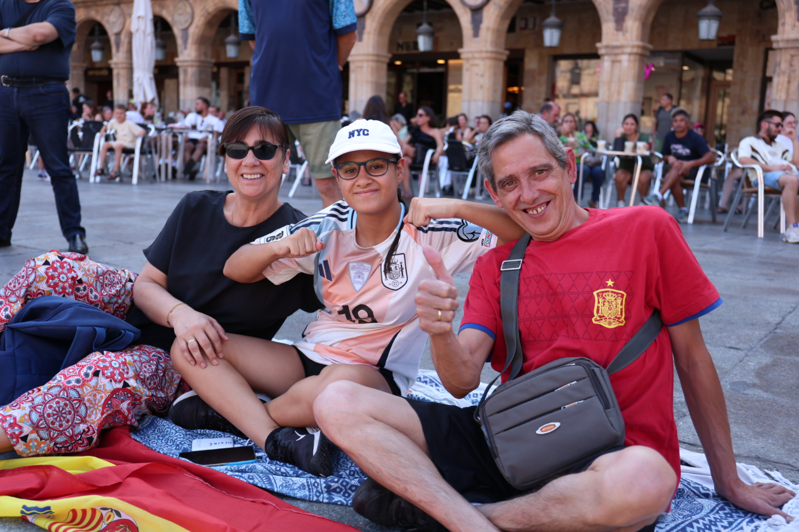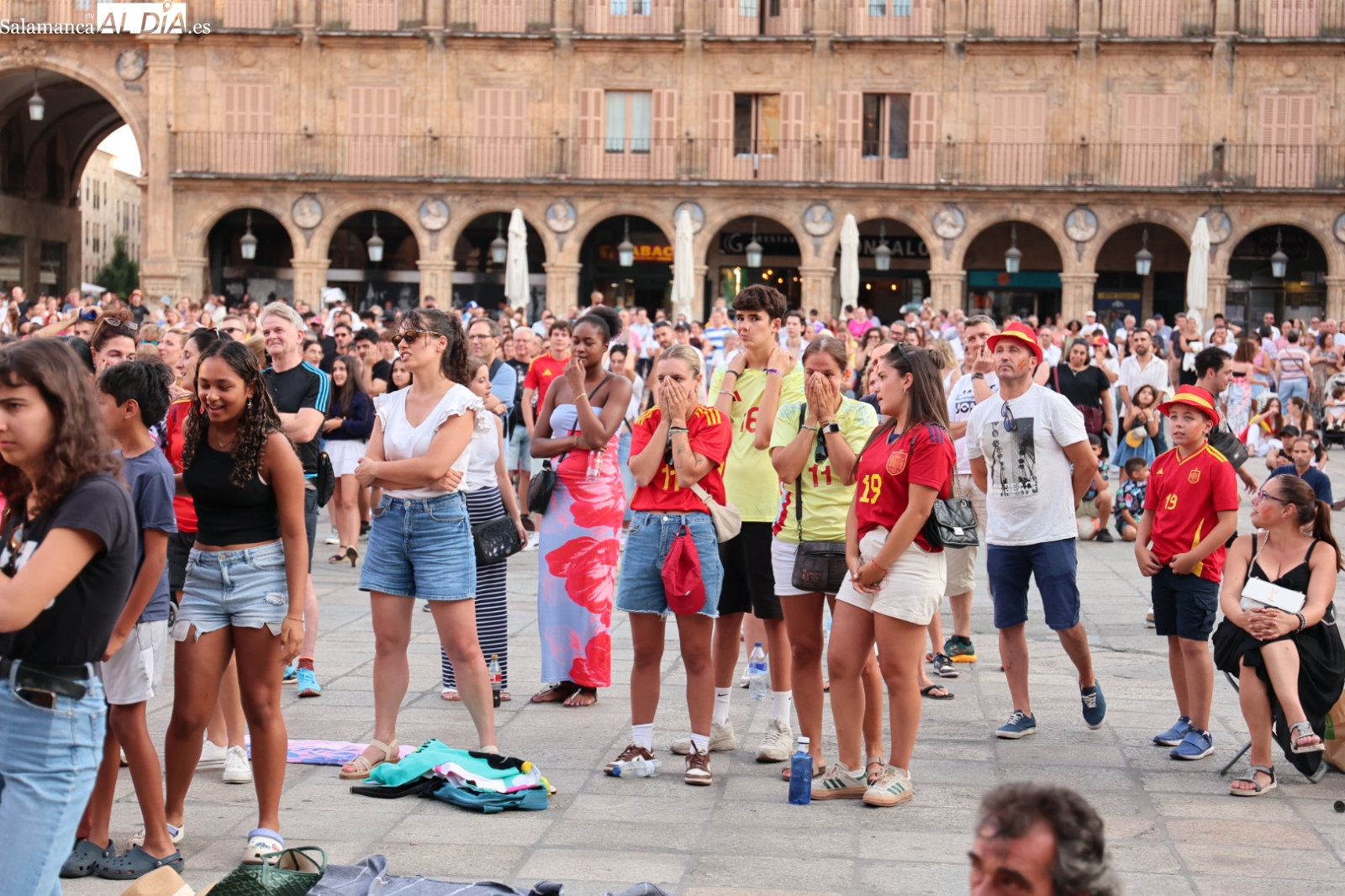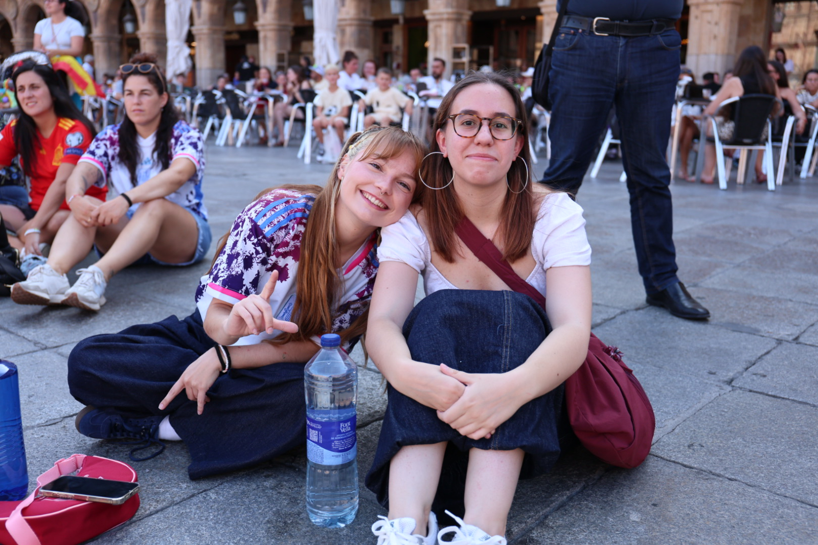 La Plaza Mayor de Salamanca fue punto neurálgico de la concentración de varios aficionados que no dudaron en desafiar al calor y acudir a apoyar de forma conjunta a la Selección Española de Fútbol Femenino en la disputa de la final de la Eurocopa ante Inglaterra, que cayó del lado británico (2-1) en la tanda de penaltis.